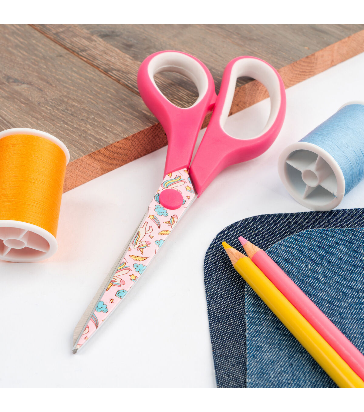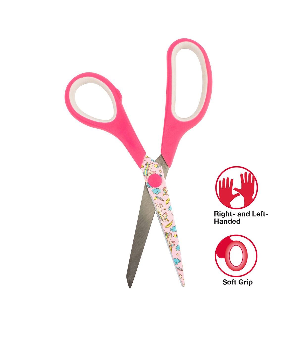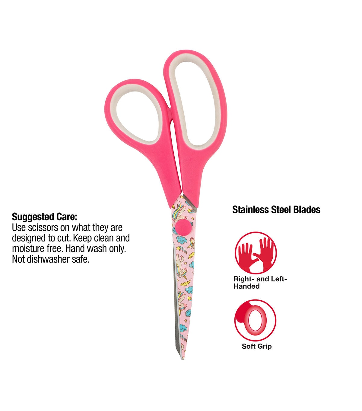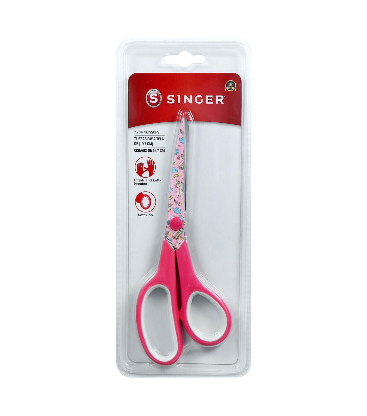 SINGER All-Purpose Scissors are the perfect cutting tool for simple sewing and mending projects, but they can also be used for a variety of everyday cutting tasks from the home office to the arts and crafts room. Measuring 7.75 inches in length, these versatile, multi-use scissors can be handled by both right-handed and left-handed adult users. They feature sharp, stainless steel blades that are non-stick for easy cutting of fabrics, paper, felt, poster board, and more. The blades are printed with a whimsical design of colorful unicorns, rainbows, and shooting stars. The soft, rubberized handle provides a comfortable grip, and the handle’s bright magenta and white color scheme matches the blades’ cheerful unicorn print. Warning: Not to be used in contact with food. This product has sharp blades. Keep away from children. Not dishwasher safe. Hand wash only. For best performance, keep scissors clean and moisture free.
