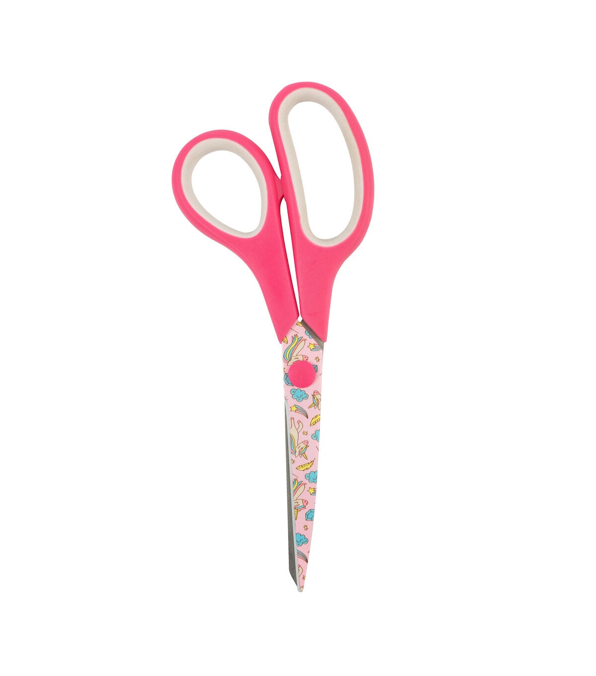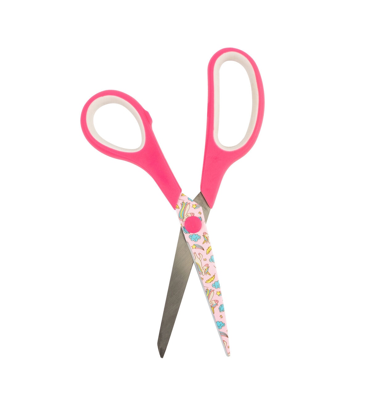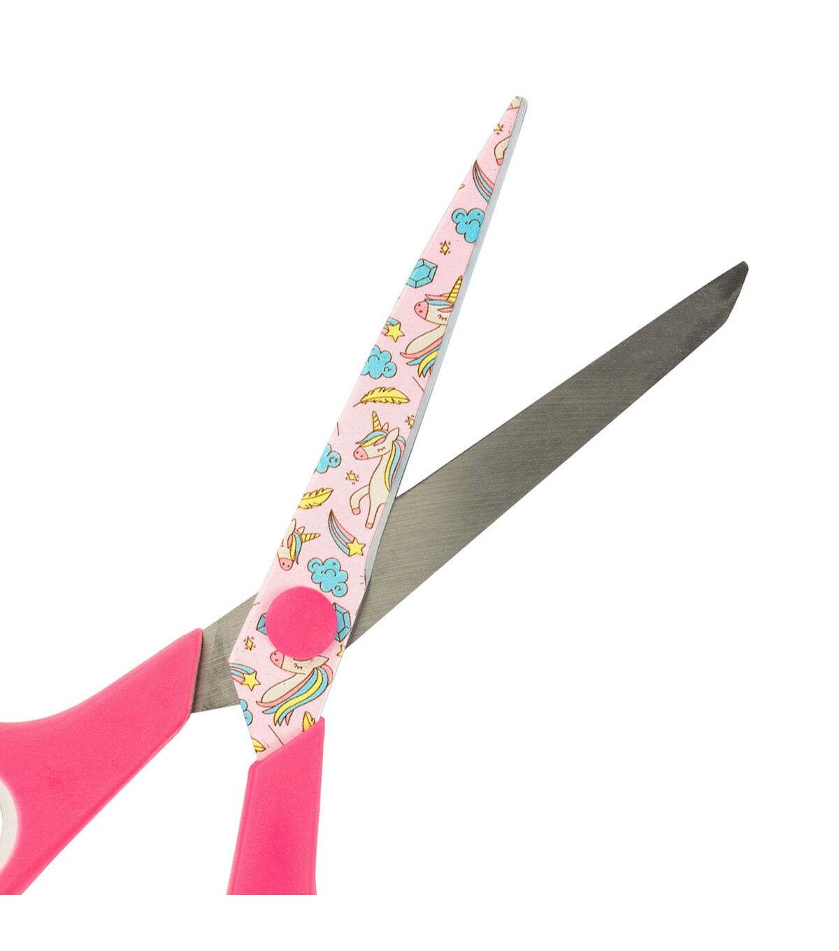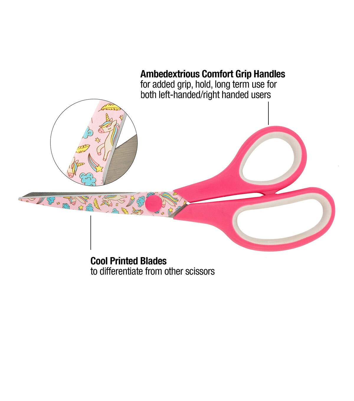 - Blades are printed with a fun design of unicorns and rainbows, with a matching solid pink handle