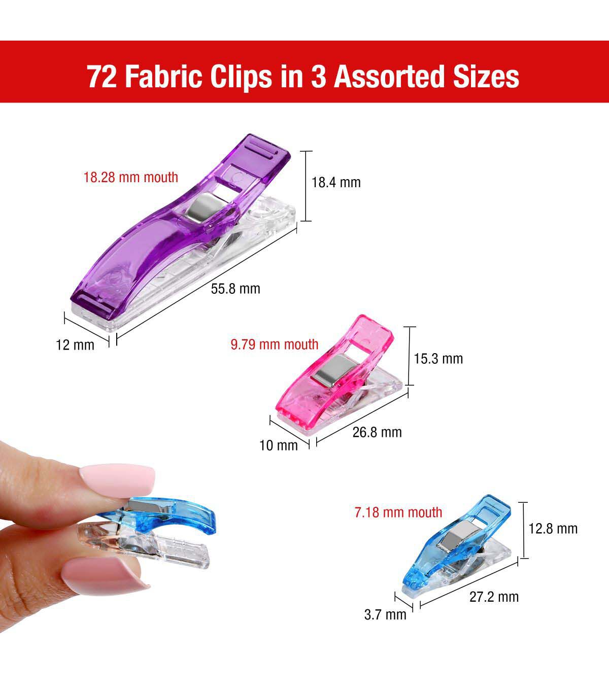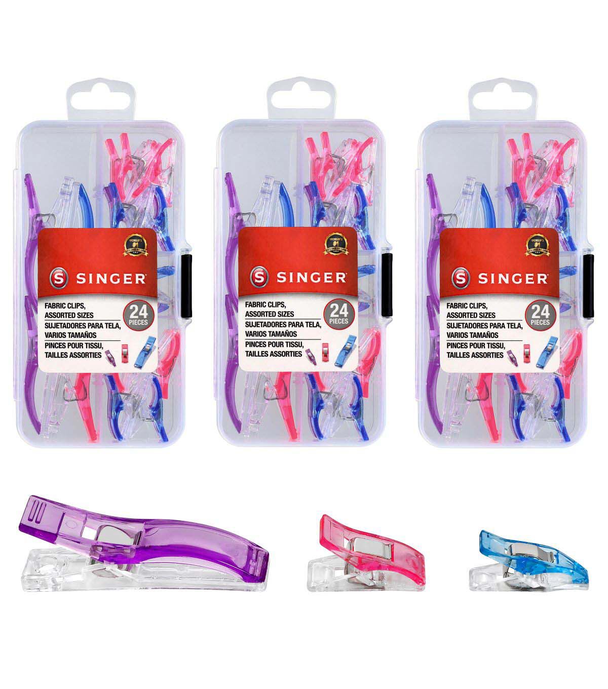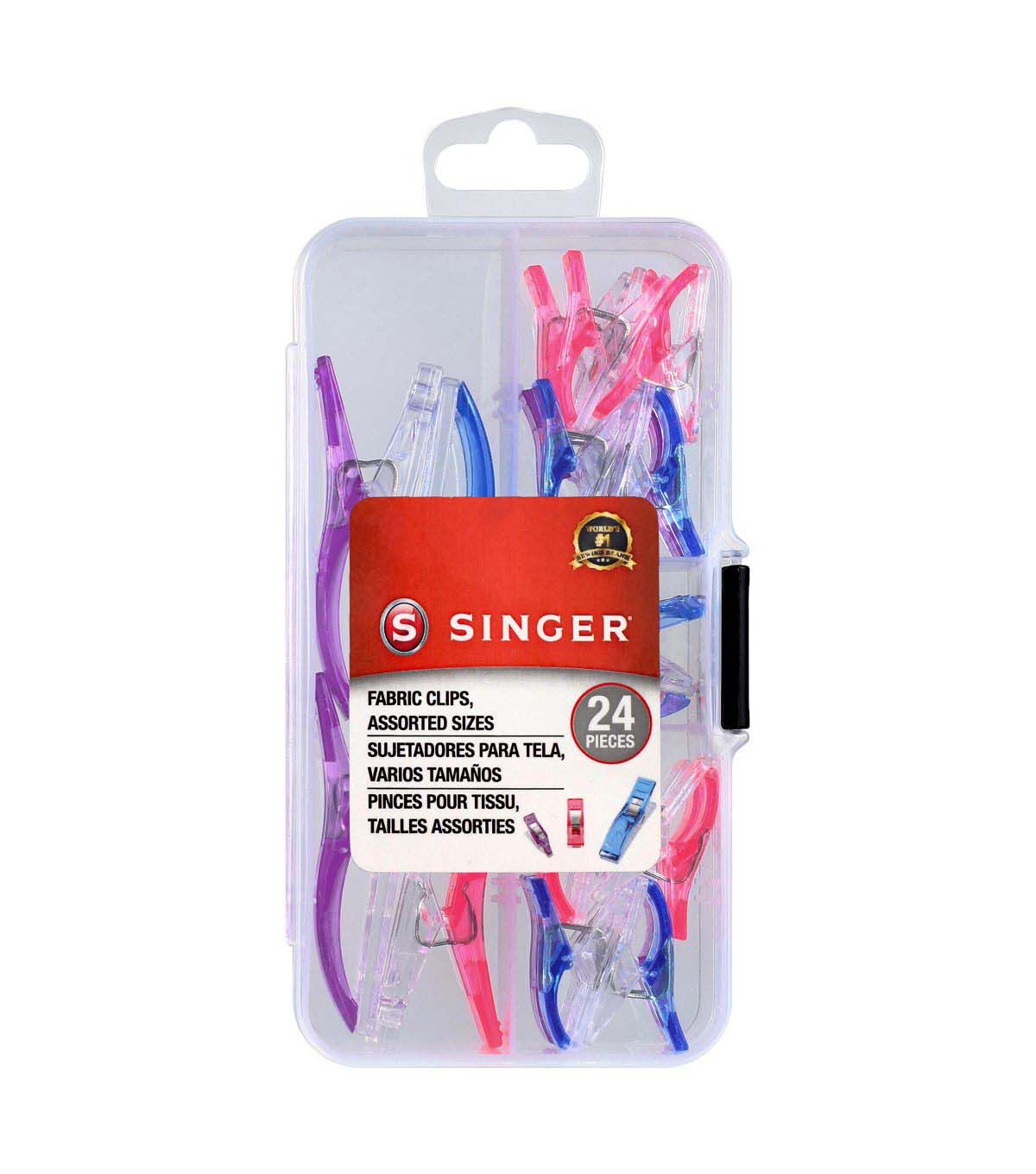 Meet your go-to sewing tool, the SINGER® 72-count Fabric Clips. This versatile set is tailored to suit any project, offering (12) large clips, (48) small clips, and (12) mini clips. Housed in a handy plastic storage case, these clamps are ideal for taking on-the-go, or for organized storage of your sewing essentials at home. Each clip is ergonomically designed for easy grip and reliable hold, making pinholes a thing of the past. Whether you're maneuvering multiple fabric layers through your sewing machine or aligning your quilting pieces, these clips ensure your project remains stable and precisely aligned. The vibrant colors—blue, pink, and purple—make these clips easy to spot when you need them, ensuring that you'll never lose sight of your essential sewing tools. For optimal precision, the large clips come with guide scales of 0.1875in, 0.25in, 0.375in, 0.5625in, 0.75in, and 1.0in, while the small clips feature 0.1875in, and 0.25in guides. Achieving impeccable seams and hems has never been easier: just clip, sew, and marvel at the results.