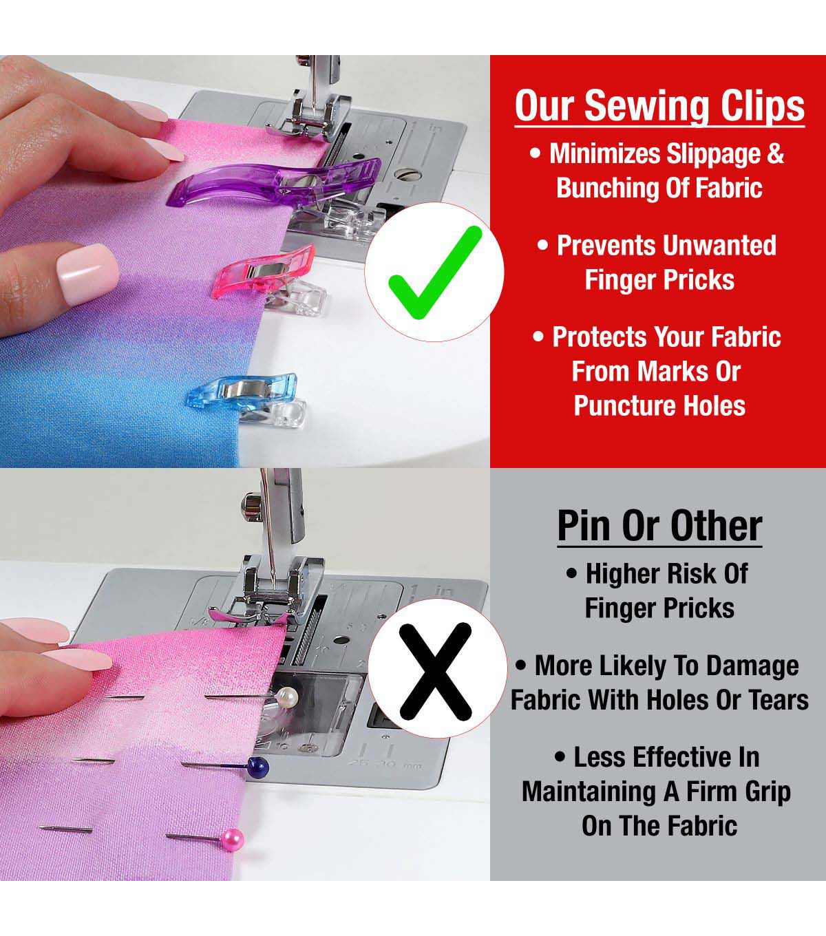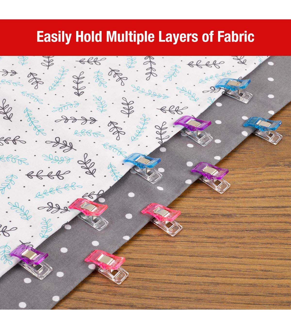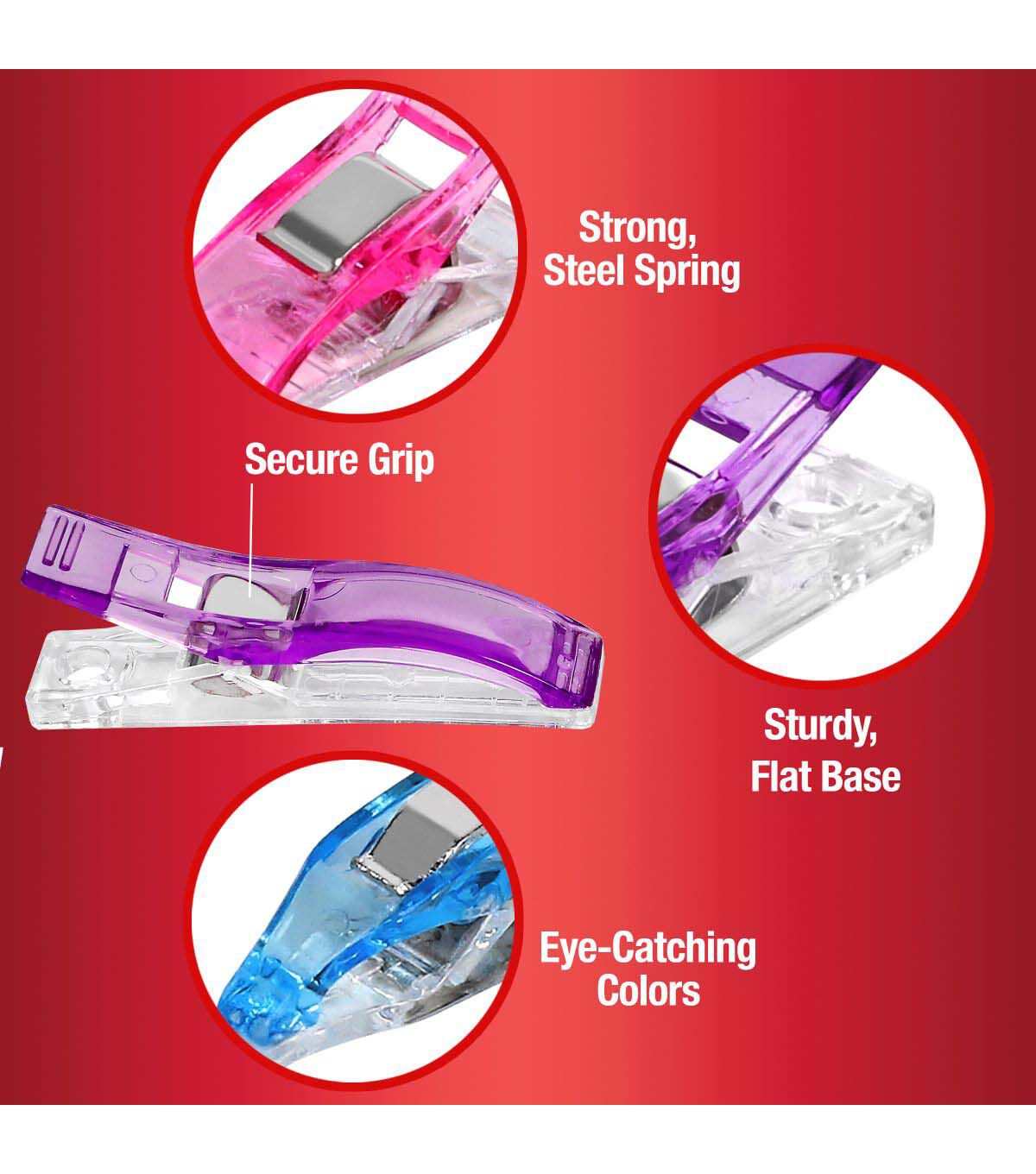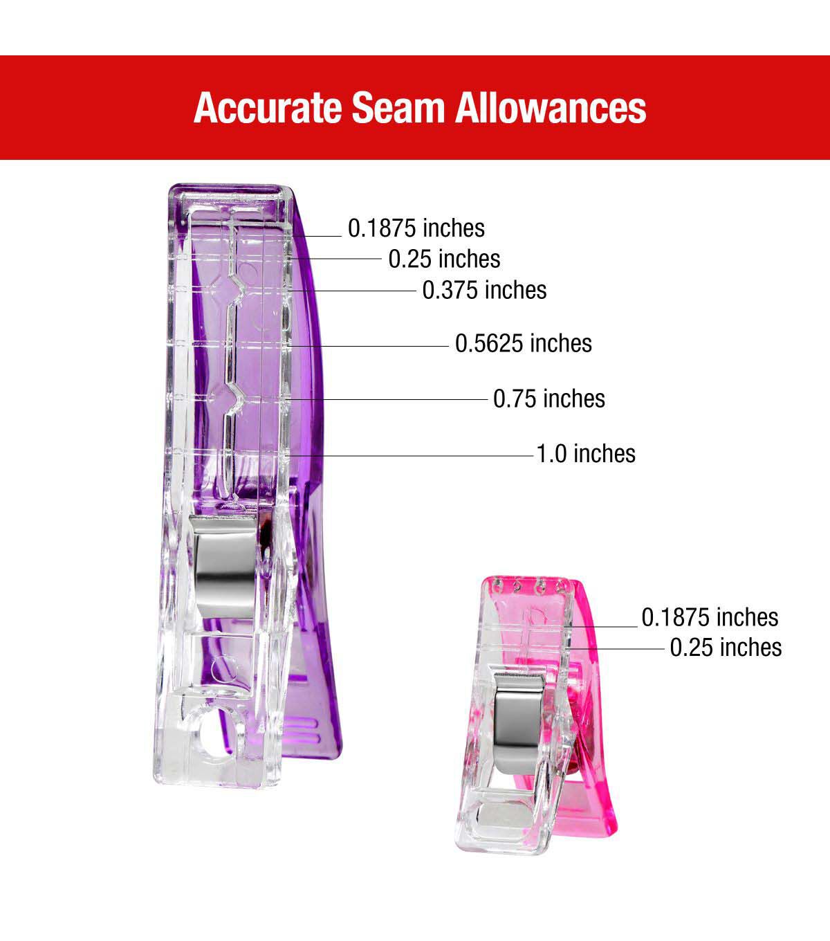 Meet your go-to sewing tool, the SINGER® 72-count Fabric Clips. This versatile set is tailored to suit any project, offering (12) large clips, (48) small clips, and (12) mini clips. Housed in a handy plastic storage case, these clamps are ideal for taking on-the-go, or for organized storage of your sewing essentials at home. Each clip is ergonomically designed for easy grip and reliable hold, making pinholes a thing of the past. Whether you're maneuvering multiple fabric layers through your sewing machine or aligning your quilting pieces, these clips ensure your project remains stable and precisely aligned. The vibrant colors—blue, pink, and purple—make these clips easy to spot when you need them, ensuring that you'll never lose sight of your essential sewing tools. For optimal precision, the large clips come with guide scales of 0.1875in, 0.25in, 0.375in, 0.5625in, 0.75in, and 1.0in, while the small clips feature 0.1875in, and 0.25in guides. Achieving impeccable seams and hems has never been easier: just clip, sew, and marvel at the results.