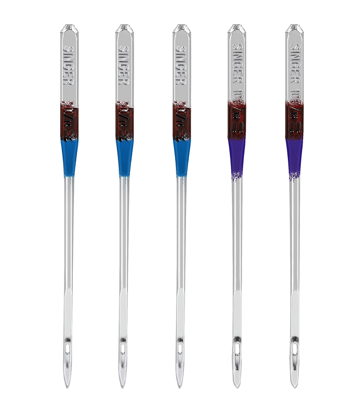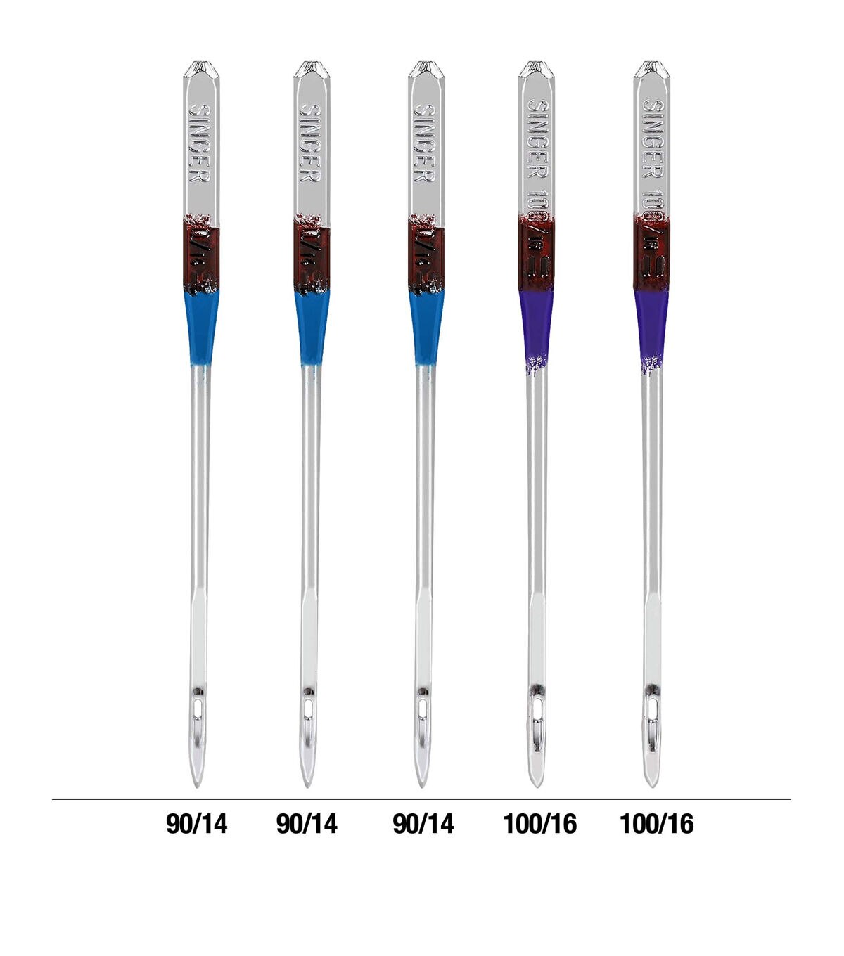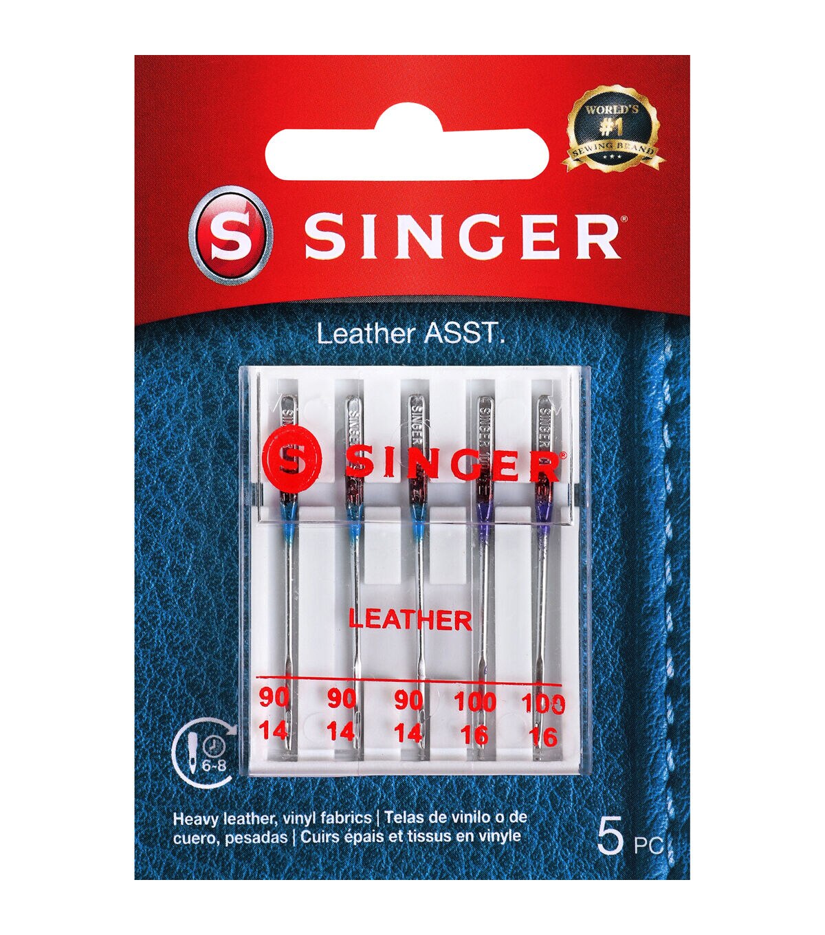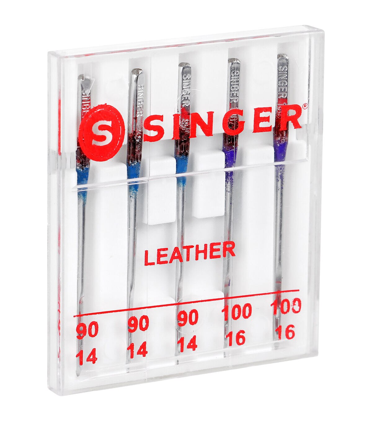- The pack of 5 SINGER leather sewing machine needles allows you to cut through leather and other heavy non-woven imitation leathers and suedes without creating large holes. Due to the needle's wedge shape slightly sharp cutting point, never use it on woven or knit fabrics. Machine needles are color coded to their sizes, which include: 3 blue size 90/14 and 2 purple size 100/16 for use on heavy to extra heavy weight materials. The needle kit comes in an easy-to-store compact transparent case with the sizes marked on the cover for easy recognition. The SINGER sewing machine needles can be used on SINGER, Brother, Kenmore, Bernina, Janome, Juki and other quality household domestic sewing machines. Domestic machines needles are not compatible with industry sewing machines.