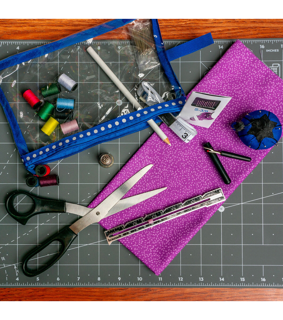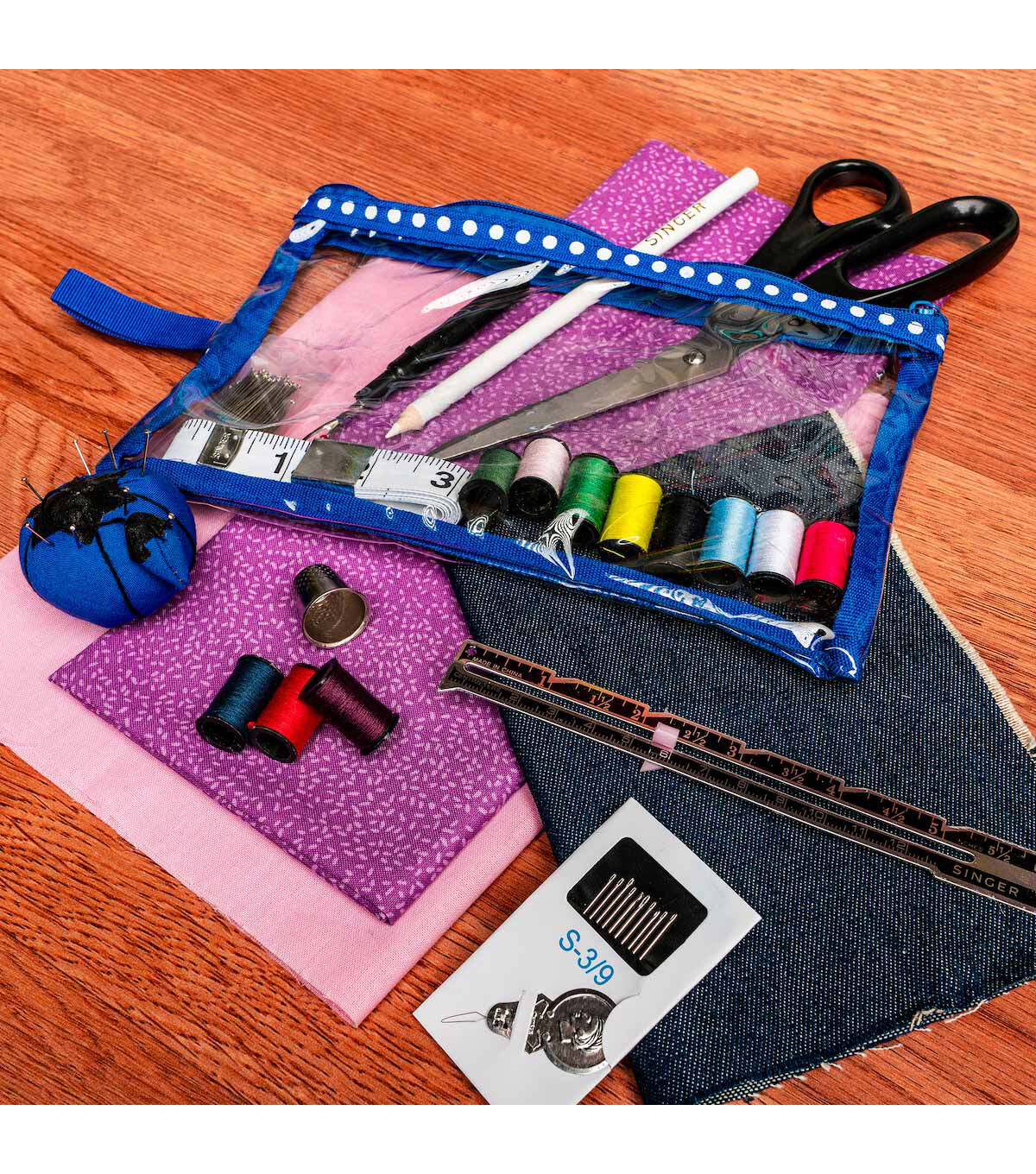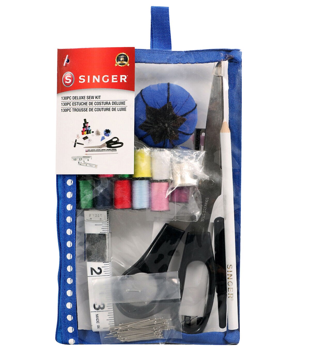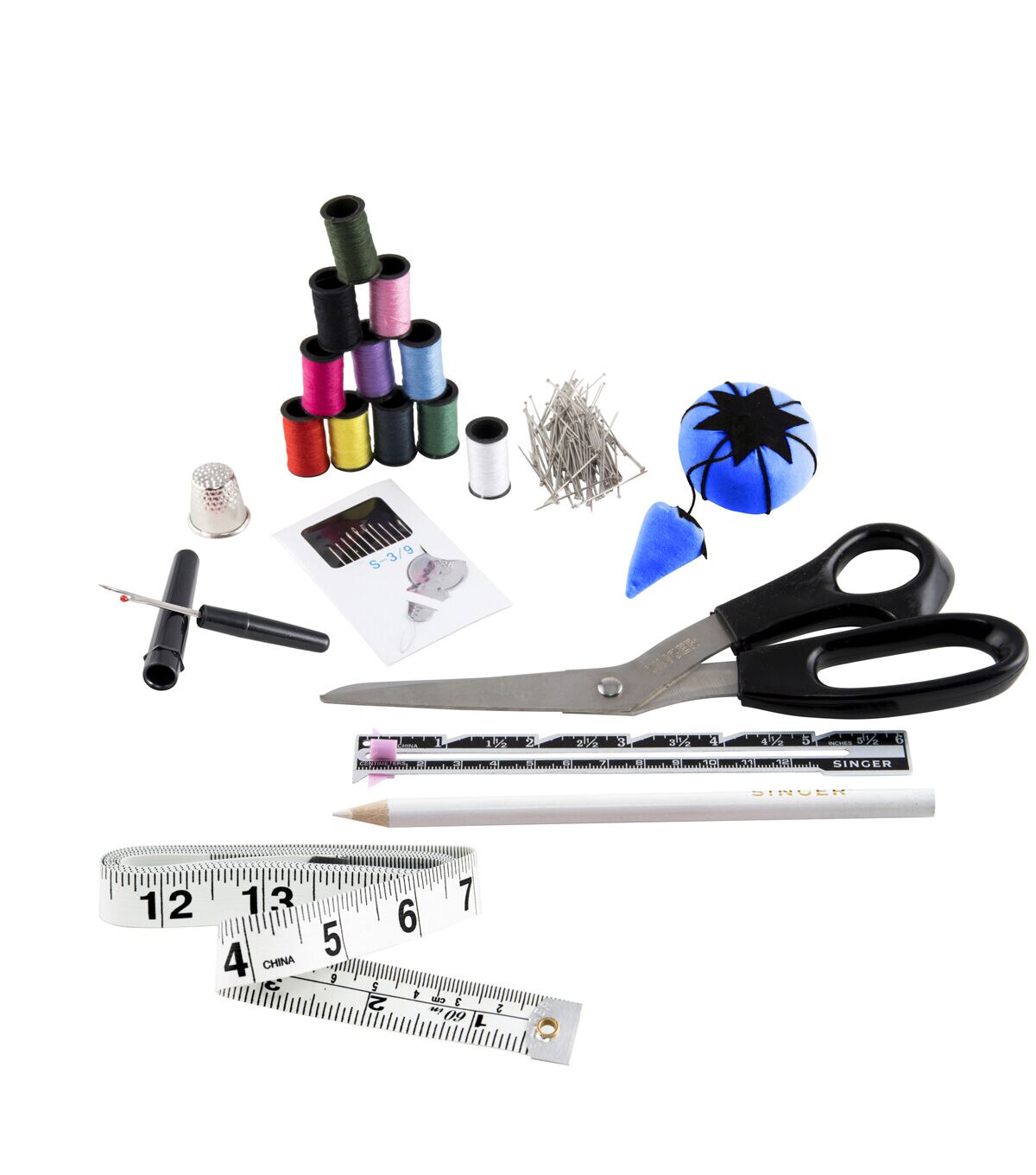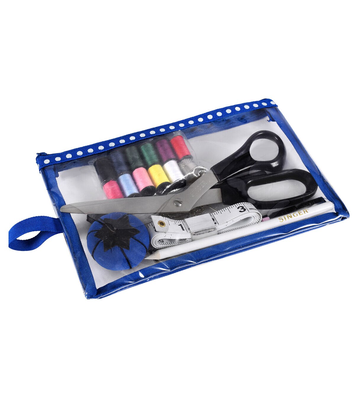 Complete with all the basic notions needed to mend clothing or begin a crafting project, the Singer Beginner's Deluxe Sewing Kit is the perfect starter kit. This small yet complete sewing kit includes a pair of 7.5-inch fabric scissors, a measuring tape, a thimble, a white marking pencil, a seam ripper and 100 1-inch dressmaker pins. Assorted hand needles, a needle threader, 11 mini spools of polyester thread measuring 10 yards each, a sewing gauge and a pink tomato pincushion are also included in this kit. These sewing essentials come in a trendy cosmetic-style storage bag that comes with two zippered compartments.