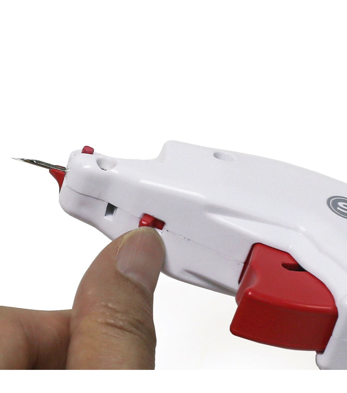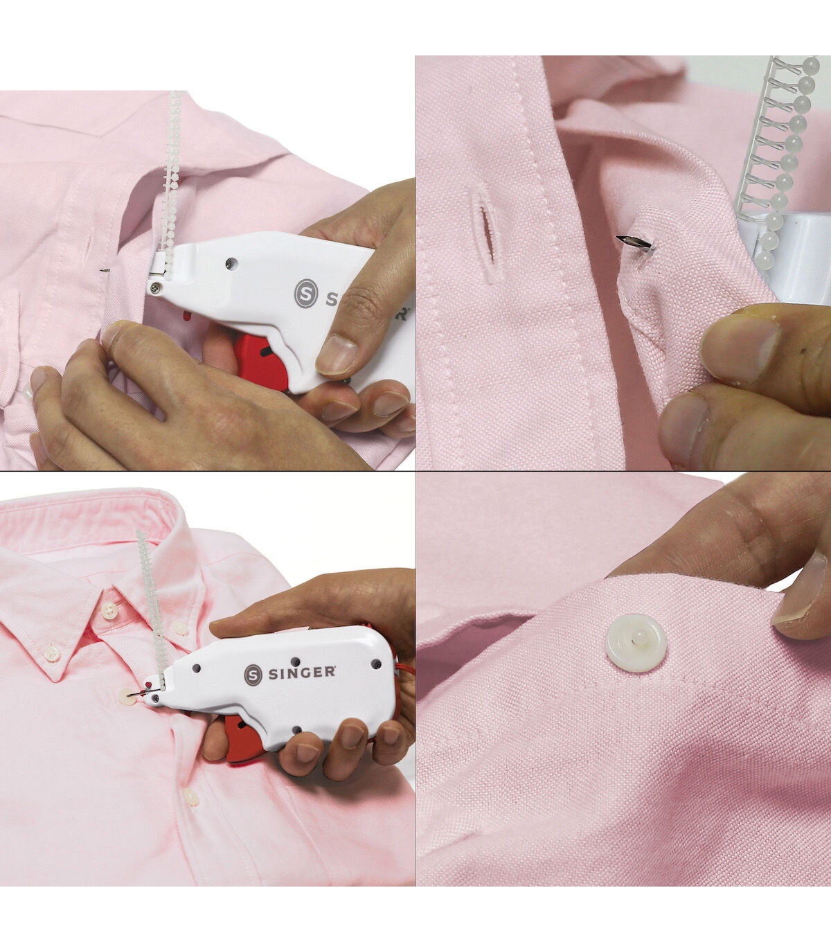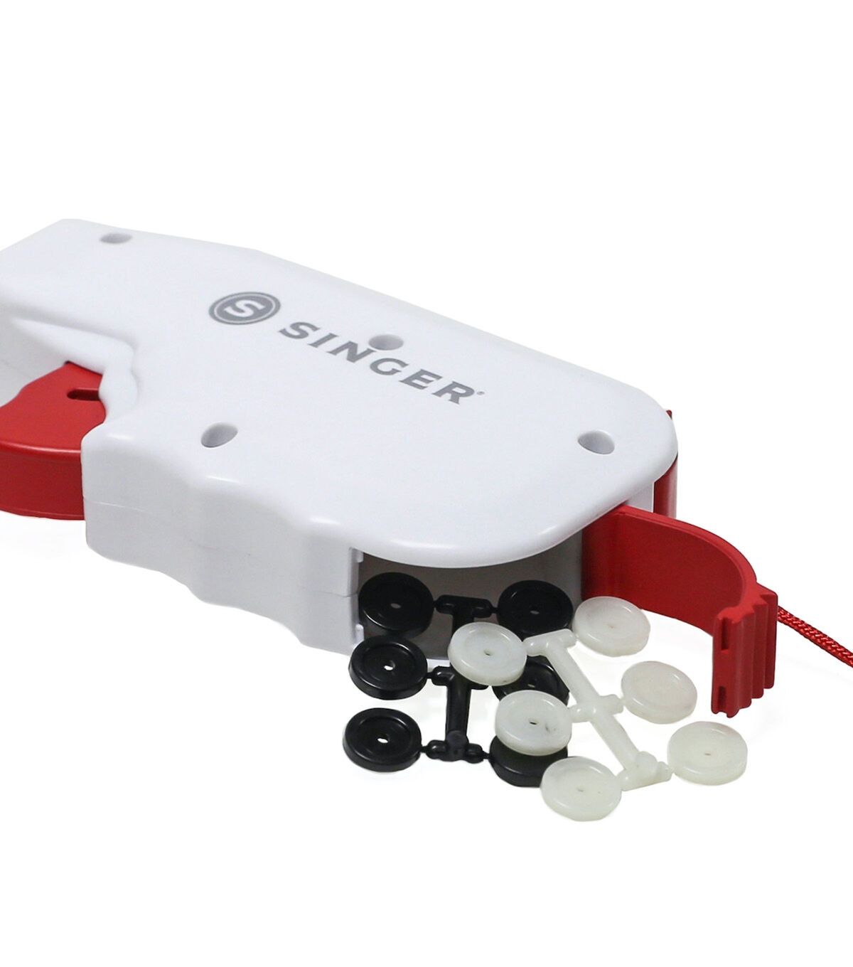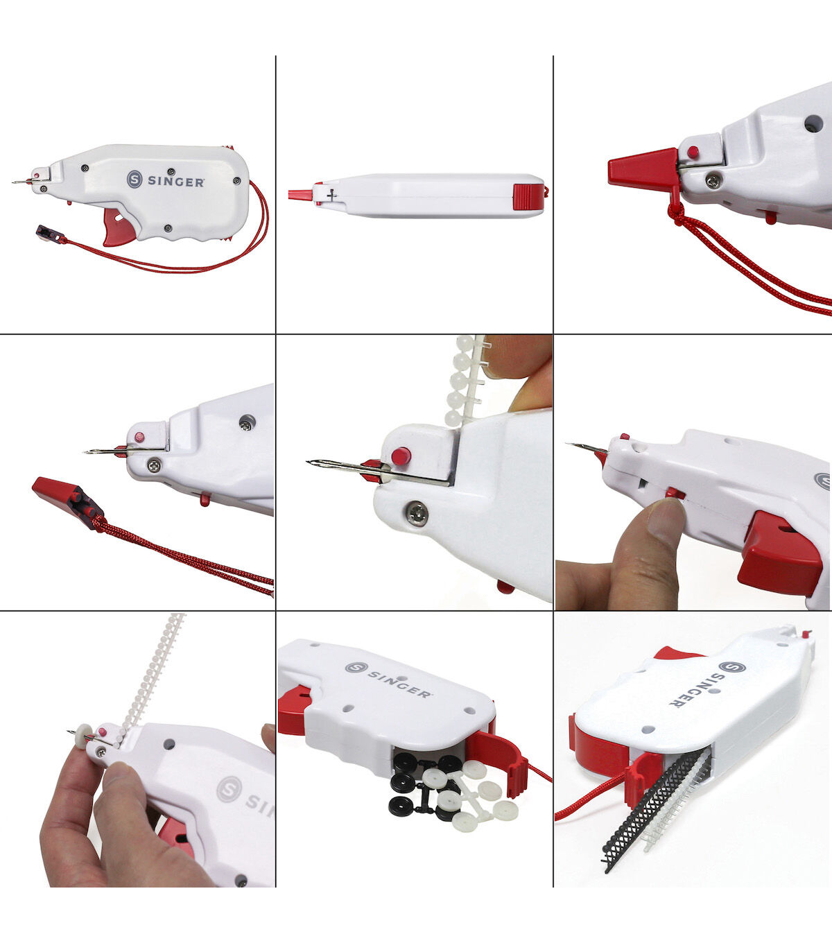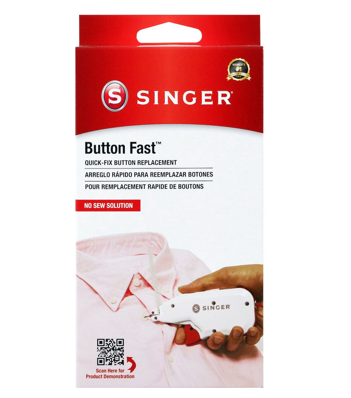 The Singer Button Fast Quick-fix Button Replacement Tool is the perfect hand-held tool for quick, emergency button replacements on the go. It easily attaches various types of buttons to your fabric without the need for sewing. This tool is designed with a built-in storage compartment that comes with two fastener strips in black and clear shades and 12 single-hole replacement buttons. A simple pull of the trigger pushes the fasteners through the button and the fabric, securing the button in place. Attach the protective needle cap for safety when not in use.