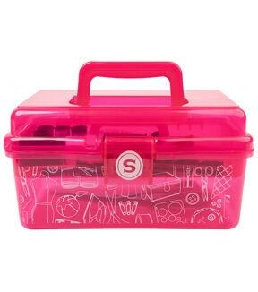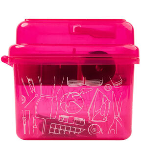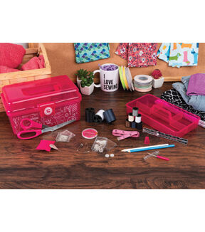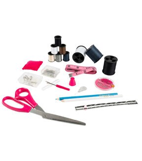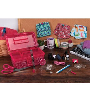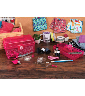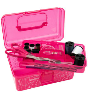 The deluxe Singer sewing kit contains a robust collection of 174 basic sewing notions. This portable travel sewing kit makes it easy to carry all your sewing supplies for mending clothing, replacing buttons, and making emergency repairs on the go. The bright pink plastic storage case has a sturdy collapsible handle and easy snap closure. A sectioned lift-out tray provides an extra layer of storage to carry all your sewing essentials for any type of sewing project. This package contains 8.5 inch scissors, a thimble, seam ripper, square pin cushion, 60-inch tape measure, 3 large thread spools (150yds each), 6 small thread spools (25yds each), 30 assorted hand needles in compact, needle threader, 100 dressmaker pins in case, 15 safety pins & 10 shirt buttons in case, seam gauge, and 2 fabric marking pencils. Imported.