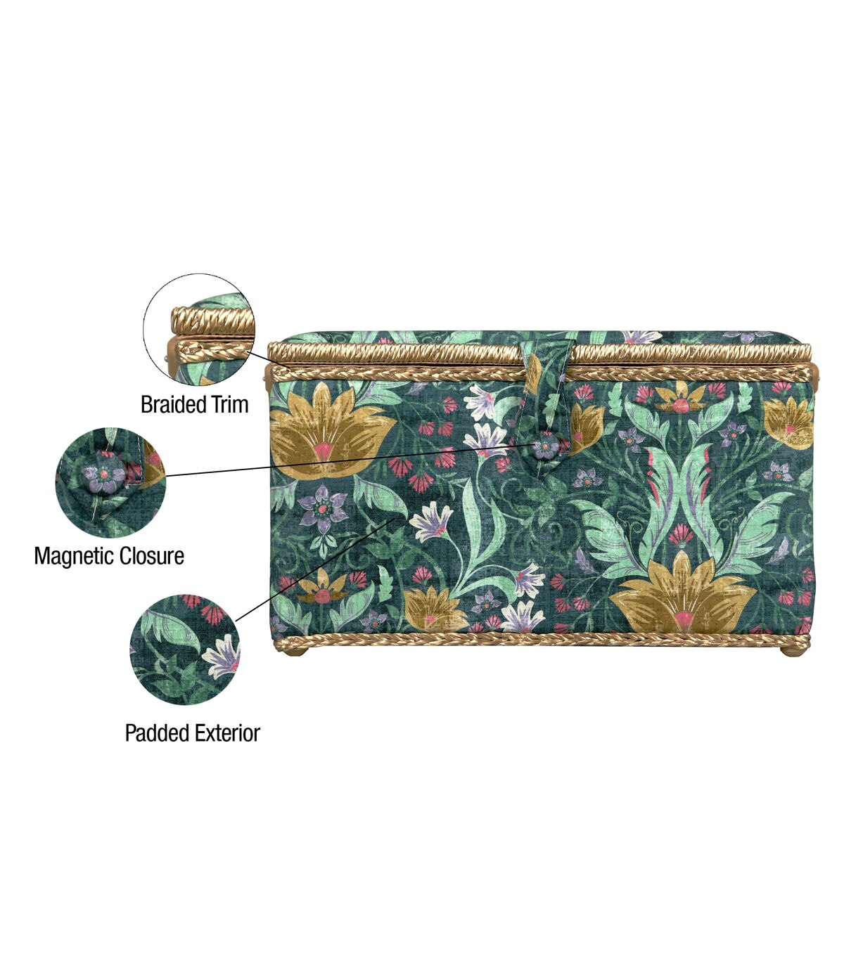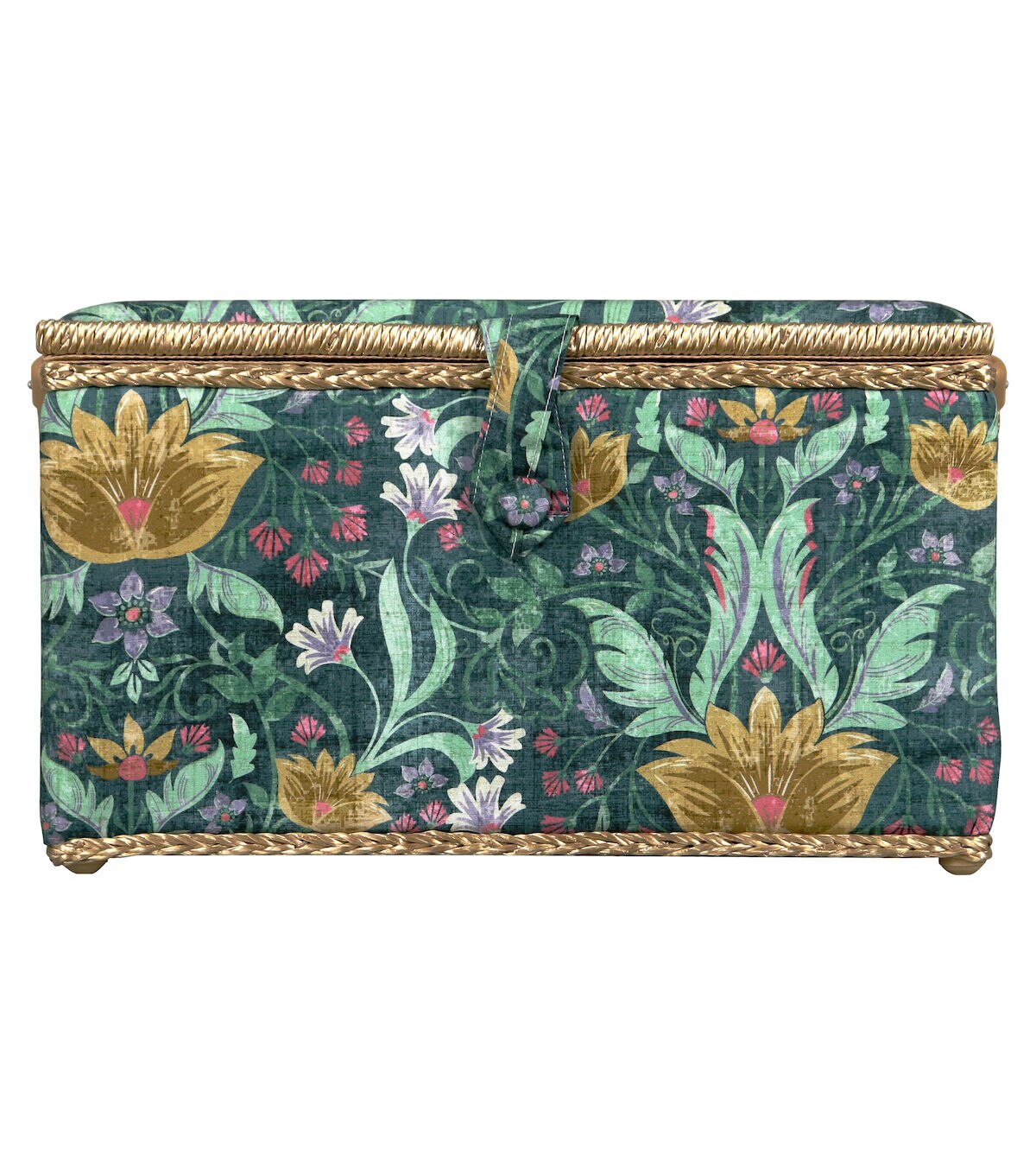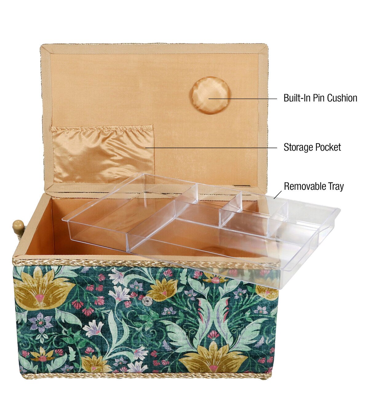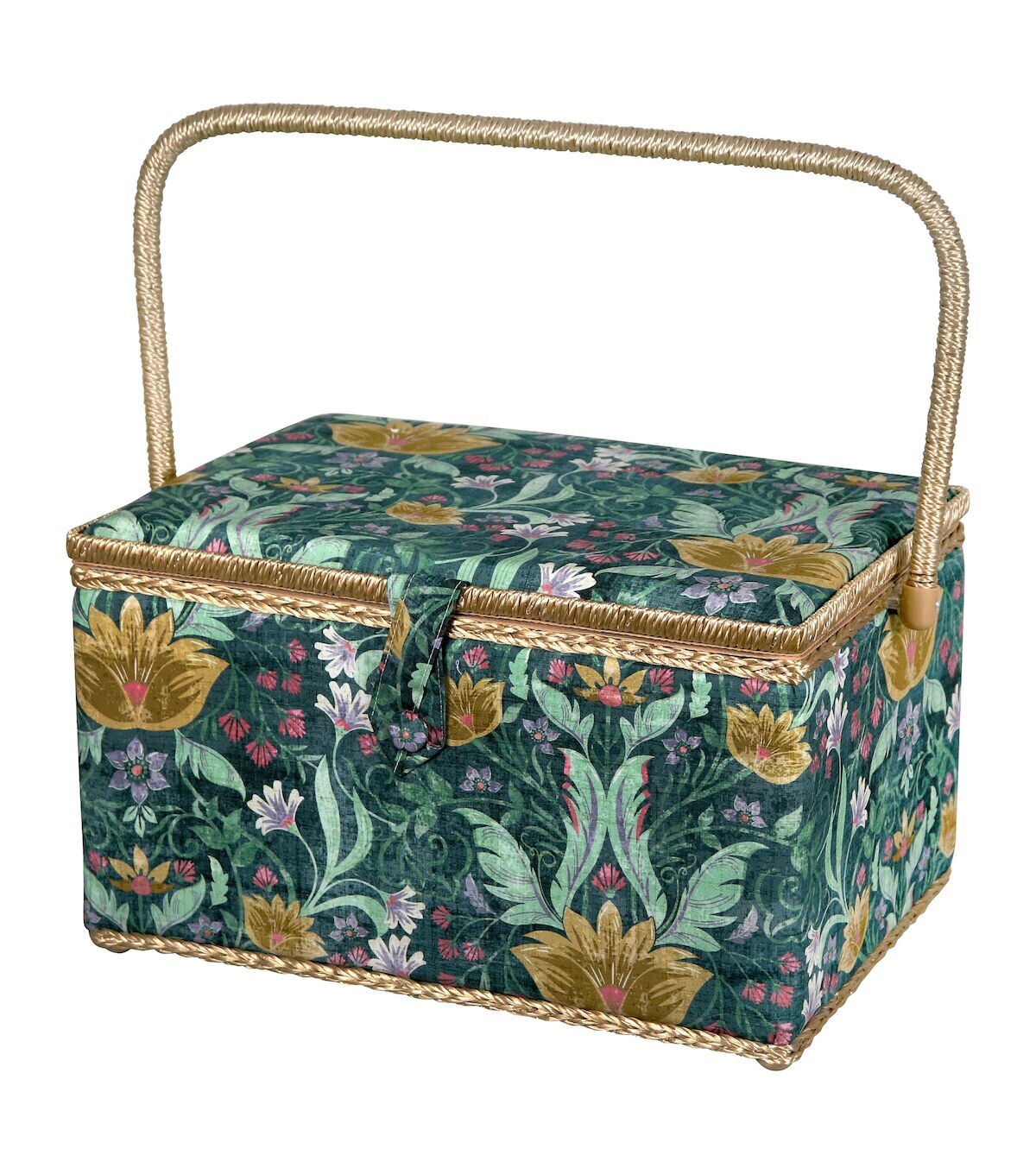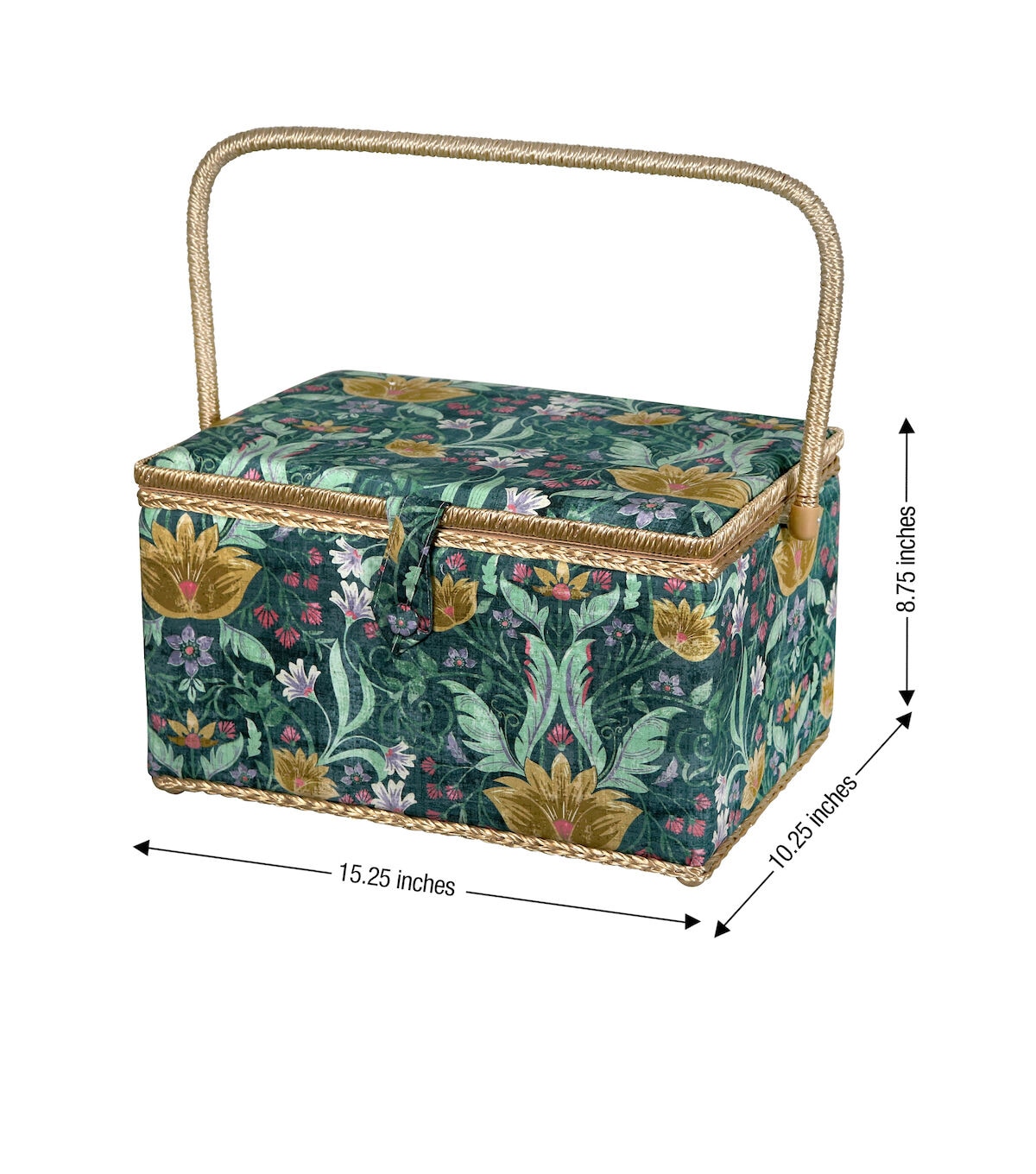 - Decorative sewing basket provides ample storage for all your sewing and crafting essentials featuring a green tapestry print travel case with a gold silken polyester interior