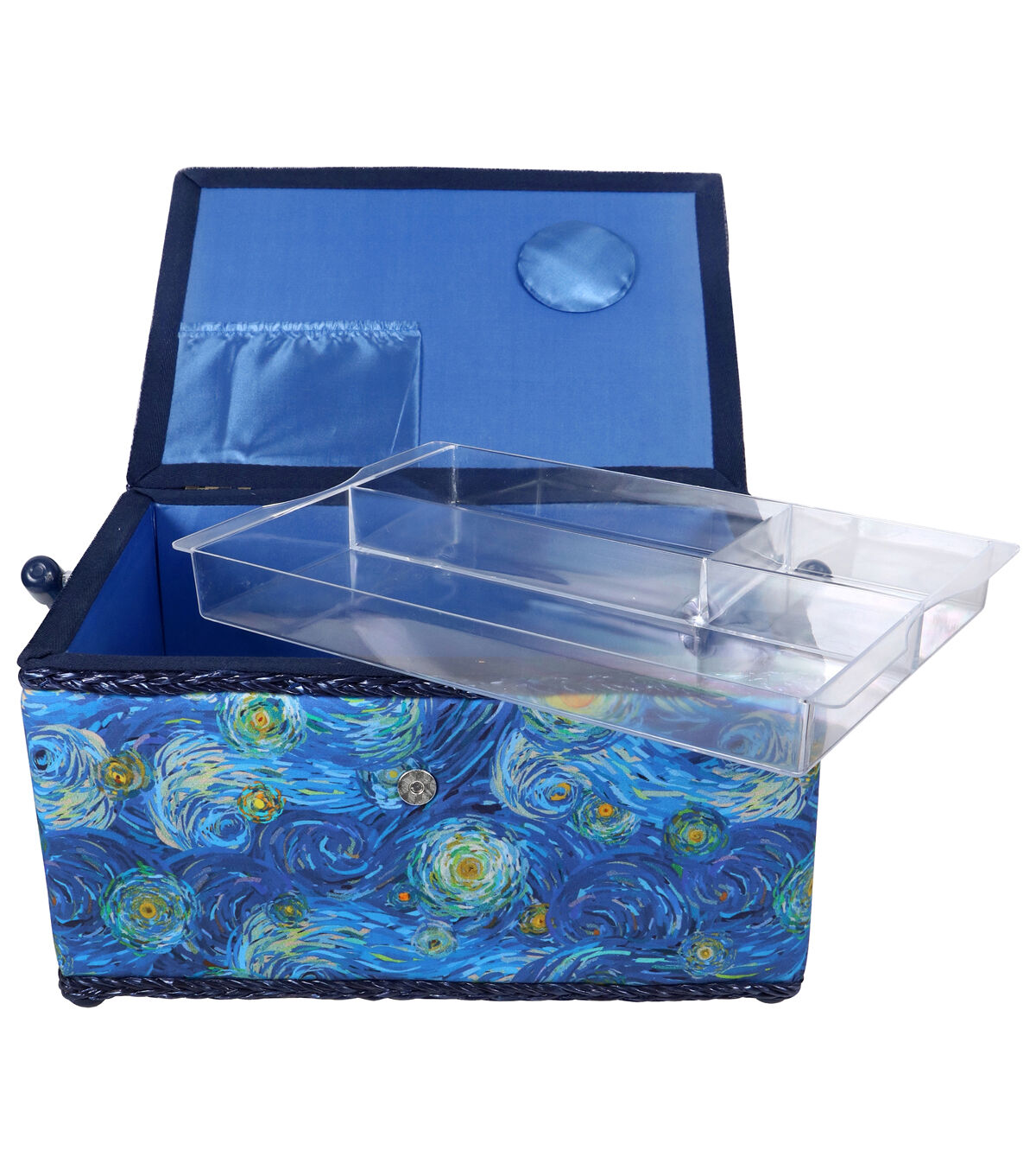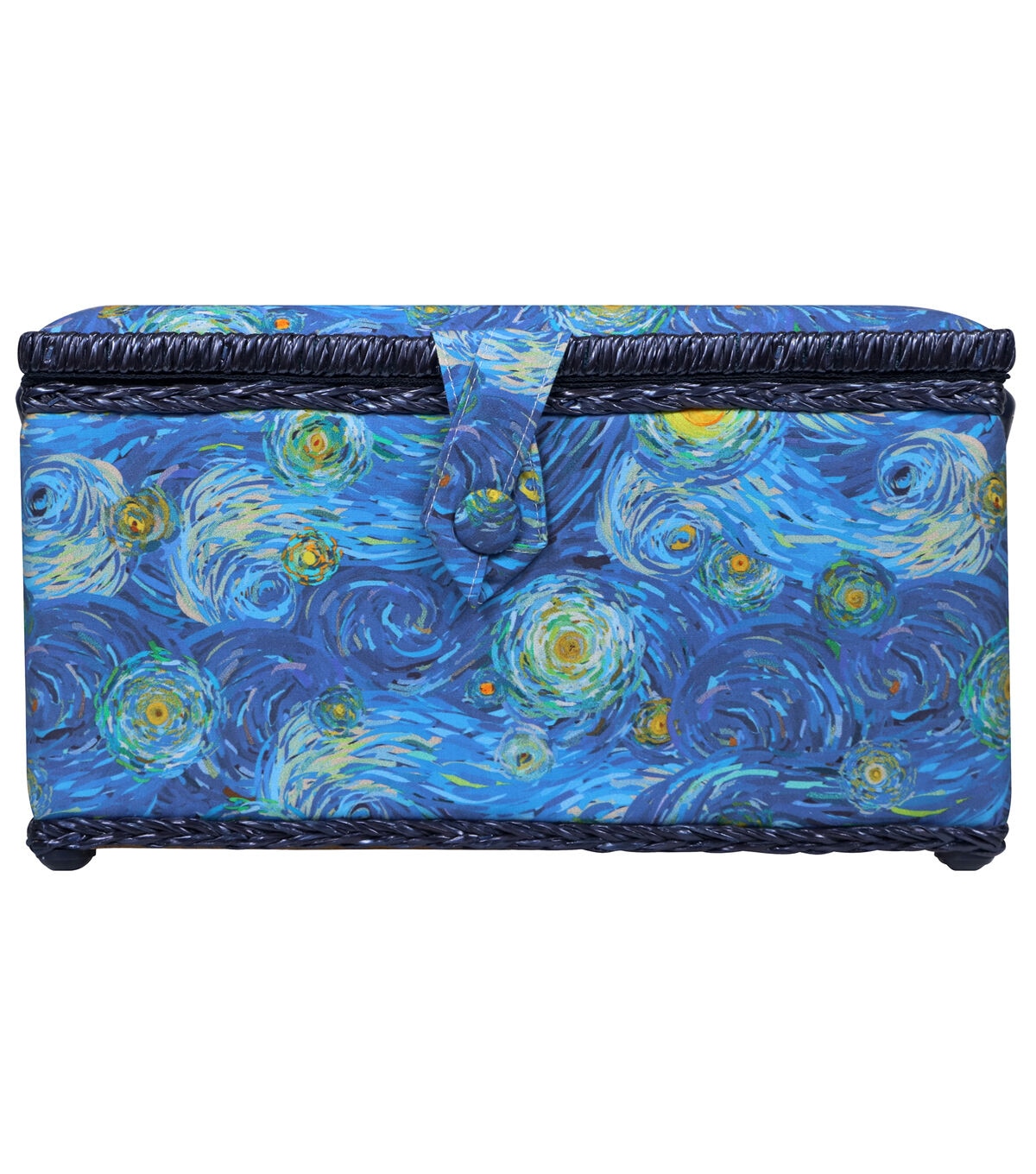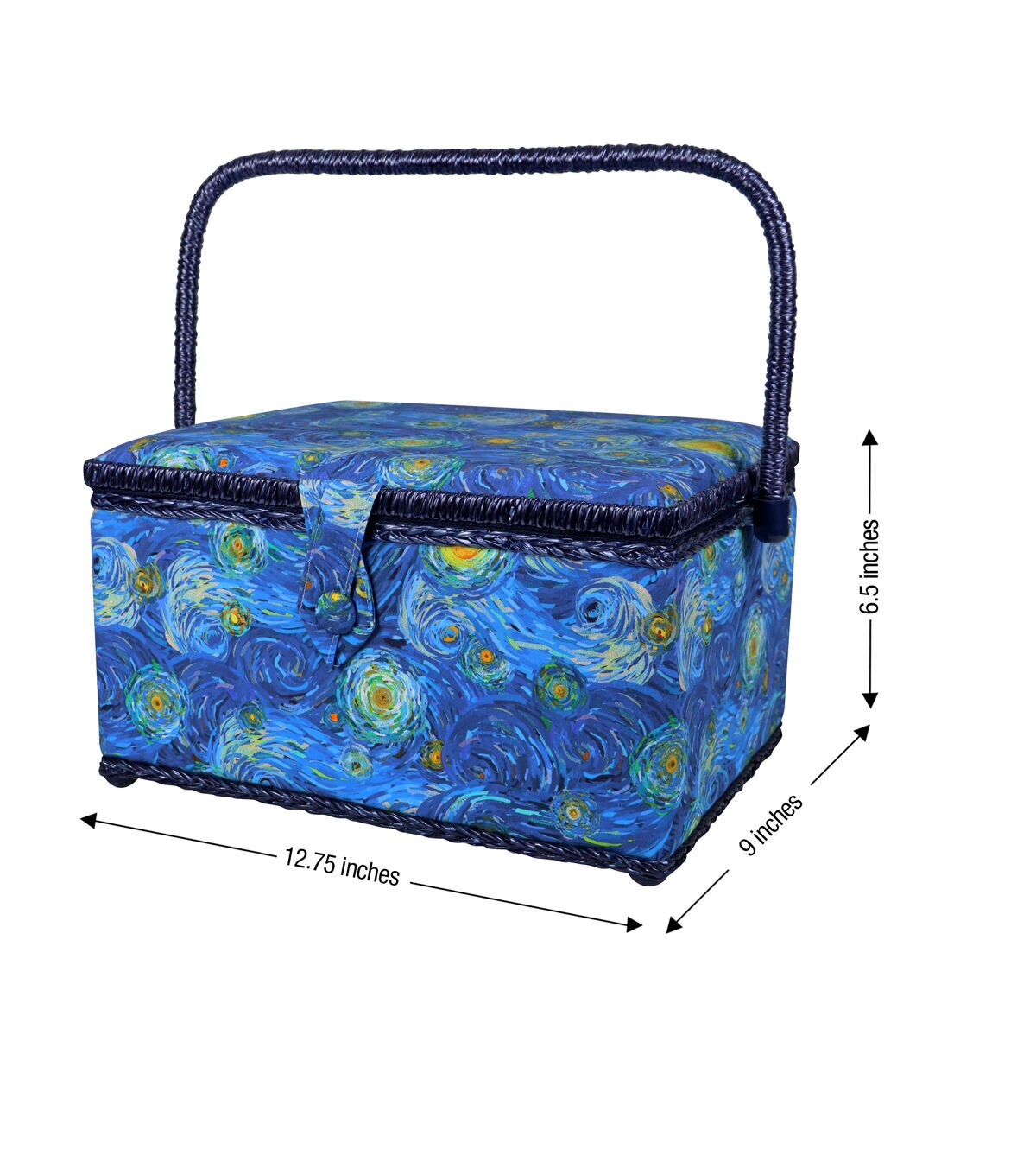 The SINGER Large Sewing Basket in Swirls Print is an ideal sewing kit for beginners. Measuring 11.53” wide by 8.35” deep and standing 6.5” high, this sewing basket is large enough to fit sewing needles, thread, bobbins, and an assortment of sewing accessories and tools. The basket is covered in a high quality, wrinkle-free fabric in an illustrious swirls print featuring hand painted swirls reminiscent of Van Gogh’s “The Starry Night”. Its sturdy frame and matching collapsible handle make the sewing kit easy to store and an ideal travel case to carry your essentials for sewing projects on the go. The kit has a magnetic button closure to keep contents secure, and it contains a removable hard tray insert that offers extra storage space and keeps your sewing supplies neat and organized. This versatile storage basket also doubles as a stylish storage container for bobbins, crafting tools, scrapbooking supplies, colored beads, art supplies, costume jewelry, or beauty products. With so many ways it can be used, buy one for each of the areas you want to organize. This is the perfect sewing basket for easy travel, ample storage, and optimal organization.