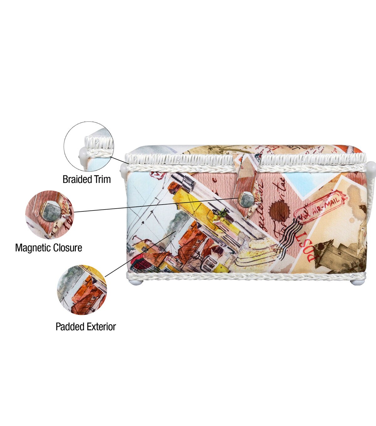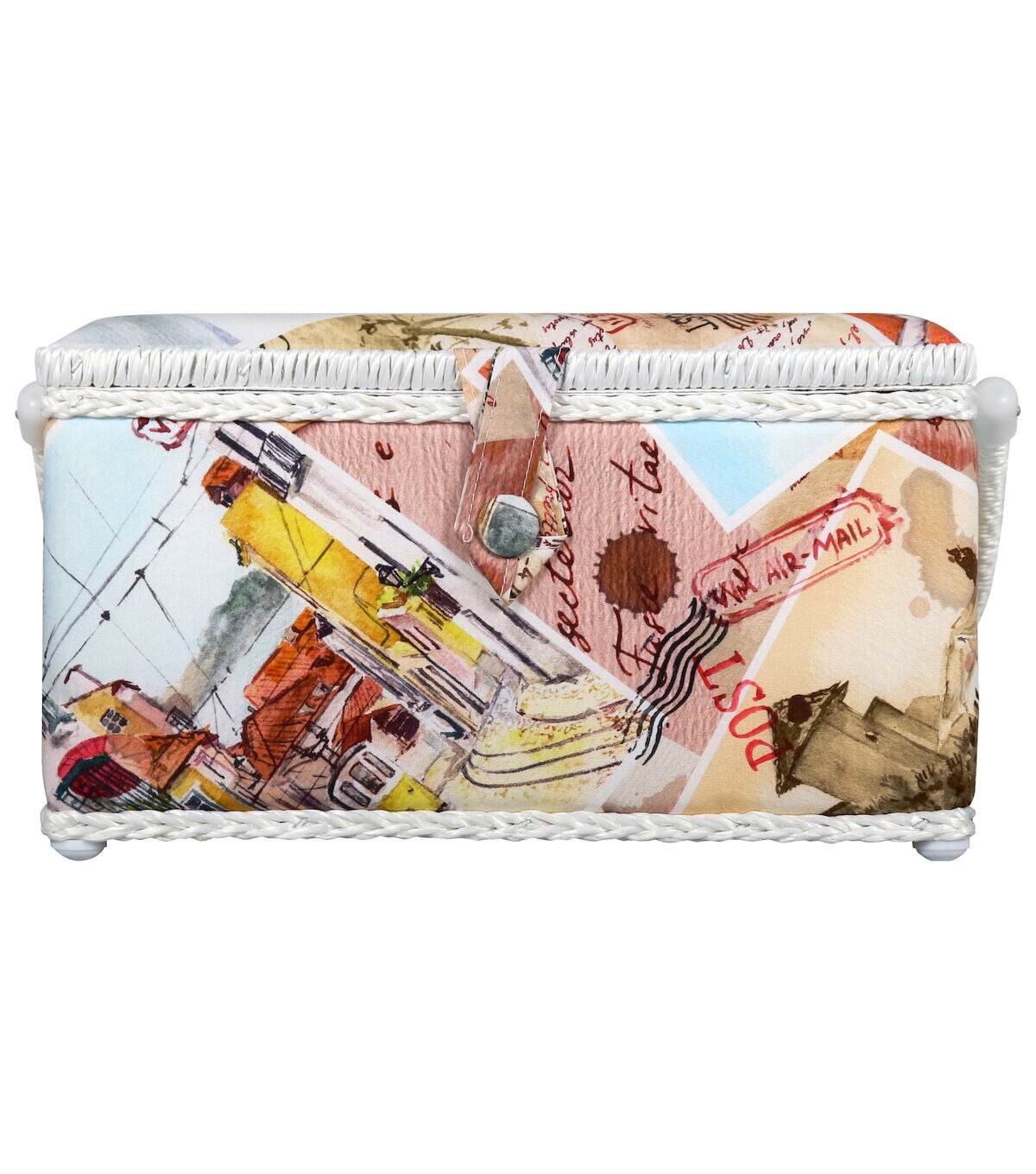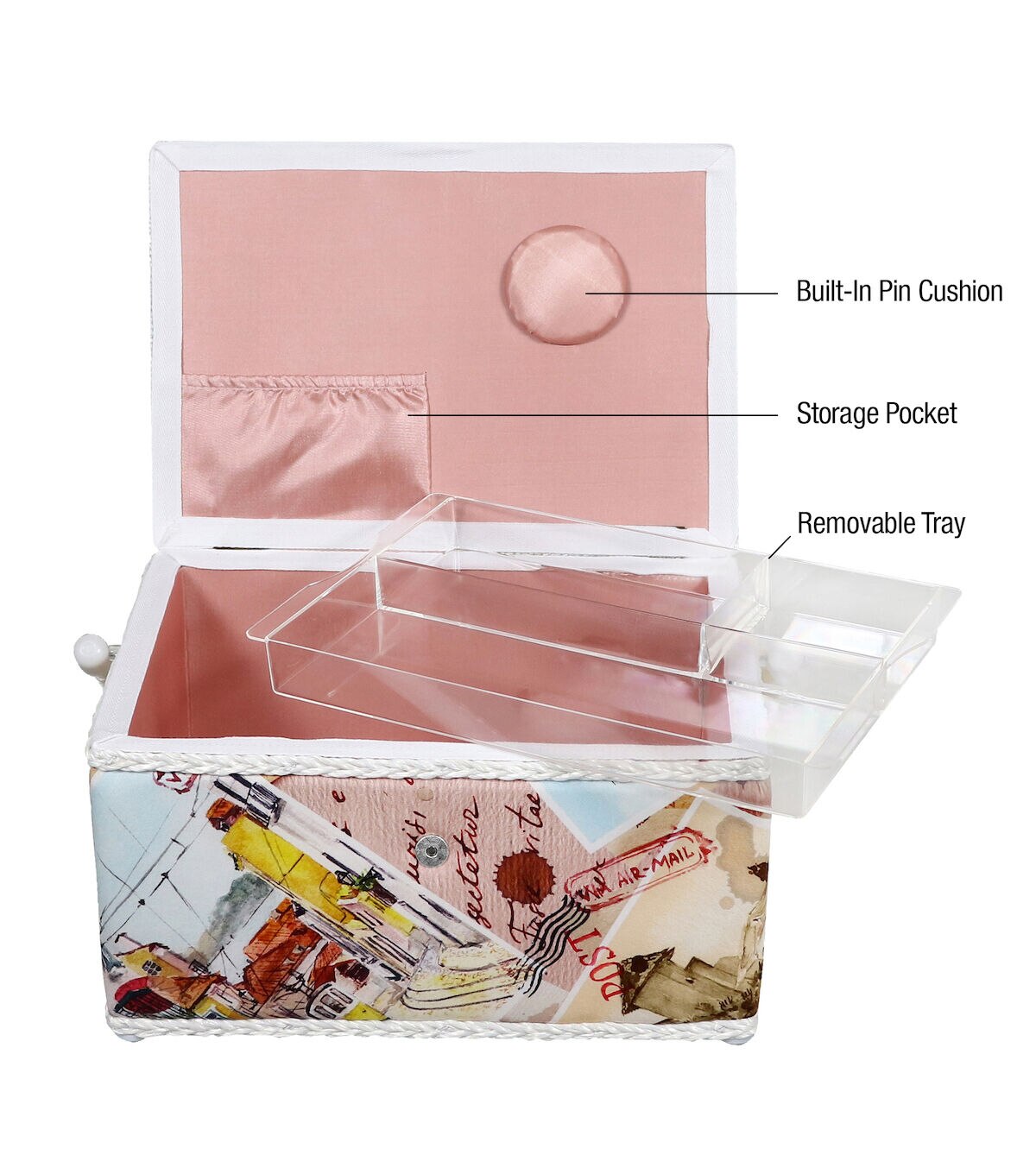 - Decorative sewing basket provides ample storage for all your sewing and crafting essentials featuring a vintage postcard print travel case with a mauve silken polyester interior