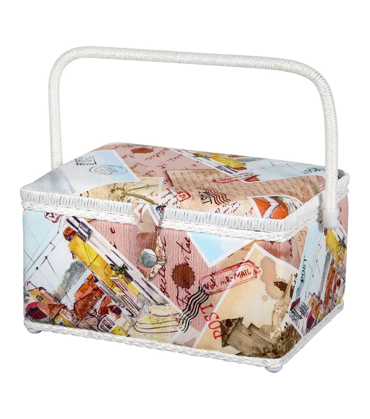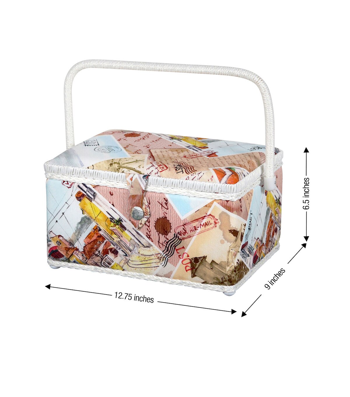 The SINGER Large Sewing Basket in Vintage Postcard Print is an ideal sewing kit for beginners. Measuring 11.53” wide by 8.35” deep and standing 6.5” high, this sewing basket is large enough to fit sewing needles, thread, bobbins, and an assortment of sewing accessories and tools. The basket is covered in a high quality, wrinkle-free fabric with a nostalgic postcard print featuring a collection of vintage postcards and hand written letters. Its sturdy frame and matching collapsible handle make the sewing kit easy to store and an ideal travel case to carry your essentials for sewing projects on the go. The kit has a magnetic button closure to keep contents secure, and it contains a removable hard tray insert that offers extra storage space and keeps your sewing supplies neat and organized. This versatile storage basket also doubles as a stylish storage container for bobbins, crafting tools, scrapbooking supplies, colored beads, art supplies, costume jewelry, or beauty products. With so many ways it can be used, buy one for each of the areas you want to organize. This is the perfect sewing basket for easy travel, ample storage, and optimal organization.