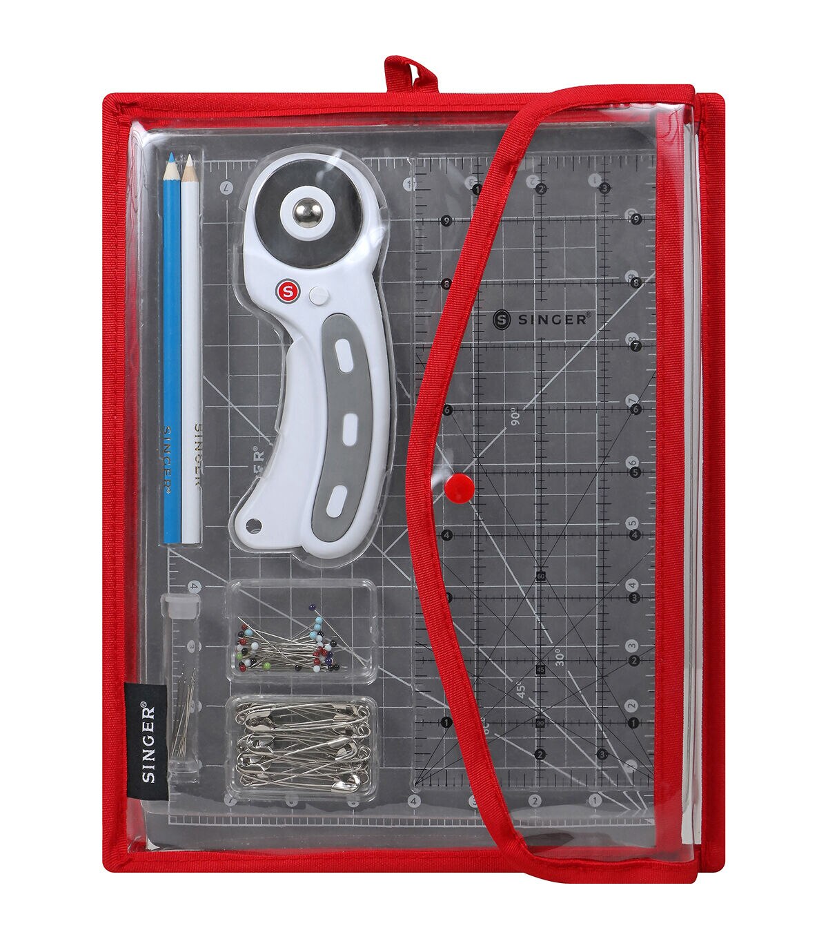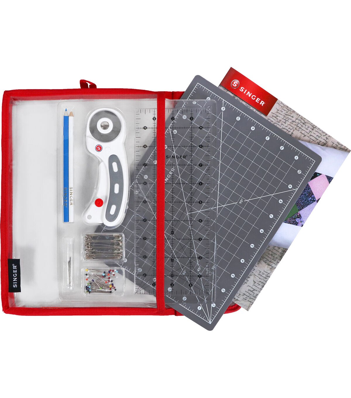 This package contains a 45mm rotary cutter, 11x8.5 inch cutting mat, 4x10 inch acrylic ruler, 2 fabric marking pencils, 50 glass head pins in size 22: 1-3/8in (35mm), 20 basting pins in size 3: 2in (51mm), 9 assorted hand needles, storage pouch and step-by-step instructions. Imported.