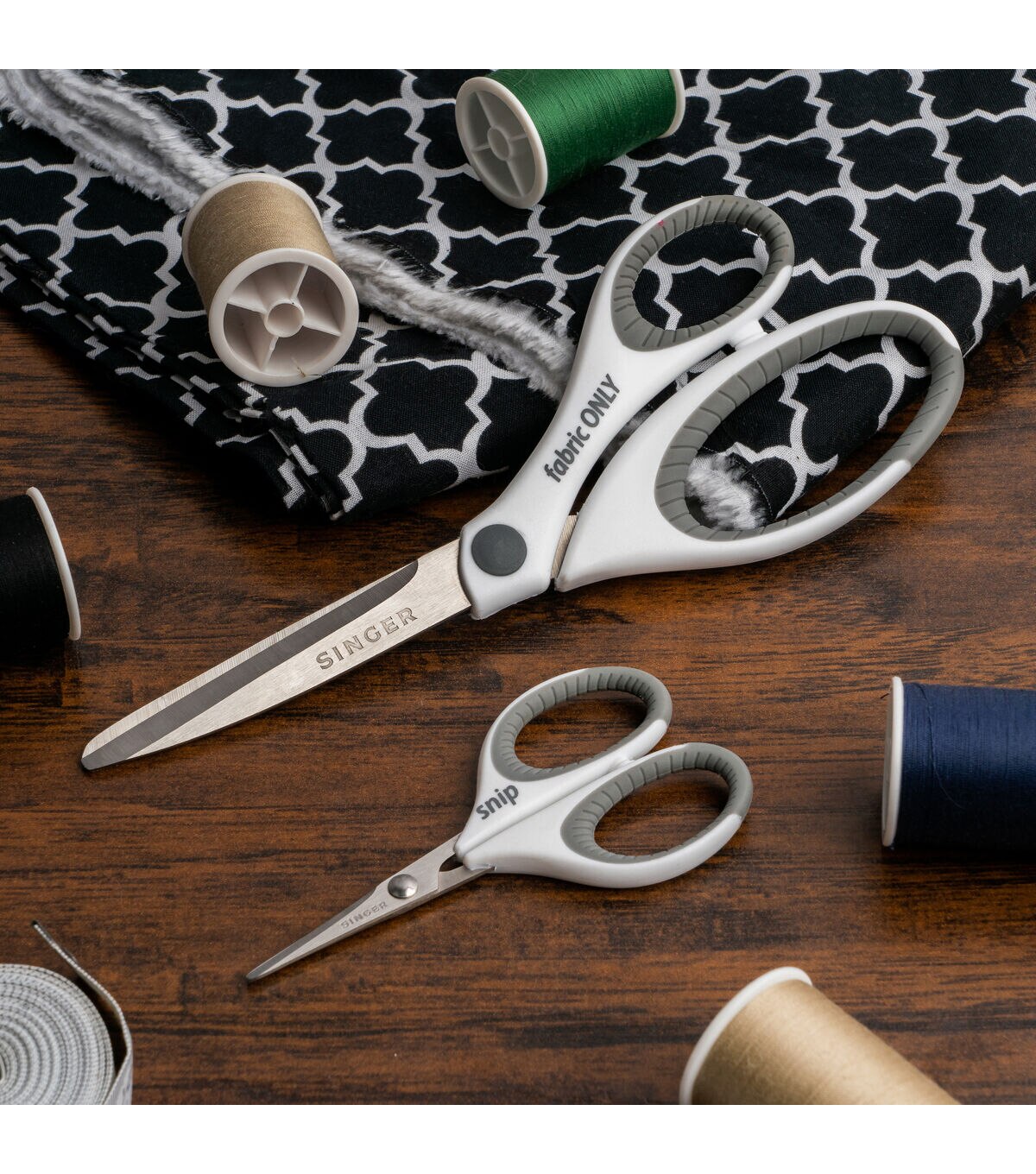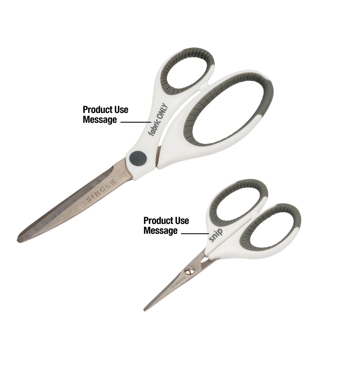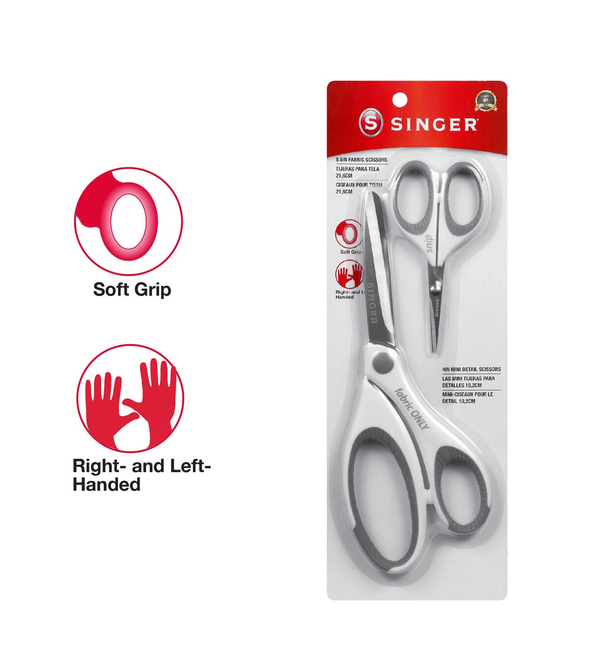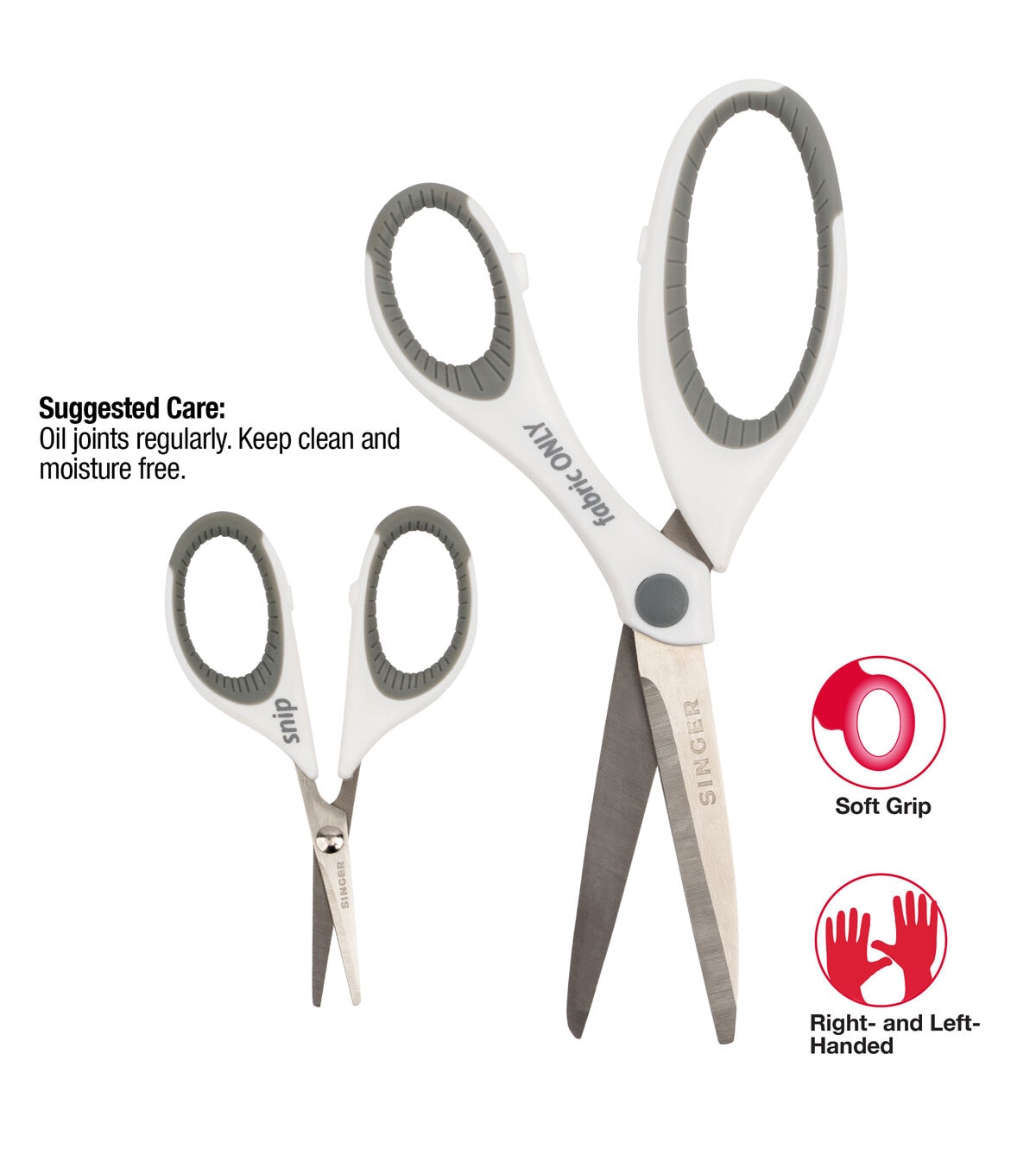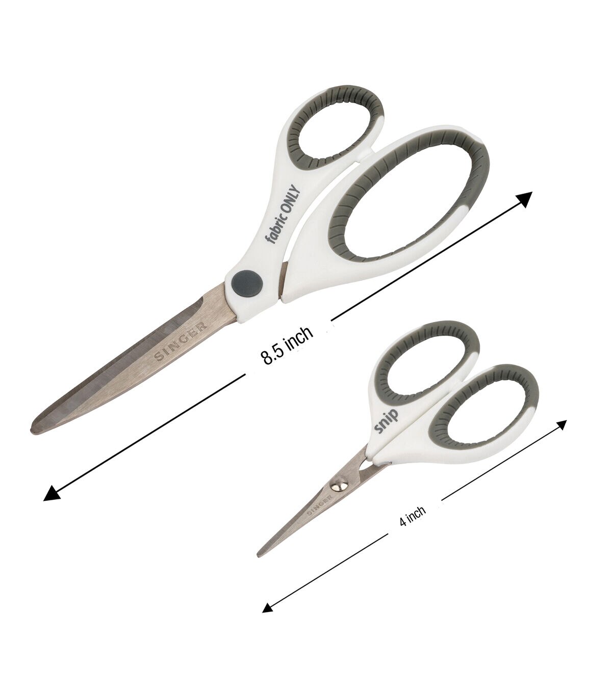 - 8.5” Fabric Scissors are dressmaker’s shears designed for easily cutting through multiple layers of fabrics and 4” Mini Craft Scissors are designed for precise cutting of thread, paper, and crafts