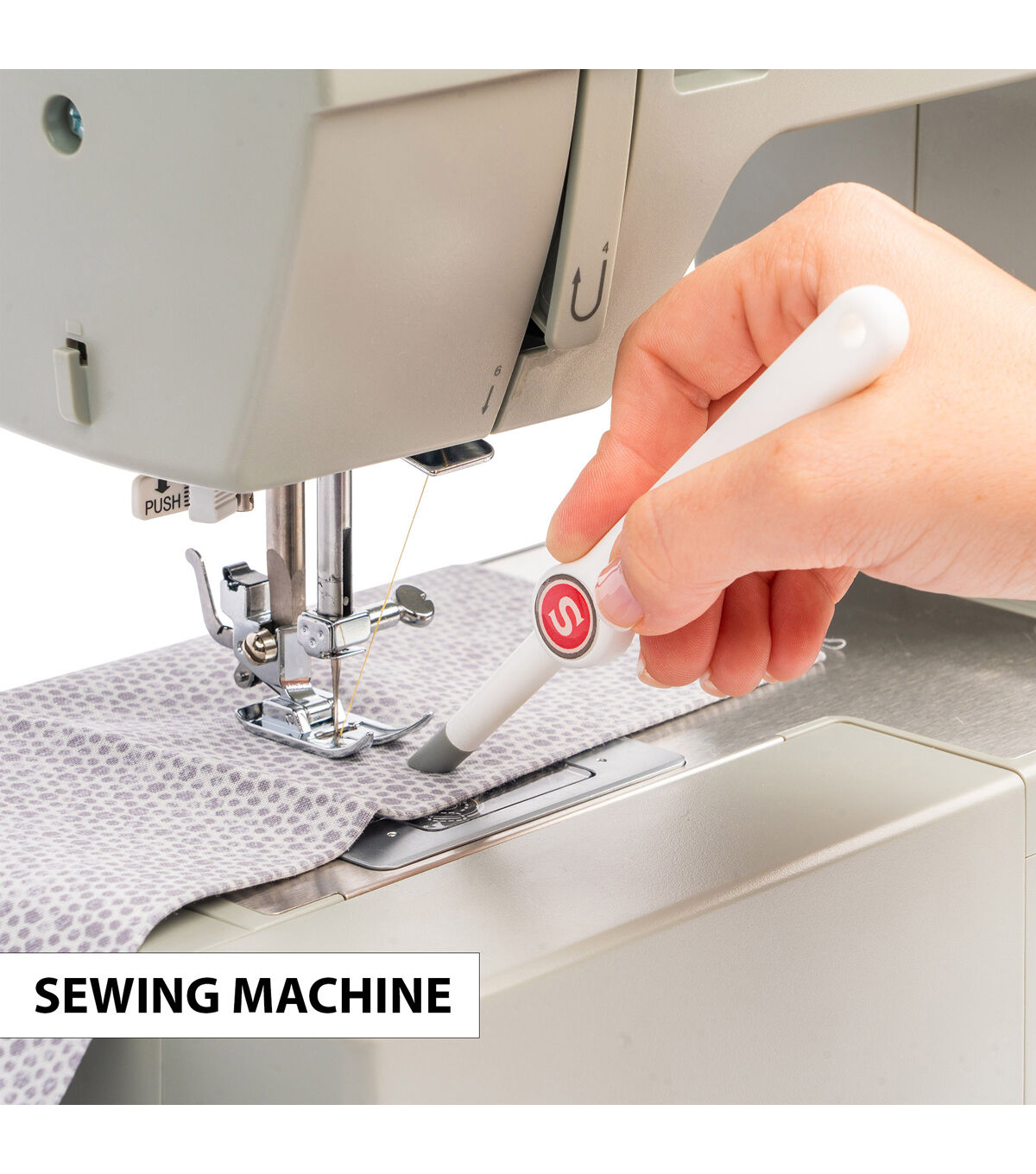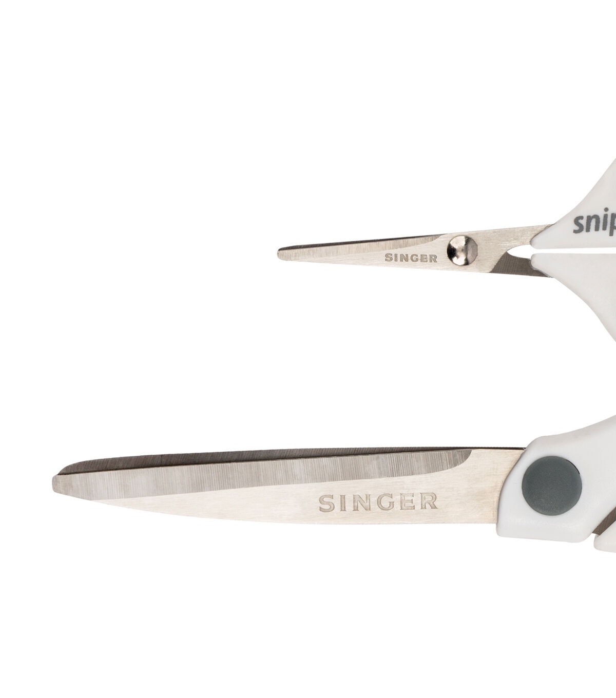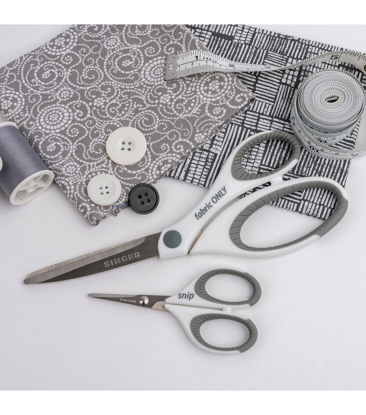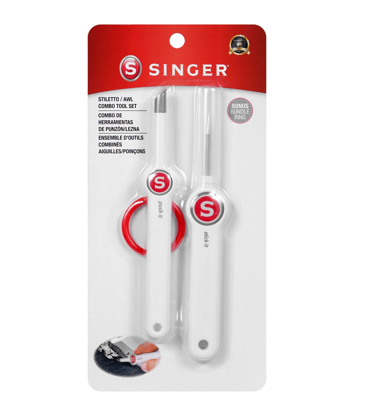 The SINGER Modern Maker Sewing Machine Tools Bundle brings together six quality sewing essentials for a variety of sewing tasks. Measuring 8.5” in length, the SINGER Fabric Scissors are professional dressmaker’s shears designed to cut easily and cleanly through any fabric. The SINGER Mini Detail Craft Scissors measure 4” in length and are designed for precision cutting projects from embroidery and applique work to scrapbooking and crafting. Both scissors feature durable stainless steel blades for long-lasting sharpness as well as matching gray and white comfort grip handles that are designed to be comfortably used by both right- and left-handed users. The handles are made from strong yet lightweight thermoplastic rubber (TPR) and feature added ribs for a more secure grip. Tongue-in-cheek messages printed on the handles – “Fabric ONLY” on the dressmaker’s shears and “Snip” on the mini detail scissors – help those household members who are not tailors or seamstresses to avoid mistaking one cutting tool for another and using scissors on the wrong material. The SINGER Comfort Seam Ripper features a sharp two-pronged blade that is ideal for cutting thread, opening stitched buttonholes, picking stitches, opening seams, as well as removing tags, snaps, and buttons from clothing – all without damaging the fabric. The seam cutter has a comfortable pink and white handle that’s easy to maneuver, and it also comes with a rubber safety cap that protects the point when not in use, keeping the blade sharp. The SINGER Stiletto and Awl Combo Pack is a set of two tools that feature sturdy, easy-to-maneuver, plastic handles with a bundling ring for easy organization. The stiletto tool features a rubber tip to securely grip fabric and gently ease it under a sewing machine’s needle. It can also be used for other gripping tasks, such as holding fabric edges and corners in place when ironing to prevent burning your fingers. The awl is a sharply pointed tool used for piercing fabric, leather, and other heavy materials. It is the perfect tool for starting or enlarging a hole, and it comes with a safety cap to cover the pointy tip when not in use. The handles bear the tongue-in-cheek usage directions of “stick it” and “push it.” The SINGER Sewing Needle Threaders can be used with both hand and machine needles for quick, easy threading every time. The threaders are designed with a sturdy backplate that easily guides the needle onto the threader and provides added durability to prevent the threader from becoming bent. When it’s time to cut the thread, simply turn the double-duty threader around and use the built-in thread cutter on the opposite side. This convenient sewing bundle provides a set of quality, must-have sewing tools to help you sew like a pro.