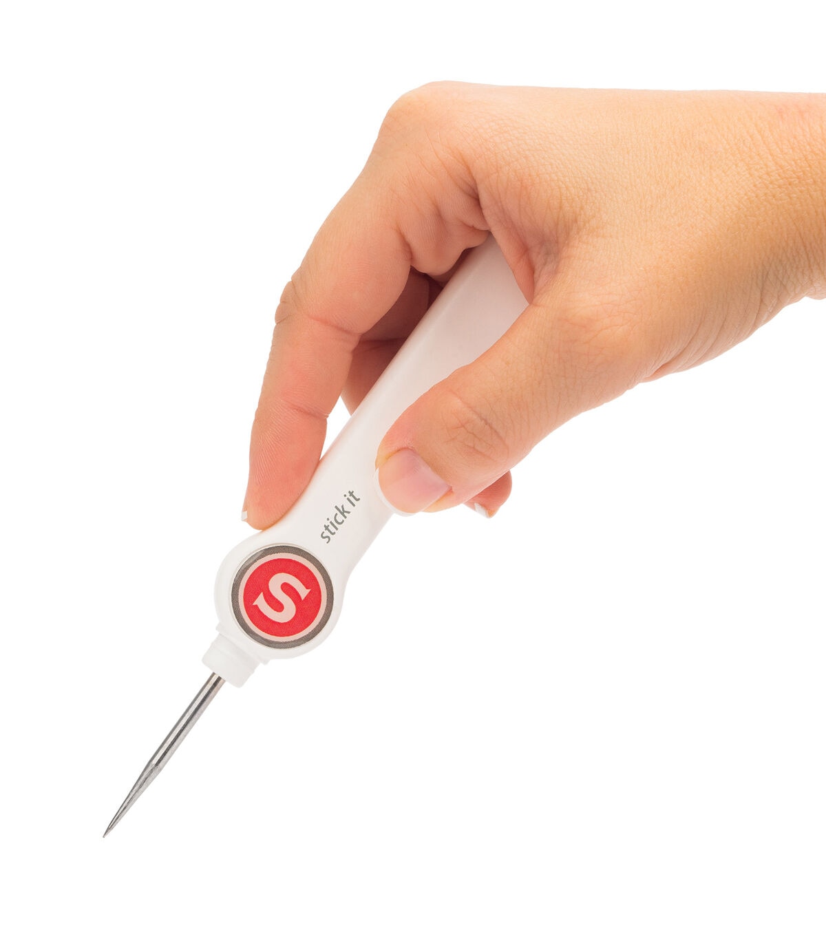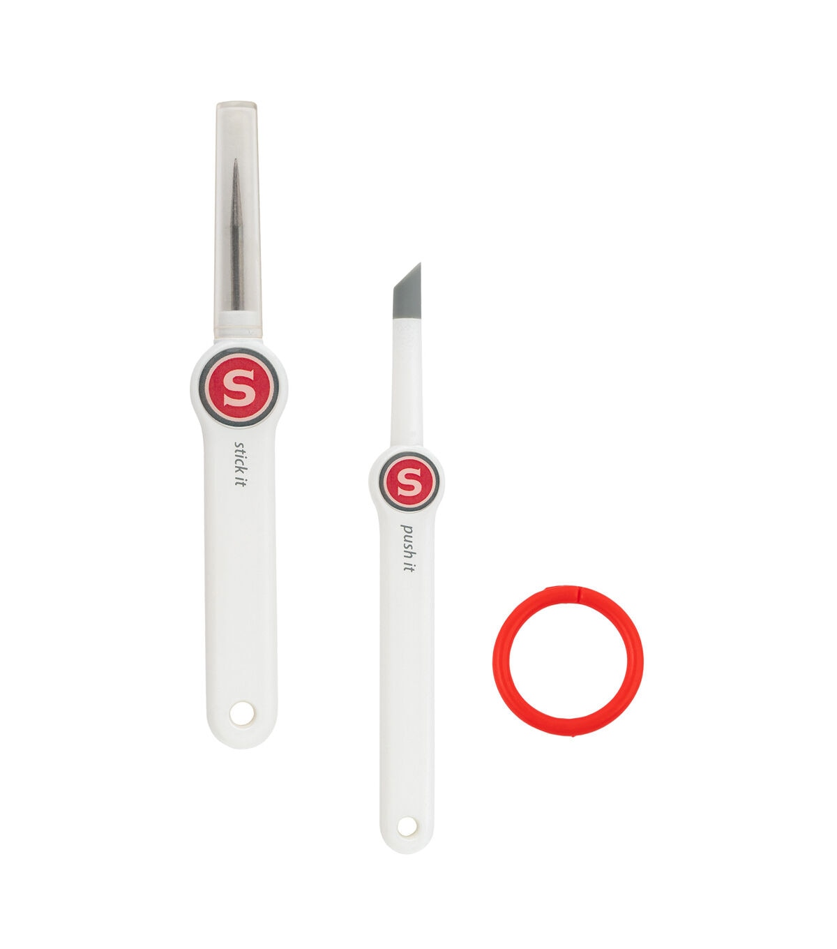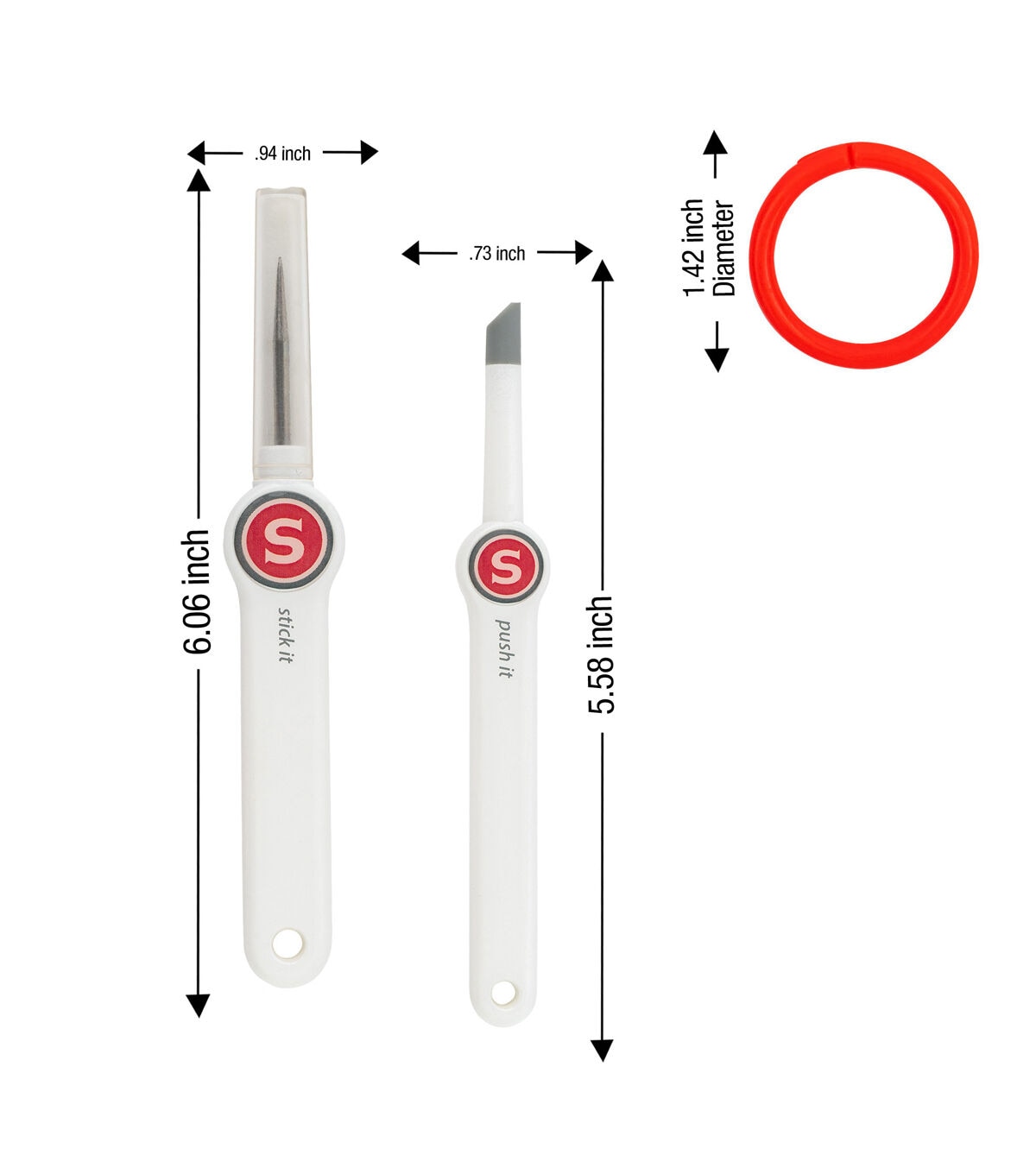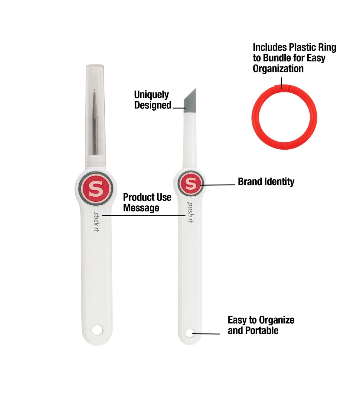 The SINGER Modern Maker Sewing Machine Tools Bundle brings together six quality sewing essentials for a variety of sewing tasks. Measuring 8.5” in length, the SINGER Fabric Scissors are professional dressmaker’s shears designed to cut easily and cleanly through any fabric. The SINGER Mini Detail Craft Scissors measure 4” in length and are designed for precision cutting projects from embroidery and applique work to scrapbooking and crafting. Both scissors feature durable stainless steel blades for long-lasting sharpness as well as matching gray and white comfort grip handles that are designed to be comfortably used by both right- and left-handed users. The handles are made from strong yet lightweight thermoplastic rubber (TPR) and feature added ribs for a more secure grip. Tongue-in-cheek messages printed on the handles – “Fabric ONLY” on the dressmaker’s shears and “Snip” on the mini detail scissors – help those household members who are not tailors or seamstresses to avoid mistaking one cutting tool for another and using scissors on the wrong material. The SINGER Comfort Seam Ripper features a sharp two-pronged blade that is ideal for cutting thread, opening stitched buttonholes, picking stitches, opening seams, as well as removing tags, snaps, and buttons from clothing – all without damaging the fabric. The seam cutter has a comfortable pink and white handle that’s easy to maneuver, and it also comes with a rubber safety cap that protects the point when not in use, keeping the blade sharp. The SINGER Stiletto and Awl Combo Pack is a set of two tools that feature sturdy, easy-to-maneuver, plastic handles with a bundling ring for easy organization. The stiletto tool features a rubber tip to securely grip fabric and gently ease it under a sewing machine’s needle. It can also be used for other gripping tasks, such as holding fabric edges and corners in place when ironing to prevent burning your fingers. The awl is a sharply pointed tool used for piercing fabric, leather, and other heavy materials. It is the perfect tool for starting or enlarging a hole, and it comes with a safety cap to cover the pointy tip when not in use. The handles bear the tongue-in-cheek usage directions of “stick it” and “push it.” The SINGER Sewing Needle Threaders can be used with both hand and machine needles for quick, easy threading every time. The threaders are designed with a sturdy backplate that easily guides the needle onto the threader and provides added durability to prevent the threader from becoming bent. When it’s time to cut the thread, simply turn the double-duty threader around and use the built-in thread cutter on the opposite side. This convenient sewing bundle provides a set of quality, must-have sewing tools to help you sew like a pro.