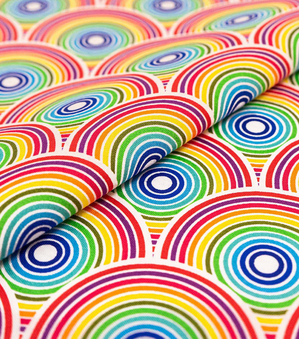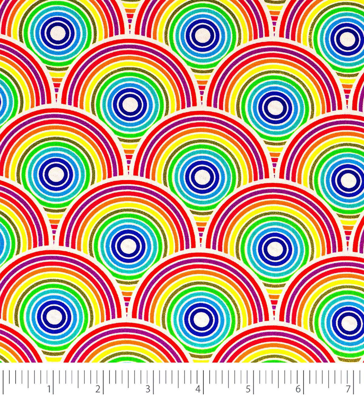 Add a splash of color to your project with our new SINGER® FABRICS 100% Ringspun print cotton fabric. Our SINGER® FABRICS, 100% Premium Cotton, Rainbow Circles, is perfect for quilting, apparel, and more! Perfect for all of your sewing and crafting projects. 100% Ringspun Cotton. 44 inches wide. Cut by the yard, can order single yard increments with 15 continuous yards maximum. Imported product. Not intended for children's sleepwear. Care: Machine wash gentle cold with like colors, nonchlorine bleach, tumble dry low, warm iron.