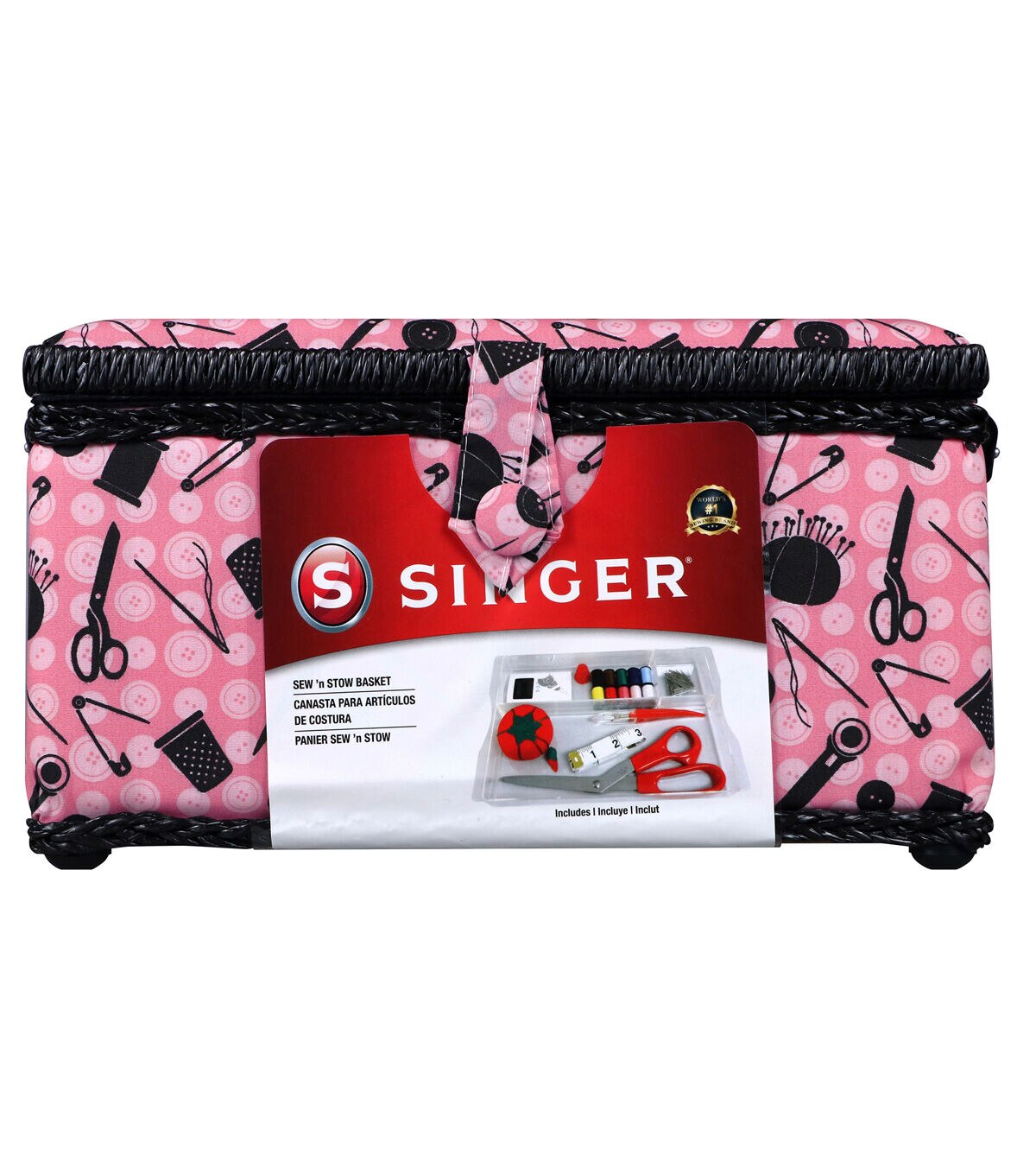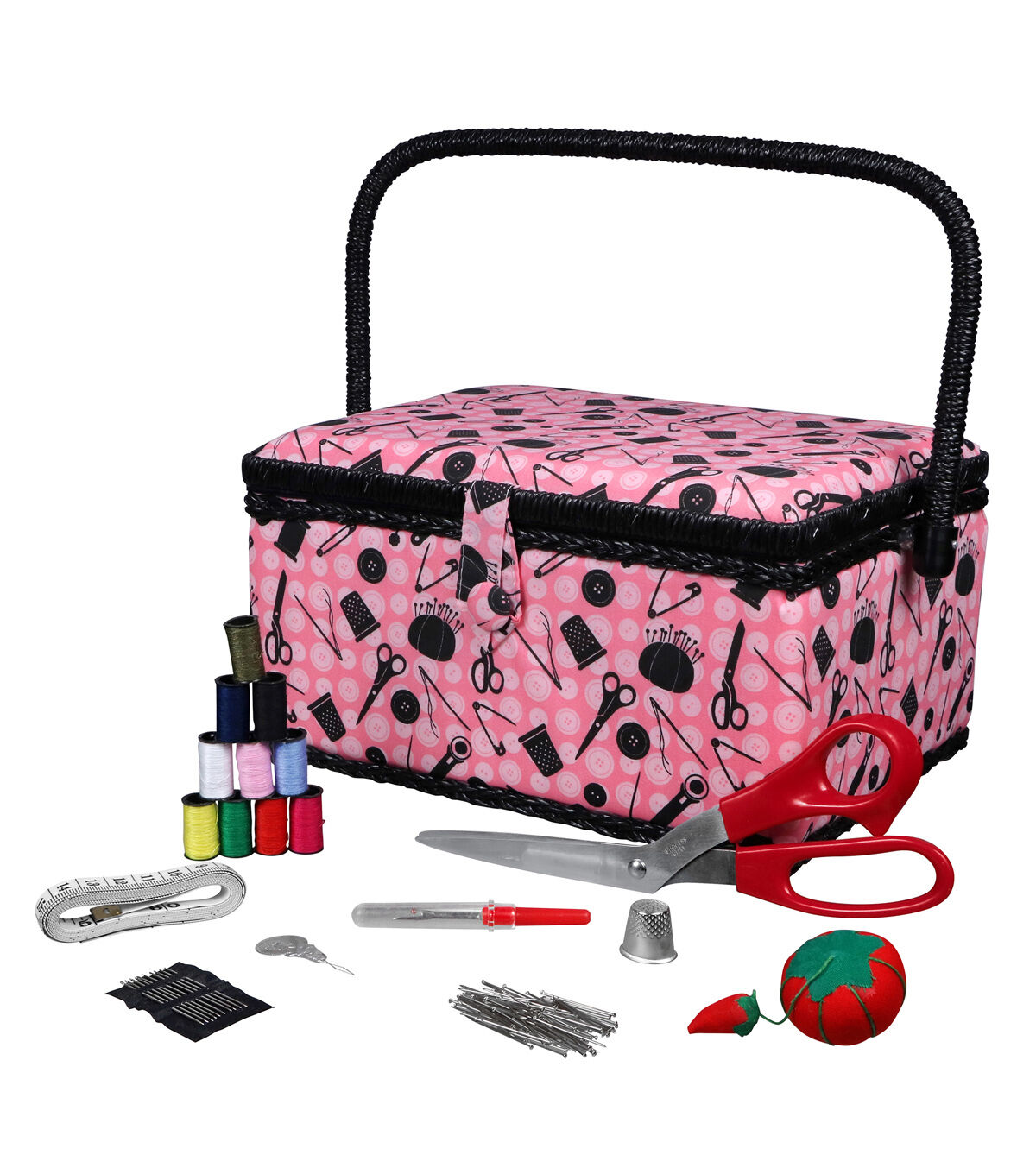 The SINGER Pink & Black Sewing Basket with Sewing Kit Accessories is the perfect beginner's gift or new addition to an existing collection. With ample storage and organization tray, the case offers a secure fastener and drop-down handle making it easily transported and stored. The basket comes with basic notions, including 10 assorted hand needles, 100 dressmaker pins (size 17, 1 1/16 inch), 5-inch fabric scissors, 10 mini thread spools (10 yards each) needle threader, pin cushion, seam ripper, 60-inch tape measure and a thimble.