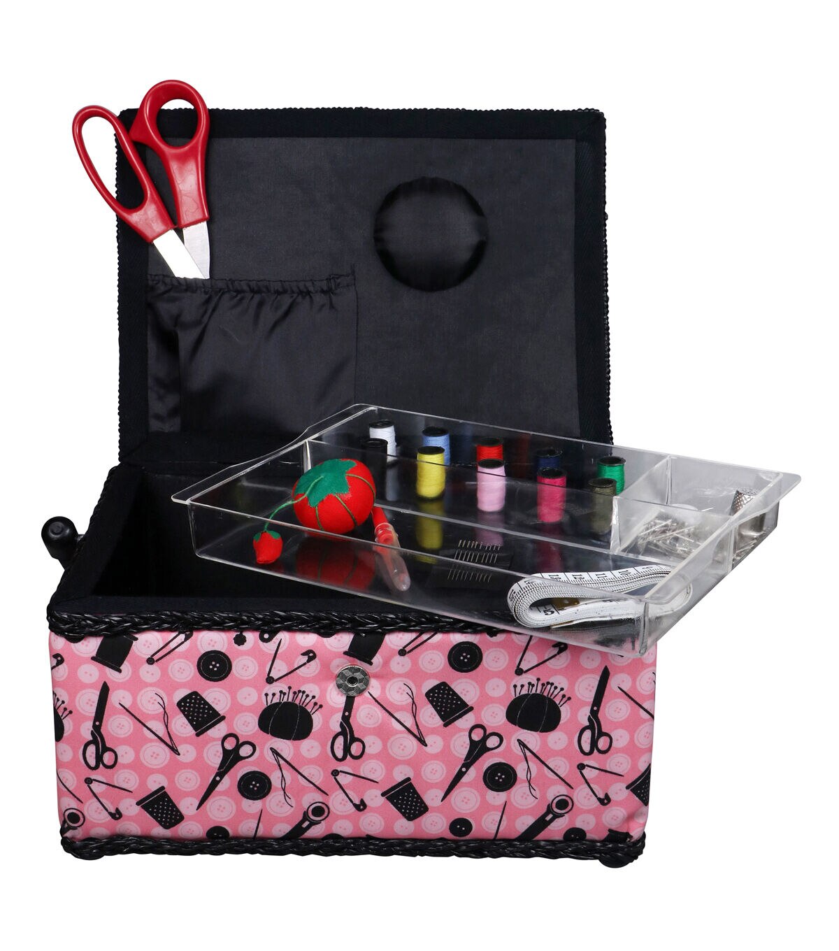 - Large classic sewing basket in pink and black sewing notions print with bonus notions pack
