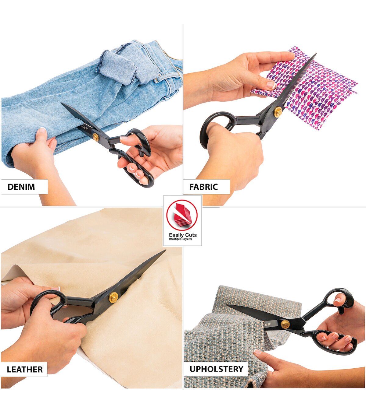 These sturdy fabric scissors measure ten inches in length and feature razor-sharp blades designed to easily cut through multiple layers of fabric with extraordinary precision, saving you time on large sewing projects without sacrificing precise cuts. Made from high performance, forged stainless steel, the blades cut precisely and stay sharp longer than regular scissors. The handle features a rubber coating and an ergonomically curved design that come together to deliver a solid, comfortable grip, allowing you to easily cut fabrics for an extended period of time without discomfort. The blades are chrome plated for extra durability, and they have an oxidized black matte finish to give them a sleek, professional look. For best performance, oil joints regularly and keep scissors clean and moisture free. Never use them to cut materials for which they are not designed.