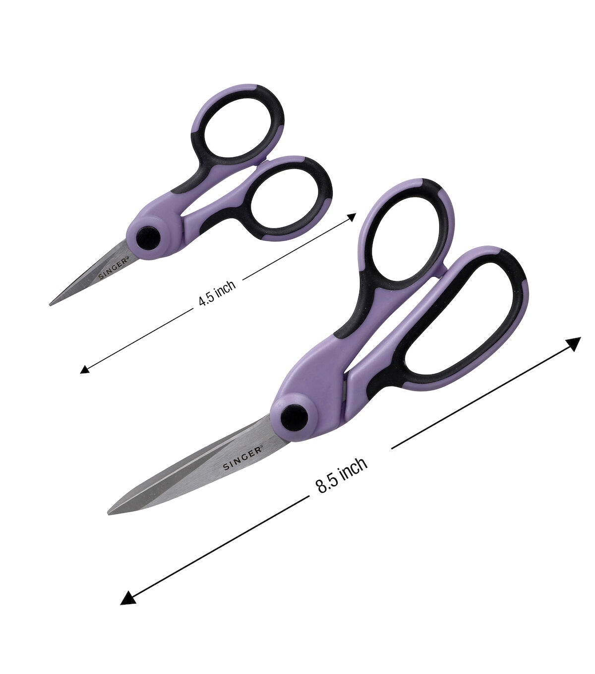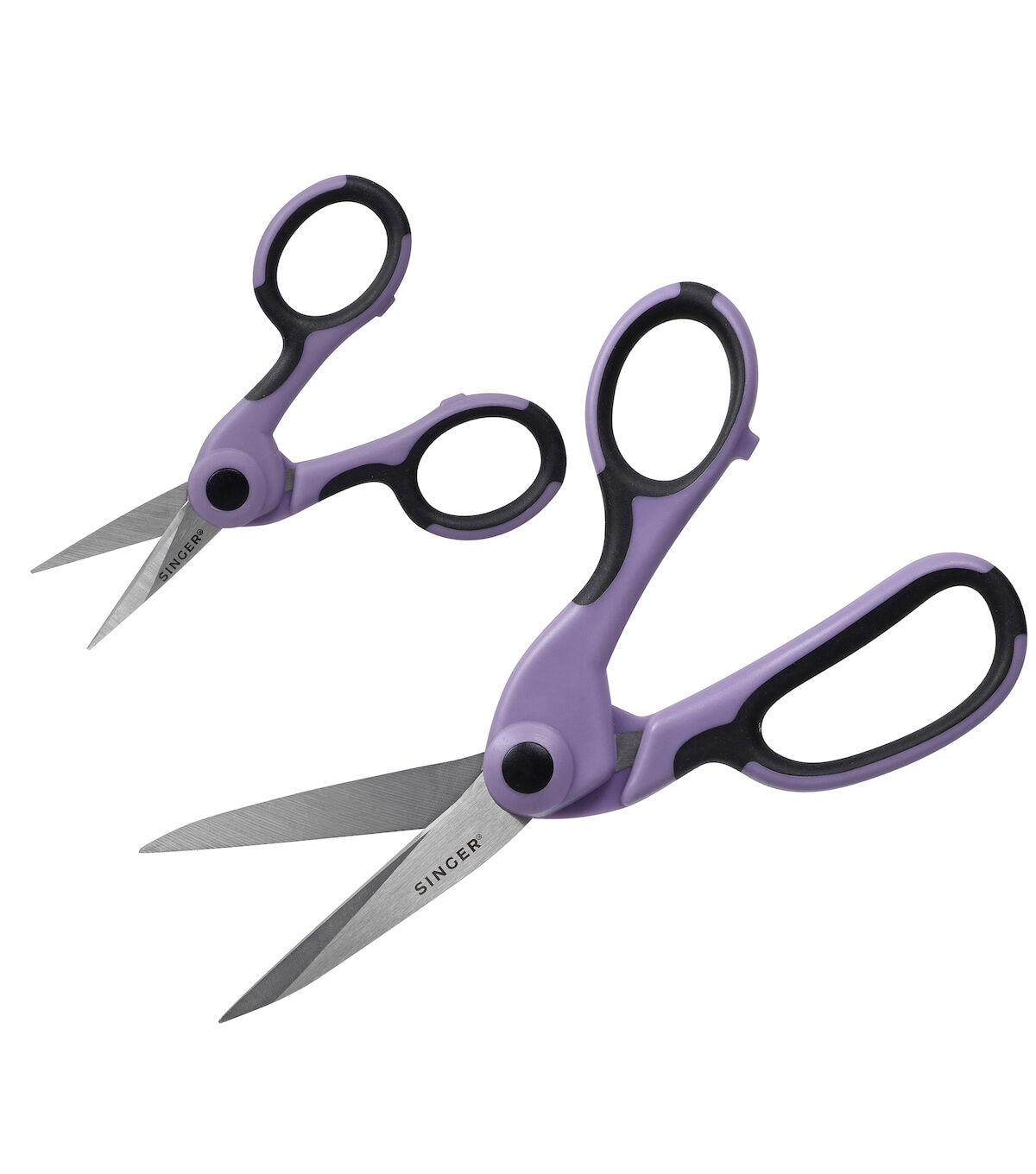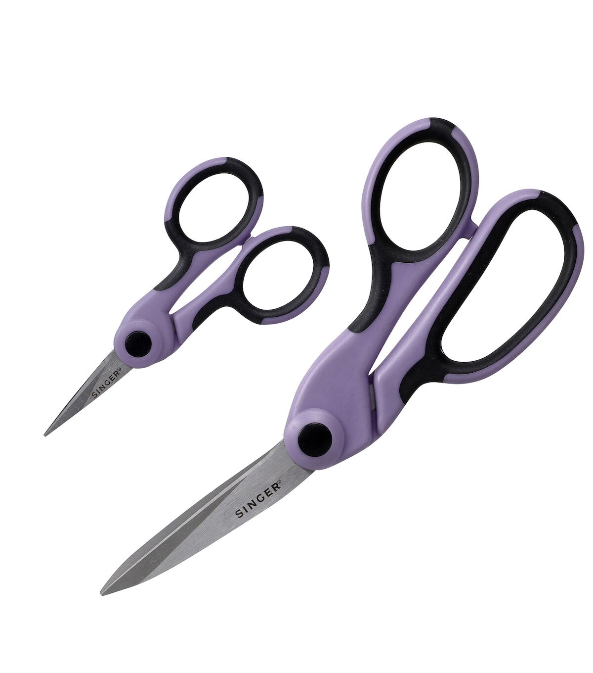 The SINGER ProSeries 2 Piece Scissor Set is a set of two professional sewing and craft cutting tools backed by lifetime guarantees. Crafted from tempered stainless steel for increased sharpness, maximum strength, and longer life, the durable, precision blades of these professional-grade scissors are ground on both sides to for smooth cutting and rust prevention. Each blade is individually inspected and hand tested to ensure the highest of quality. Ergonomically designed for prolonged cutting, each pair of shears feature gorgeous lilac and black comfort grip handles that can be used comfortably by both right- and left-handed users. The largest of the set are the 8.5” Heavy Duty Bent Scissors, professional dressmakers’ shears designed to cut easily and cleanly through multiple layers of fabric. The 4.5” Craft Scissors are small precise detail scissors with a NANO Tip for intricate detail cutting work like embroidery, applique and more. The Singer ProSeries 2 Piece Scissor set in Lilac is the perfect addition to any seamstress’s collection. Use scissors only on what they are designed to cut. Oil joints regularly and keep scissors clean and moisture free for best results. Perfect for teens and adults.