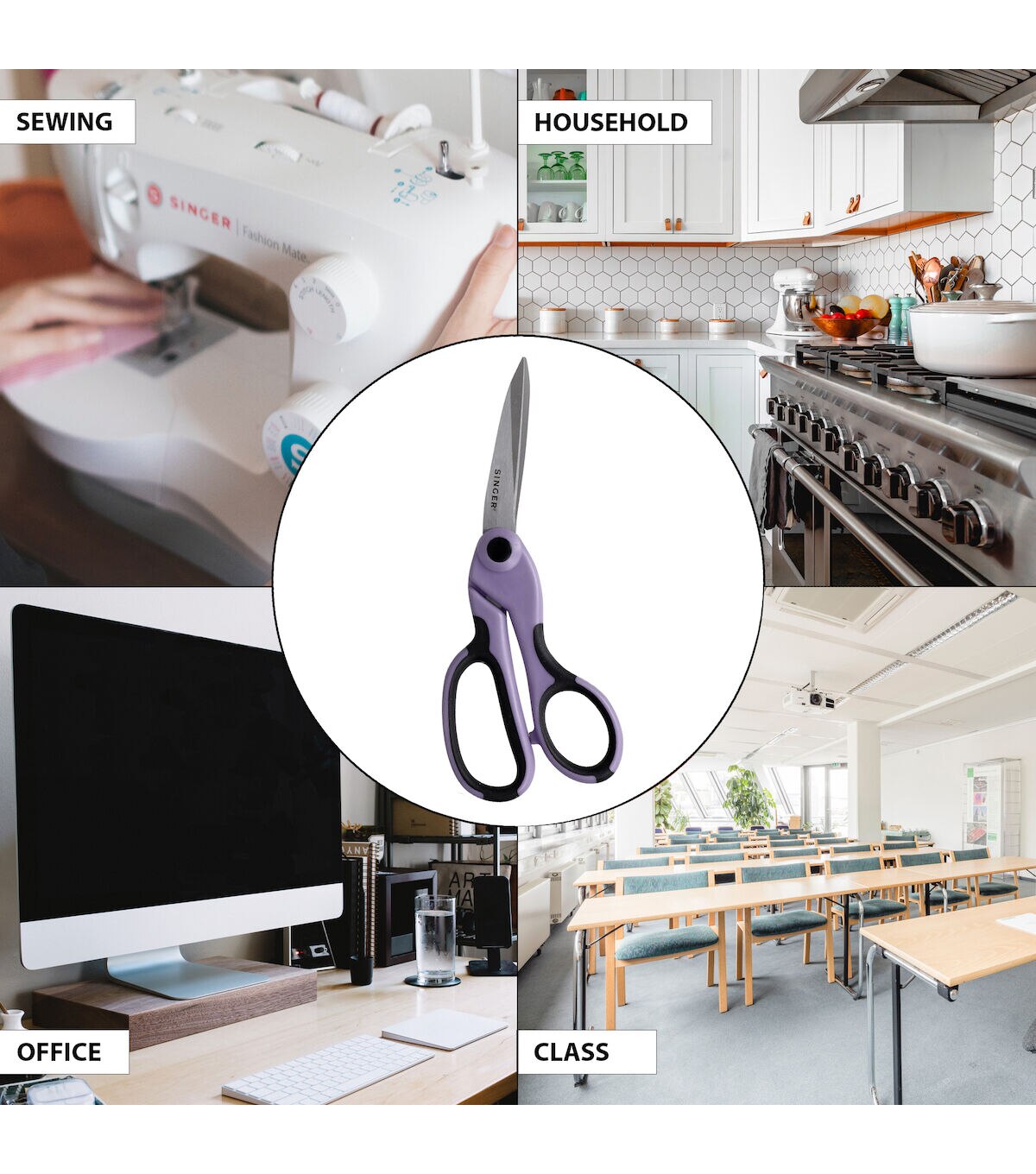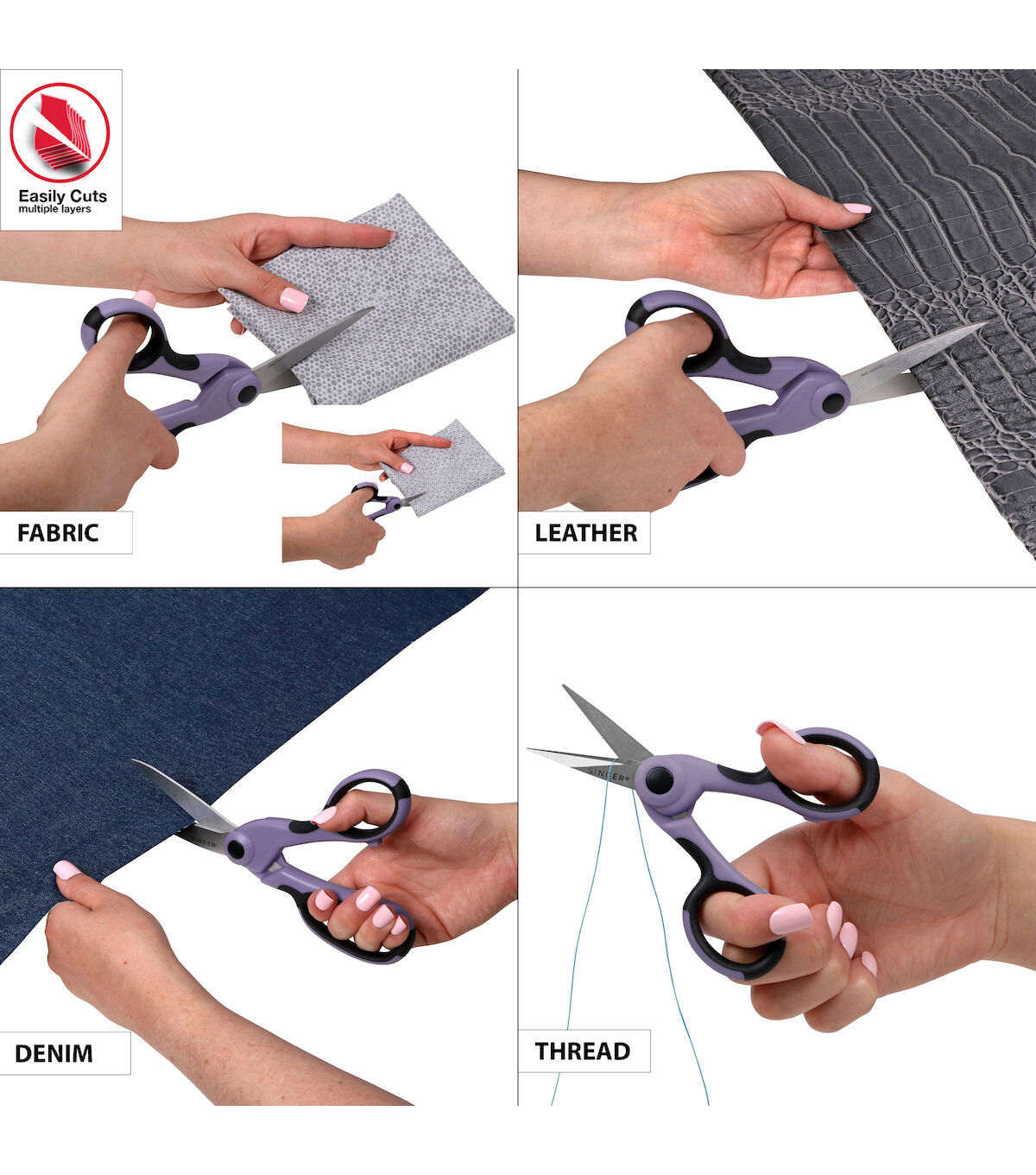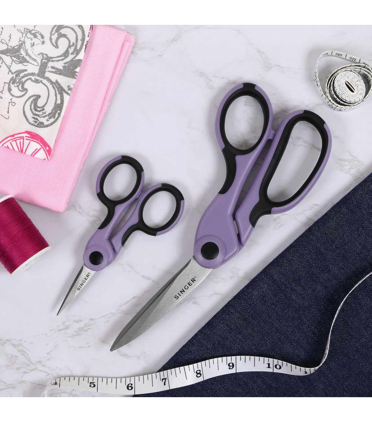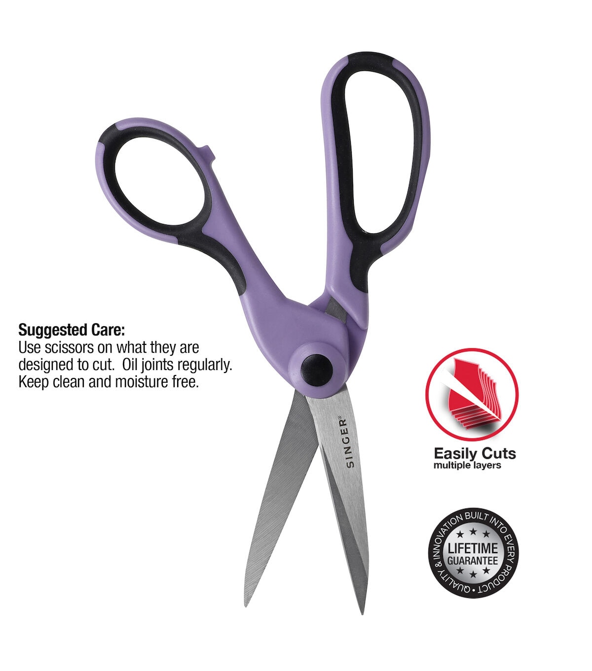 The SINGER ProSeries 2 Piece Scissor Set is a set of two professional sewing and craft cutting tools backed by lifetime guarantees. Crafted from tempered stainless steel for increased sharpness, maximum strength, and longer life, the durable, precision blades of these professional-grade scissors are ground on both sides to for smooth cutting and rust prevention. Each blade is individually inspected and hand tested to ensure the highest of quality. Ergonomically designed for prolonged cutting, each pair of shears feature gorgeous lilac and black comfort grip handles that can be used comfortably by both right- and left-handed users. The largest of the set are the 8.5” Heavy Duty Bent Scissors, professional dressmakers’ shears designed to cut easily and cleanly through multiple layers of fabric. The 4.5” Craft Scissors are small precise detail scissors with a NANO Tip for intricate detail cutting work like embroidery, applique and more. The Singer ProSeries 2 Piece Scissor set in Lilac is the perfect addition to any seamstress’s collection. Use scissors only on what they are designed to cut. Oil joints regularly and keep scissors clean and moisture free for best results. Perfect for teens and adults.