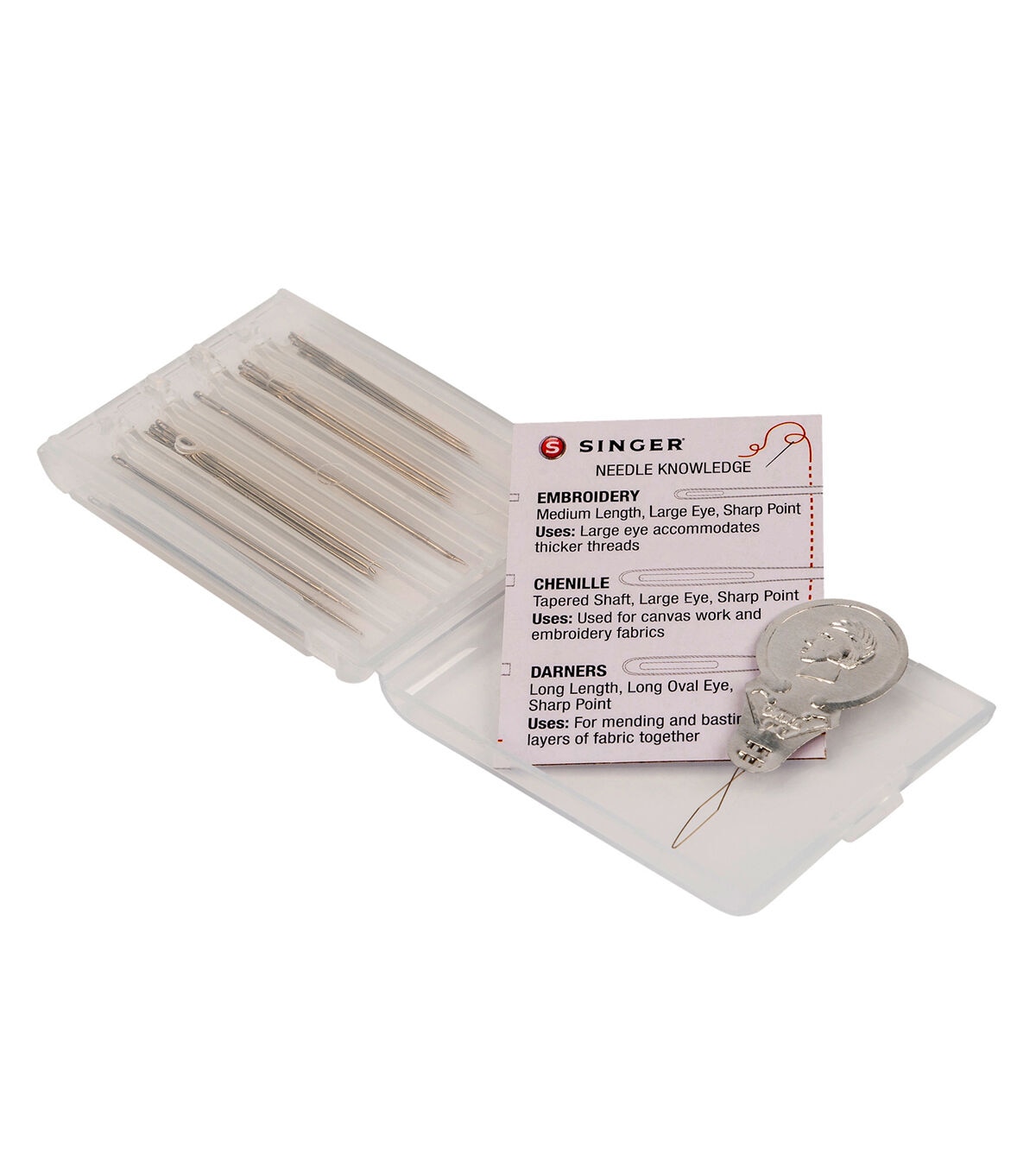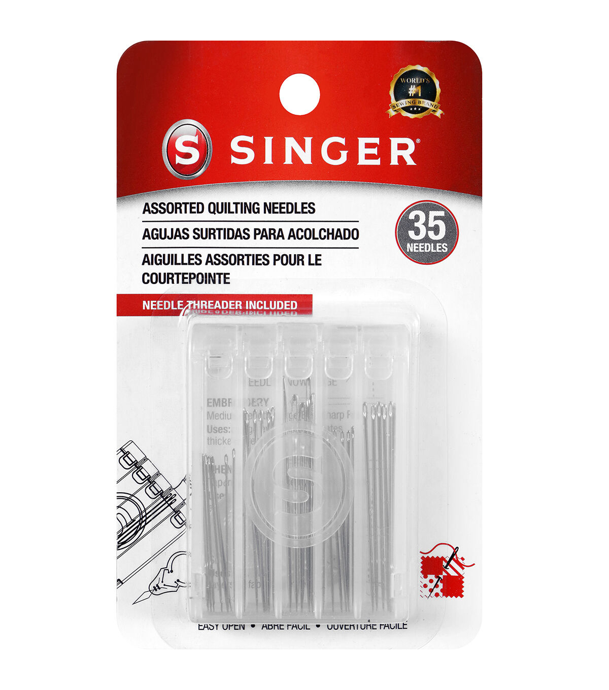 The Singer Assorted Quilting Needles with Threader will make a great starter pack for budding sewing enthusiasts and crafters. This kit includes 35 assorted hand needles including betweens, darners, embroidery needles and sharps in sizes two to seven. They come in a safe and secure click-to-open compact case also known as a Dial-a-Needle case. A bonus needle threader is also included in this kit.