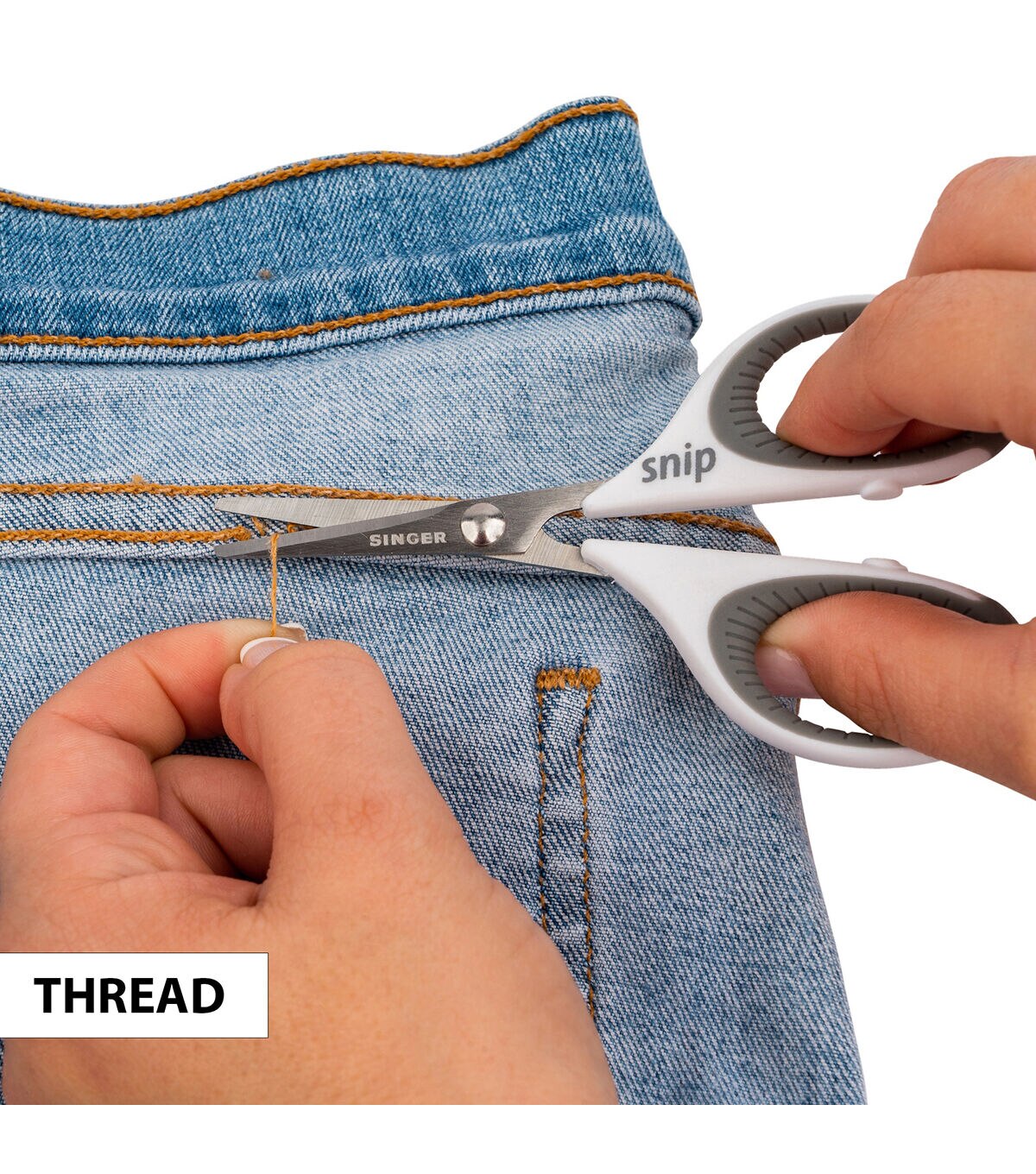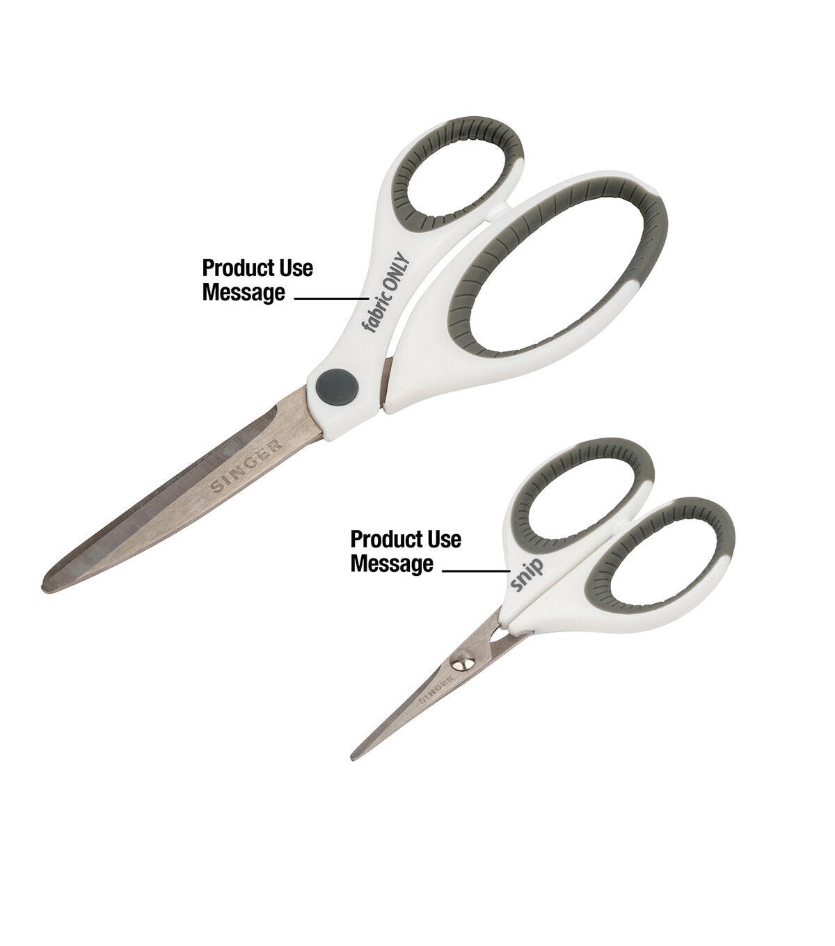 - “Fabric ONLY” and “Snip” are imprinted on the respective handles for a tongue-in-cheek way to help family members know which scissors to use for each purpose