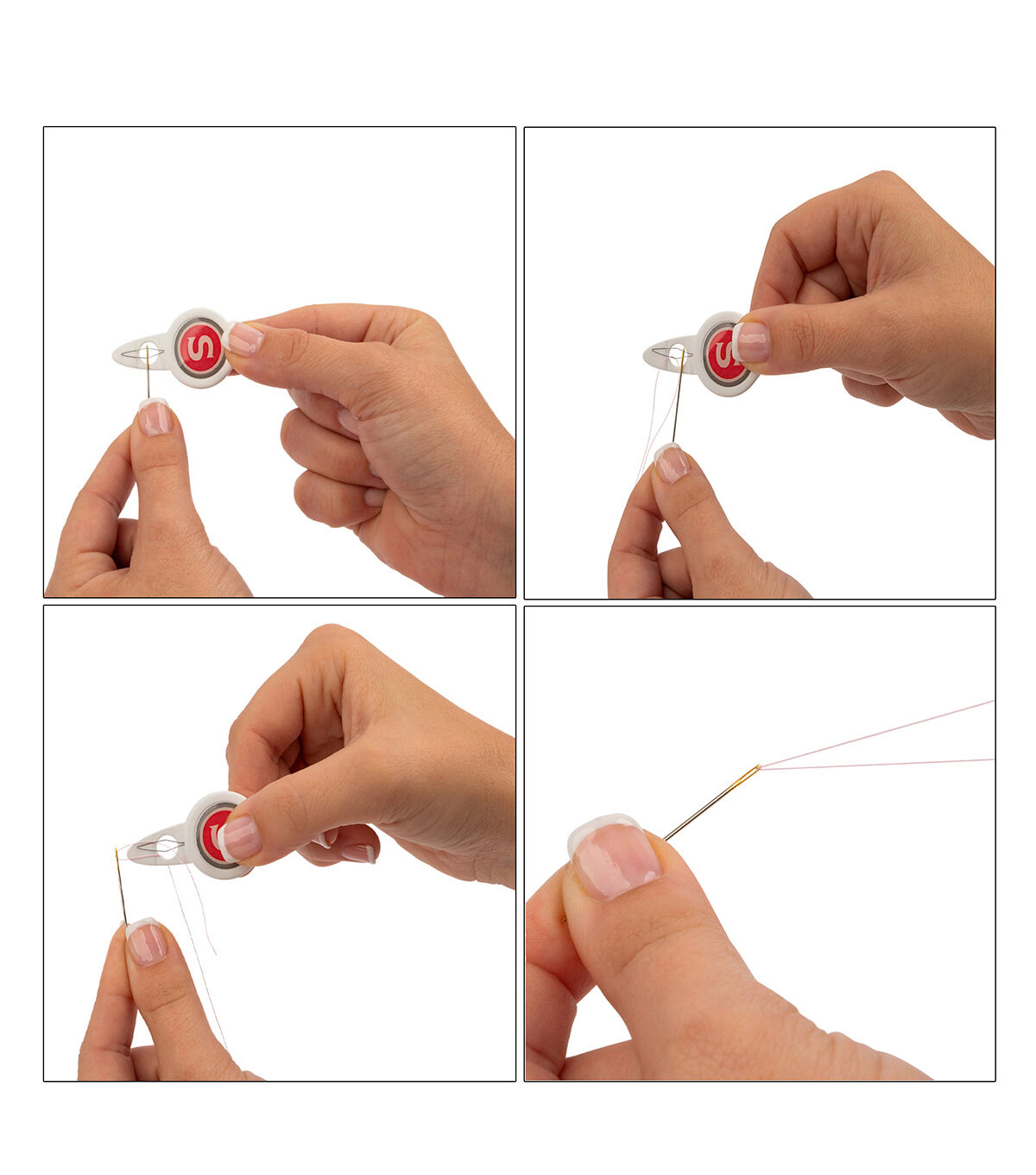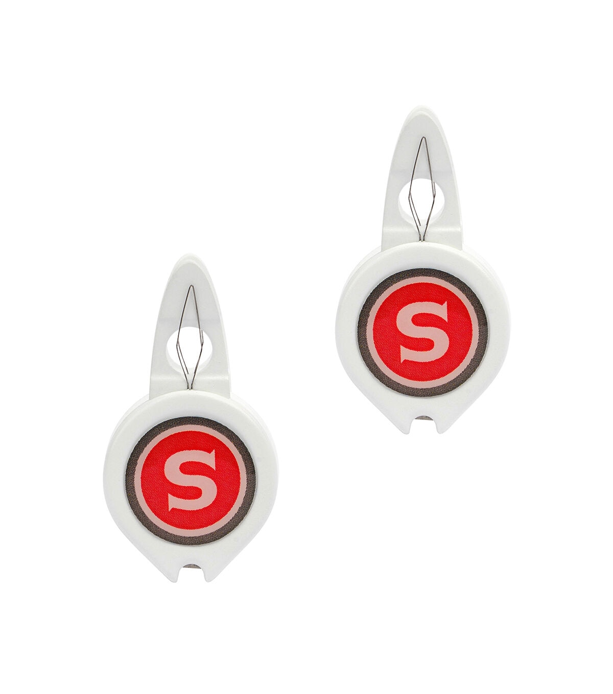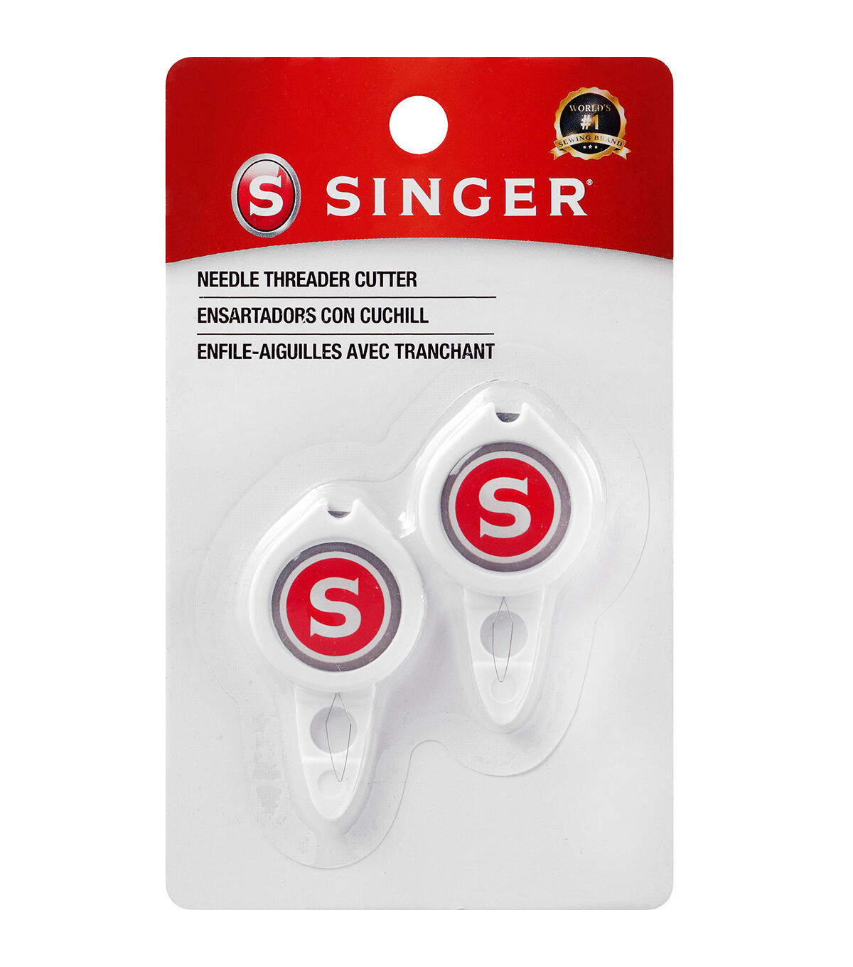 Make the Singer Needle Threaders with Built-in Thread Cutter a part of your needlework supplies. It comes with two versatile sewing tools that are built for durability. Each sewing needle threader is designed with a sturdy backplate that easily guides the needle onto the threader, while also providing added durability to keep the wire threader from bending. The backplate’s circular hole acts as a target to help position the thread more precisely while the threader works well for both sewing machine needles as well as needles for hand sewing. When it’s time to cut the thread, simply turn the threader around and use the built-in thread cutter on the opposite side to do the job - two functions in the same tool. This set of two threaders per pack allows you to keep one in your hand sewing kit and one at your sewing machine for quick, easy threading every time.