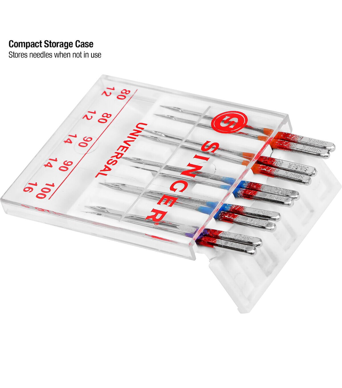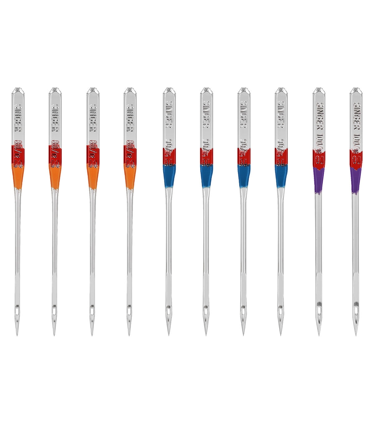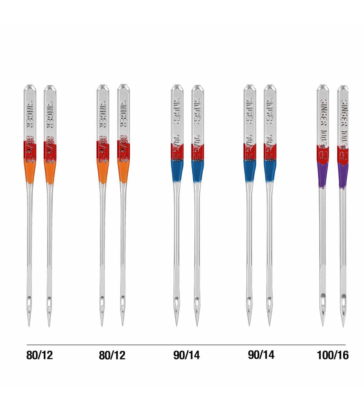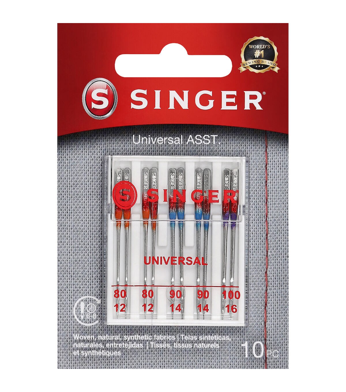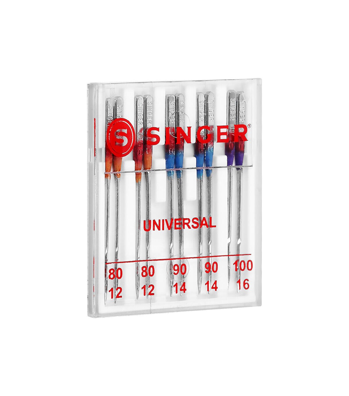 The Singer Assorted Universal Regular Point Machine Needles will allow you to use multiple standard stitching techniques on woven fabrics. These all-purpose needles are color coded to their sizes, making them easy to identify and they come in a convenient plastic container with size markers on the clear cover. They are compatible with standard sewing machines. Use the orange-colored needles in size 80/11 on lightweight woven fabrics, blue-hued needles in size 90/14 on medium-weight woven fabrics and purple-toned needles in size 100/16 on heavyweight woven fabrics. This pack includes 10 regular-point machine needles.