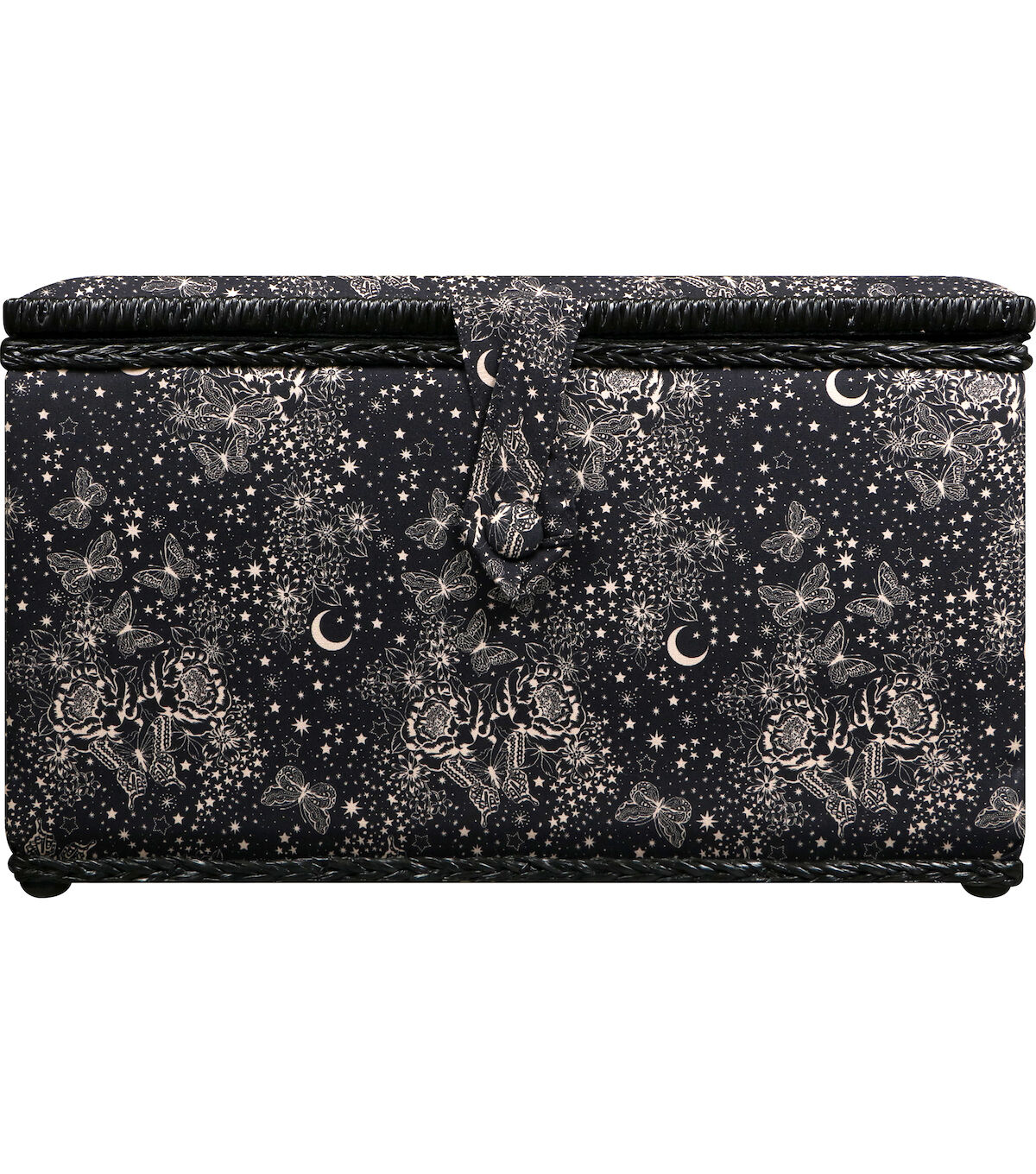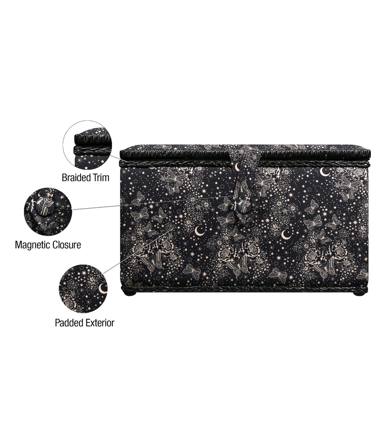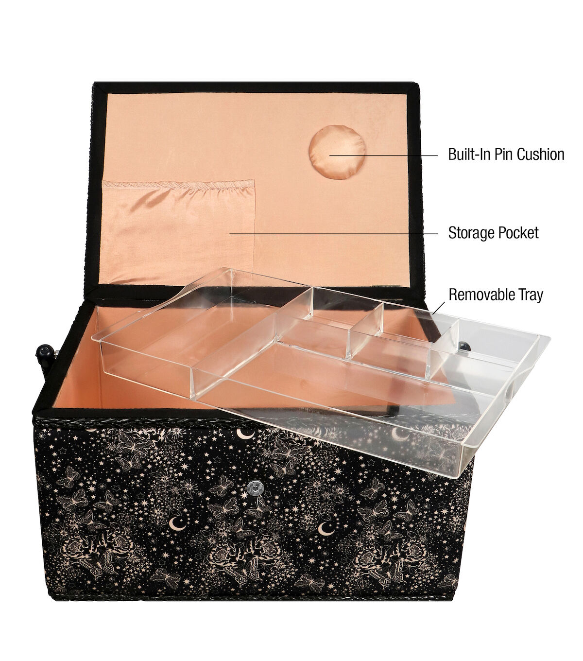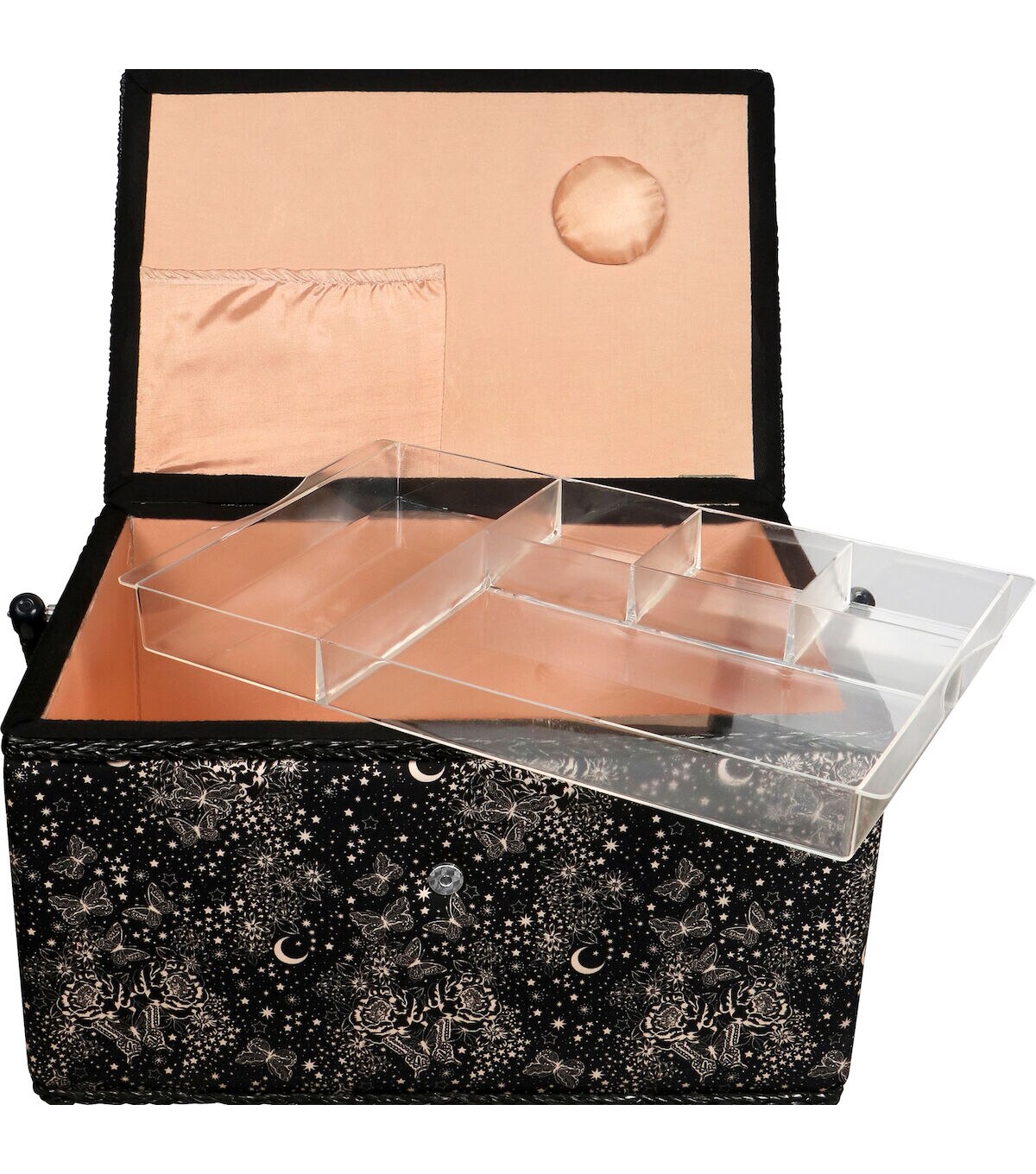- Decorative sewing basket provides ample storage for all your sewing essentials featuring a black and white celestial butterfly printed travel case with a blush silken polyester interior