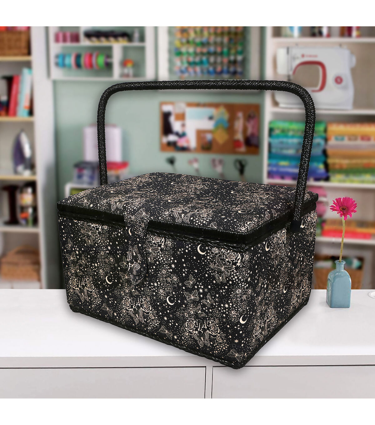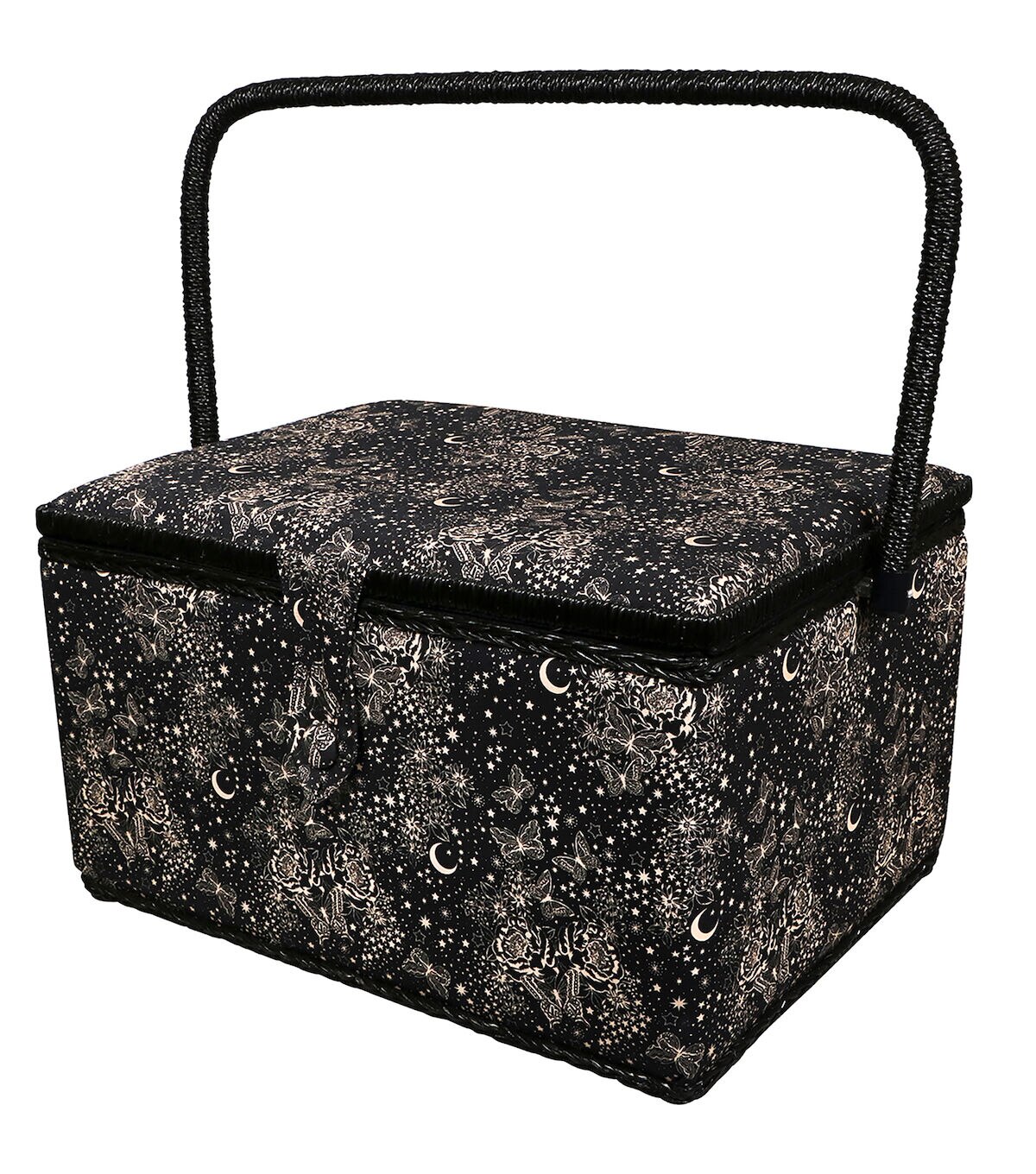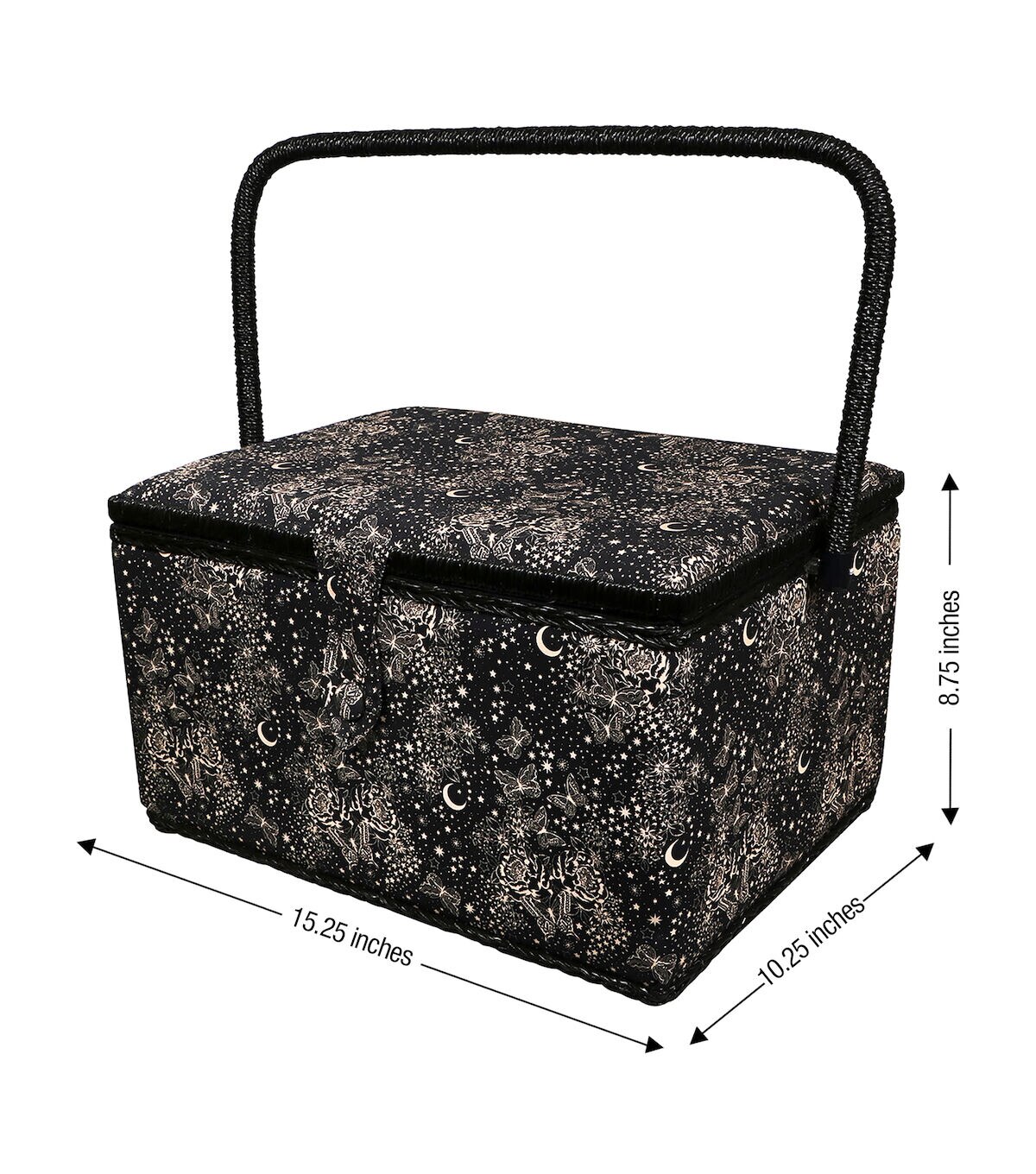 The SINGER Extra Large Sewing Basket in Black & White Celestial Print is an ideal sewing kit for beginners. Measuring 14.2" wide by 9.64" deep and standing 8.75" high, this sewing basket is large enough to fit sewing needles, thread, bobbins, and an assortment of sewing accessories and tools. The basket is covered in a high quality, wrinkle-free fabric in a black and white print featuring butterflies, the moon, and the stars. Its sturdy frame and matching collapsible handle make the sewing kit easy to store and an ideal travel case to carry your essentials for sewing projects on the go. The kit has a magnetic button closure to keep contents secure, and it contains a removable hard tray insert that offers extra storage space and keeps your sewing supplies neat and organized. This versatile storage basket also doubles as a stylish storage container for bobbins, crafting tools, scrapbooking supplies, colored beads, art supplies, costume jewelry, or beauty products. With so many ways it can be used, buy one for each of the areas you want to organize. This is the perfect sewing basket for easy travel, ample storage, and optimal organization.
