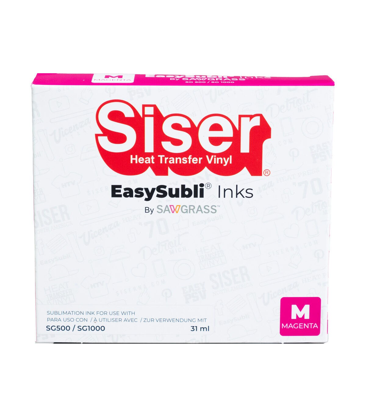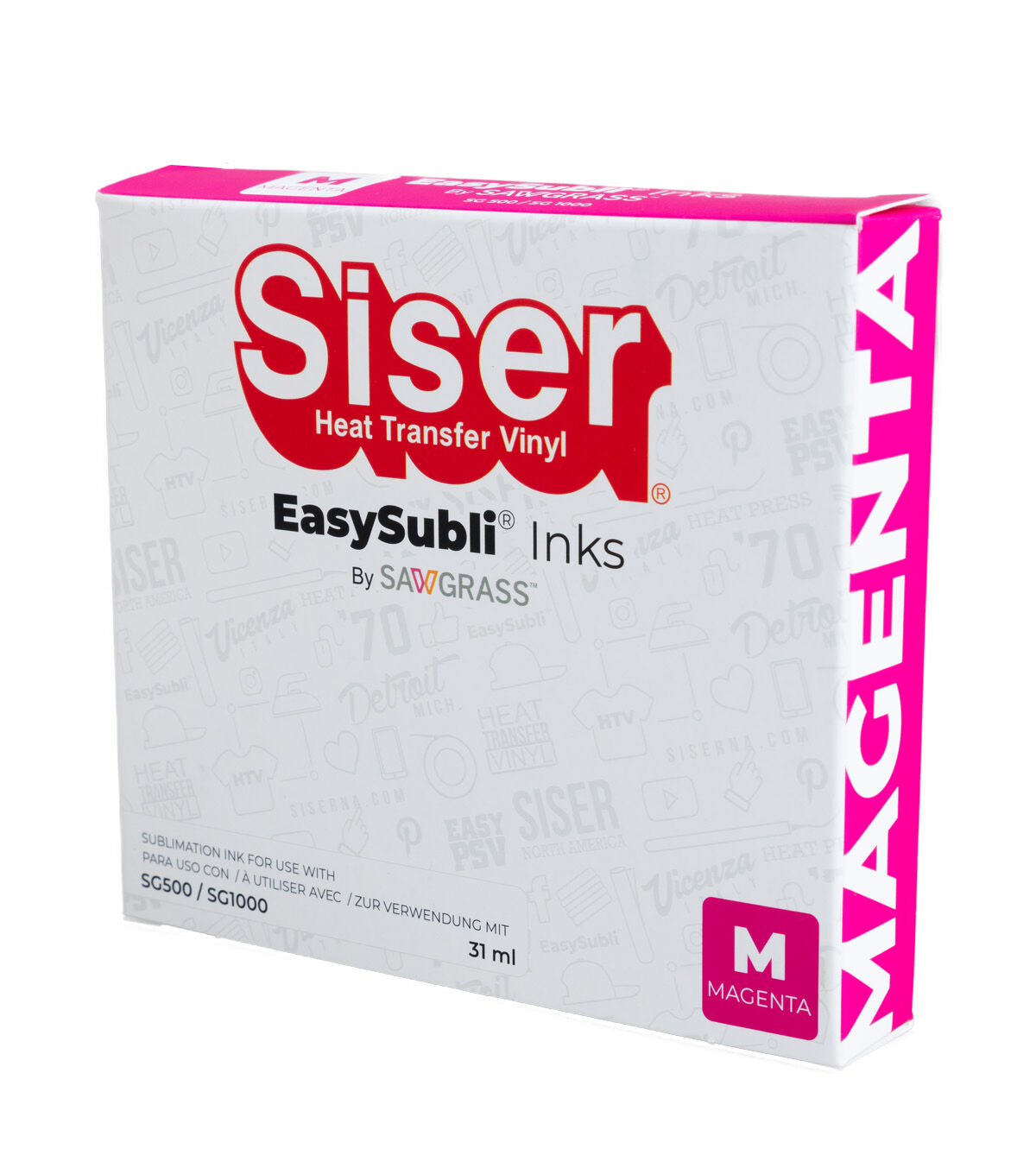 EasySubli Magenta Ink is used to help you achieve a vast array of pinks and reds with HD quality in your designs. EasySubli inks were specially formulated to work with the SG500 printer. The printer requires four colors which are in individual easy-to-install no mess cartridges: Cyan, Magenta, Yellow, and Black.