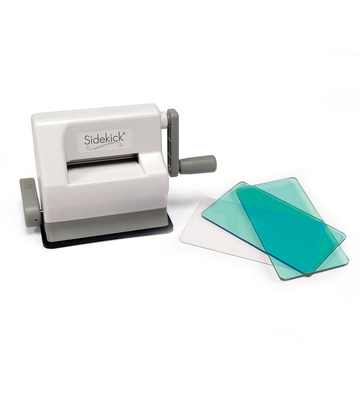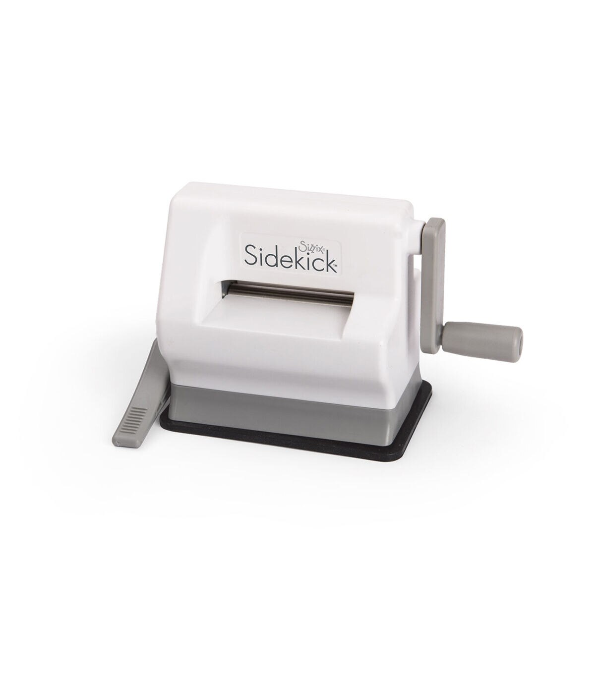 Sizzix-Sidekick Starter Kit. This portable, affordable and adorable crafting system designed for detailed (plastic backed or wafer-thin) dies and embossing folders up to 2.5 inches wide, including Sizzix 12 inch Decorative Strip dies. The Sidekick will cut a single sheet of lightweight to cardstock paper. Aqua cutting pads and embossing pad makes all Sizzix thin dies and embossing folders up to 2.5 inches compatible and works with other brands' dies.This small roller machine weighs 2 pounds, stands 4.75 inches tall and features a three-year limited warranty. This package contains one Sidekick machine, six Framelits dies, two Thinlits dies, two small Textured Impressions embossing folders and seven stamps. WARNING: Choking Hazard, small parts. Imported. For returns, all electronics and machines must be new, in a sealed box. Please work directly with the manufacturer if products are damaged upon purchase, or become defective within the warranty periodClick here for Warranty Information: