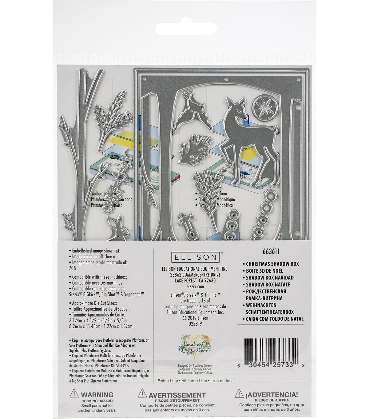 Thinlit dies offer a variety of affordable solo options or multi die options. Thinlits are easy to use and are compact and portable. These dies are compatible with Sizzix BIGkick, BigShot, and Vagabond. This package contains Christmas Shadow Box: a set of 20 metal dies measuring between .5x.625 inches and 3.25x4.5 inches. Designer: Courtney Chilson. WARNING: Choking Hazard. Not suitable for children under 3 years. WARNING: Cut Hazard, Sharp Blade. Imported.