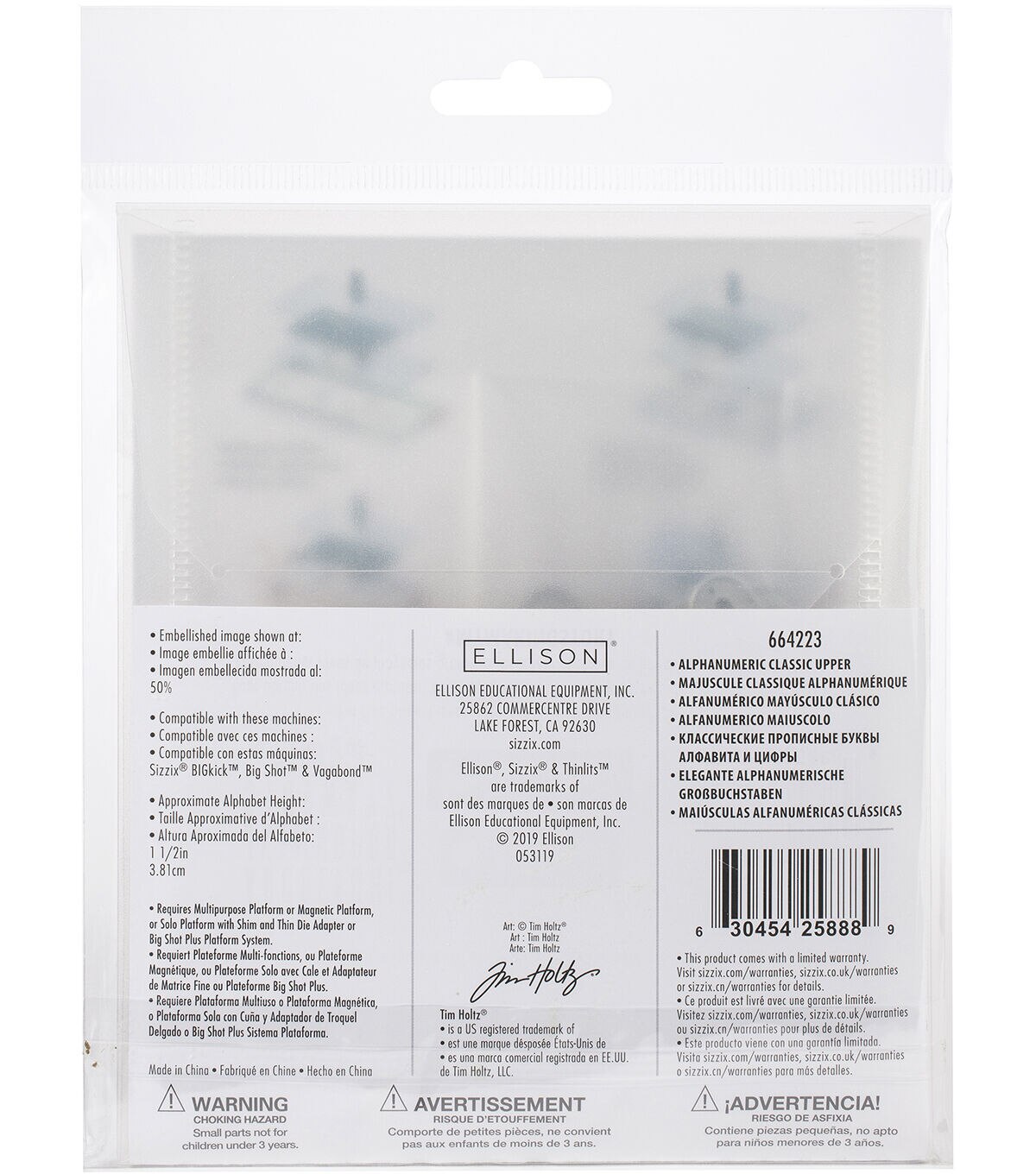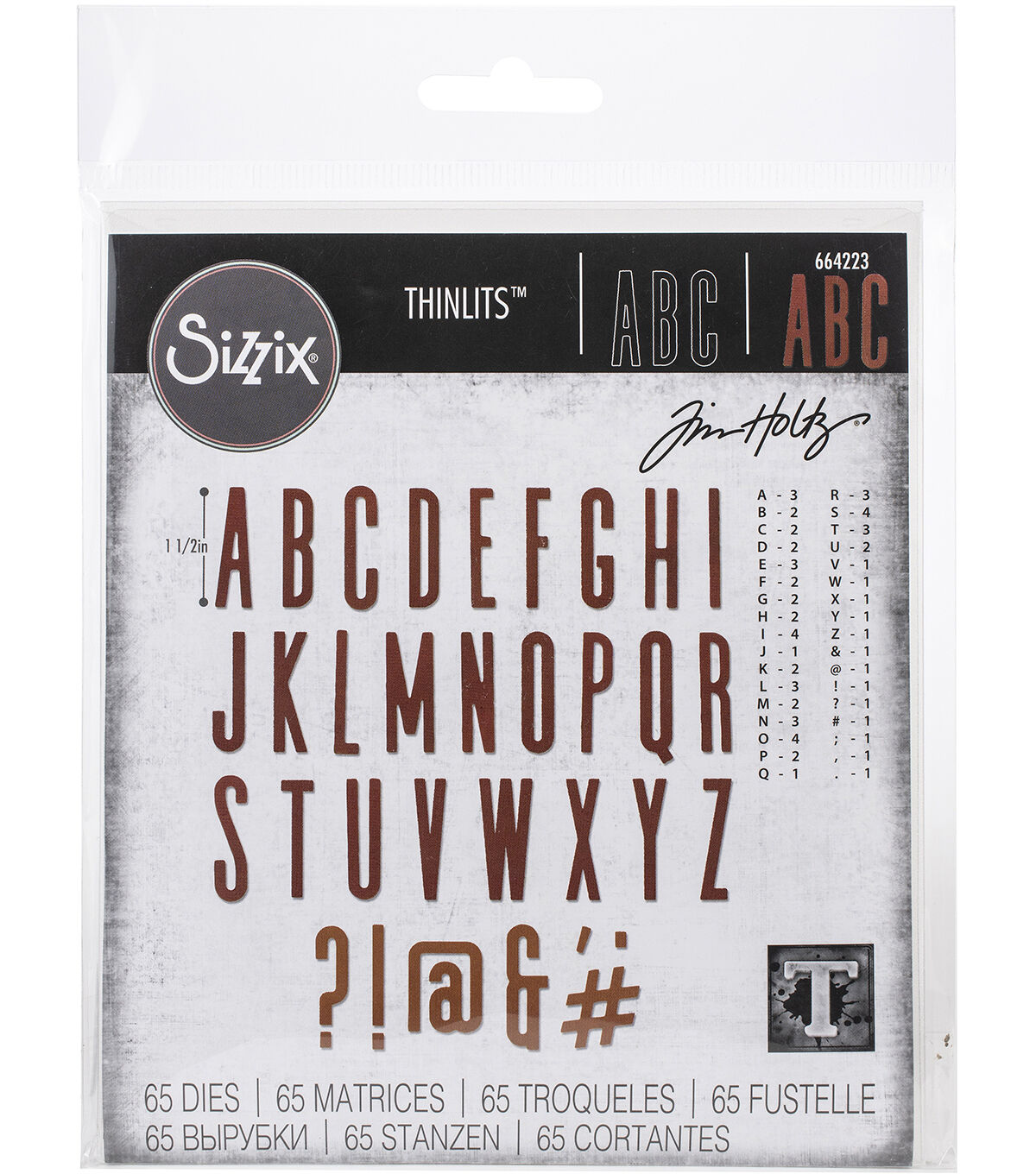 Thinlit dies offer a variety of affordable solo options or multi die options. Thinlits are easy to use and are compact and portable. These dies are compatible with Sizzix BIGkick, BigShot, and Vagabond. This package contains Alphanumeric, Classic Upper: a set of 65 metal dies. Approximate alphabet height: 1.5 inches. Designer: Tim Holtz. WARNING: Choking Hazard. Not suitable for children under 3 years. WARNING: Cut Hazard, Sharp Blade. Contact may result in injury. Always keep blades away from fingers and body. Handle with Care. Keep out of reach of children. Imported.