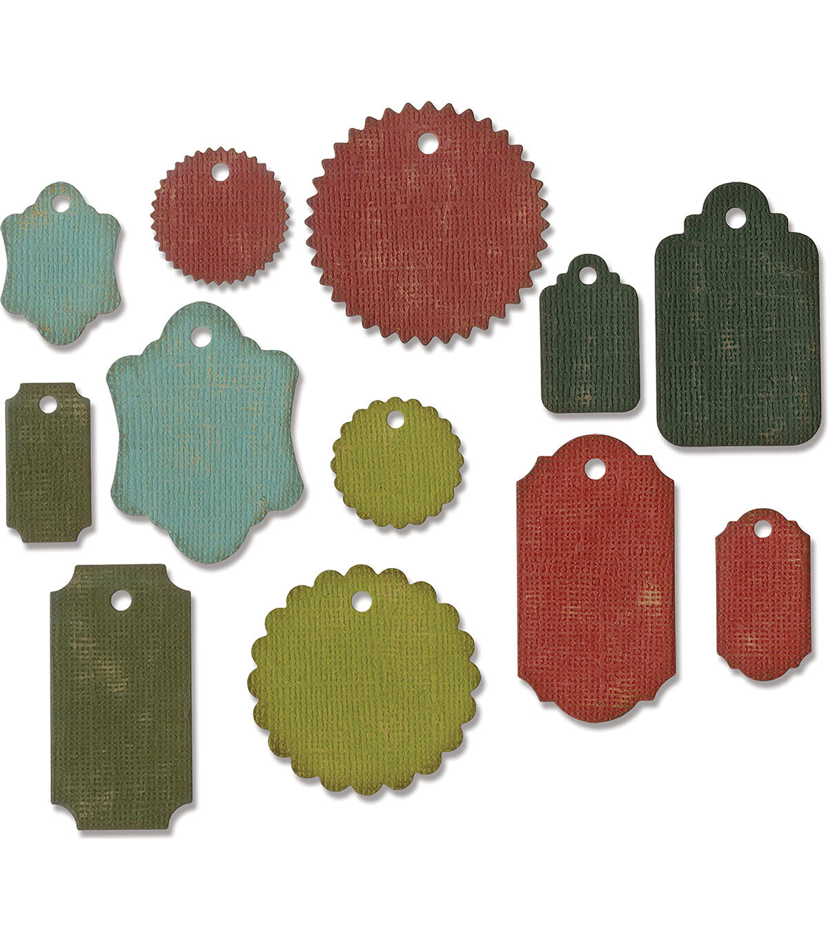 Thinlit dies offer a variety of affordable solo options or multi die options. Thinlits are easy to use and are compact and portable. These dies are compatible with Sizzix BIGkick, BigShot and Vagabond. This package contains 12 dies. Design: Gift Tags measuring between .625x1.125 inches and 1.75x1.75 inches). Designer: Tim Holtz. WARNING: Choking Hazard- small parts. Not for children under 3 years. Imported.