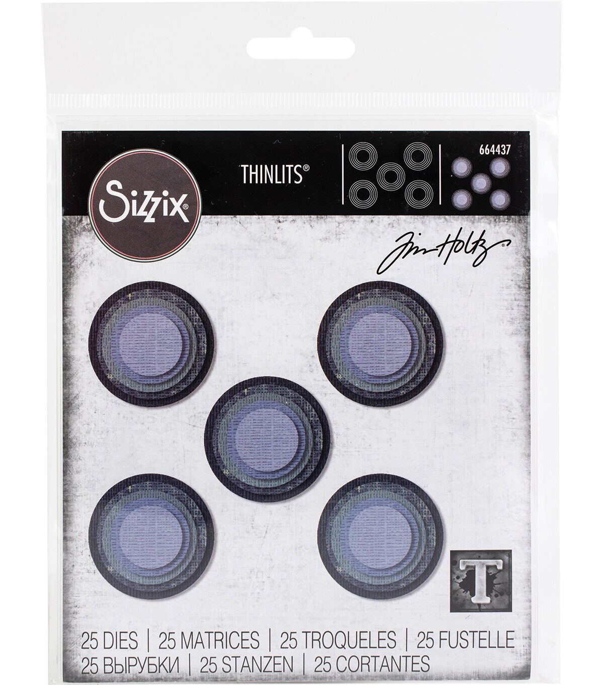 Thinlit dies offer a variety of affordable solo options or multi die options. Thinlits are easy to use and are compact and portable. These dies are compatible with Sizzix BIGkick, BigShot, and Vagabond. This package contains Stacked Circles: a set of 25 metal dies measuring between .875x.875 inches and 1.75x1.75 inches. Designer: Tim Holtz. WARNING: Choking Hazard. Not suitable for children under 3 years. WARNING: Cut Hazard, Sharp Blade. Contact may result in injury. Always keep blades away from fingers and body. Handle with Care. Keep out of reach of children. Imported.