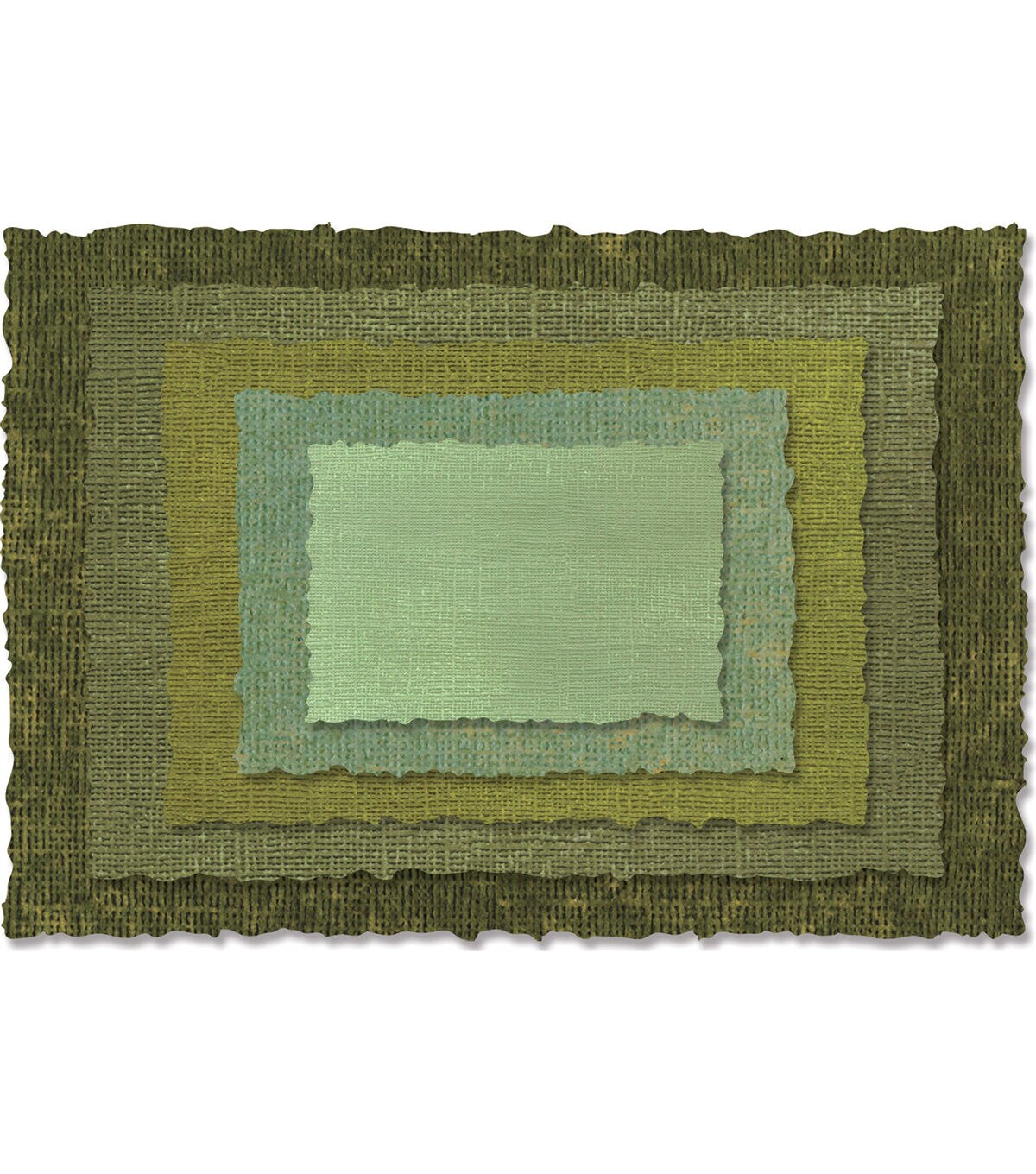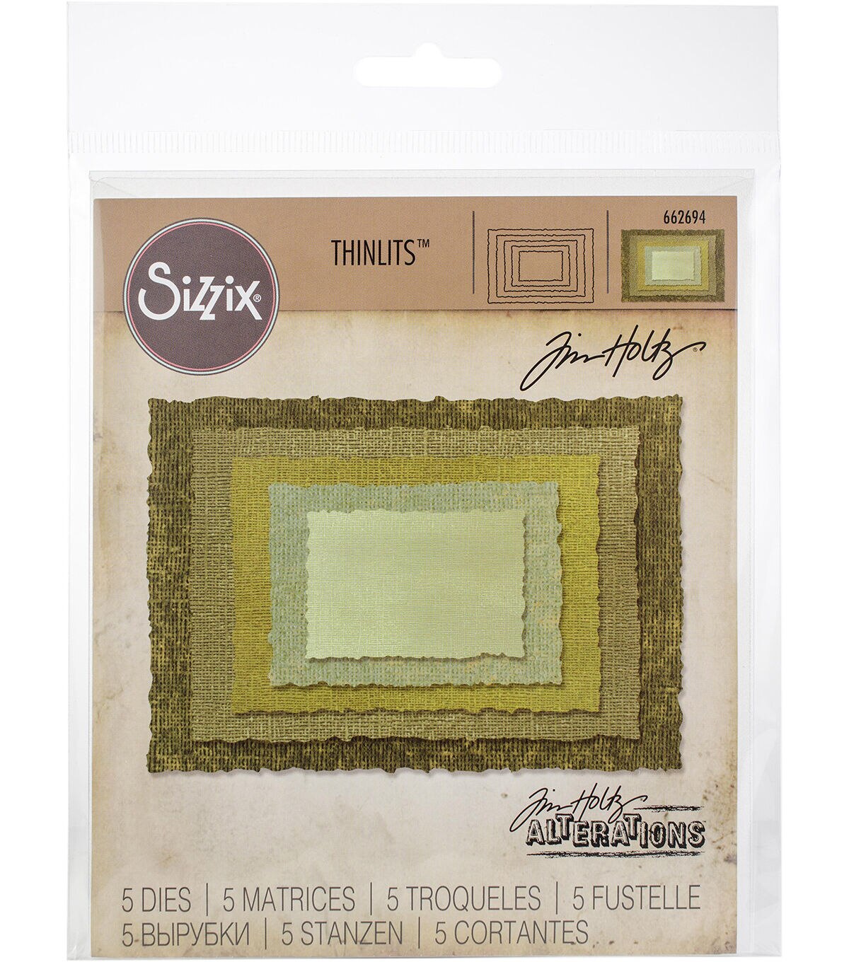 Thinlit dies offer a variety of affordable solo options or multi die options. Thinlits are easy to use and are compact and portable. Compatible with most die-cutting machines (not included). This package contains five dies. Design: Stacked Deckle. Designer: Tim Holtz. Approximate die-cut sizes: between 2x1.375 inches and 5x3.5 inches. Imported.
