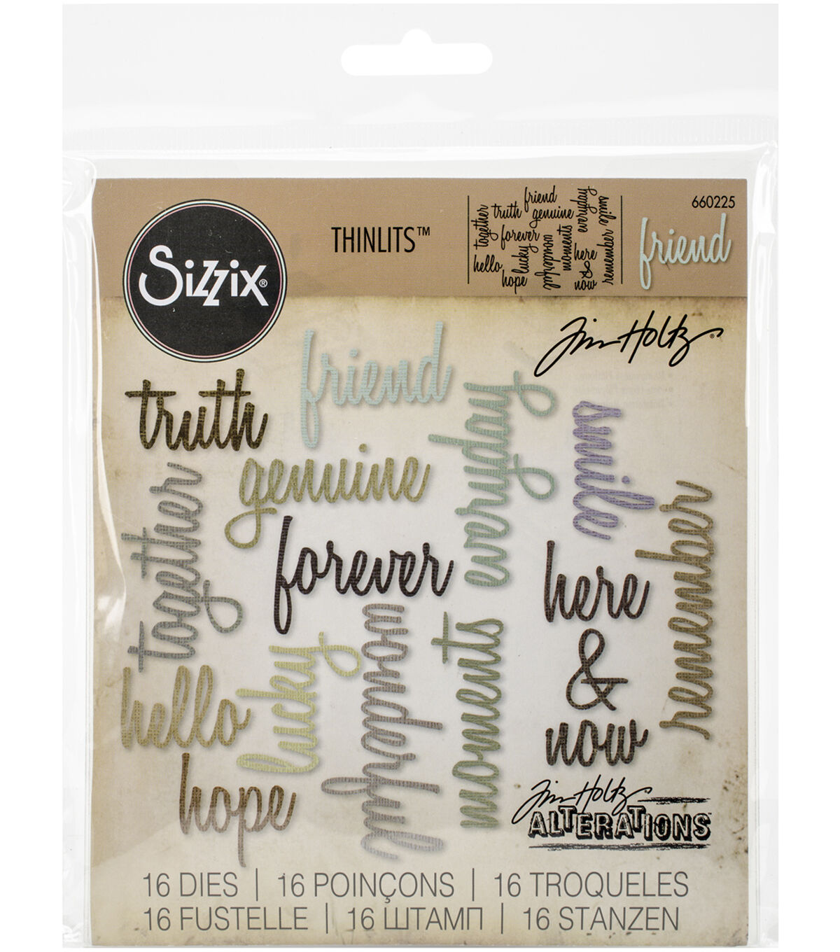 Sizzix-Thinlits Dies. Thinlit dies offer a variety of affordable solo options or multi die options. Thinlits are easy to use and are compact and portable. These dies are compatible with Sizzix BIGkick BigShot Vagabond and Big Shot Pro. This package contains sixteen dies. Design: Friendship Script Words (measuring between 1x3/4 inches and 1x3-1/8 inches). Designer: Tim Holtz. Imported.