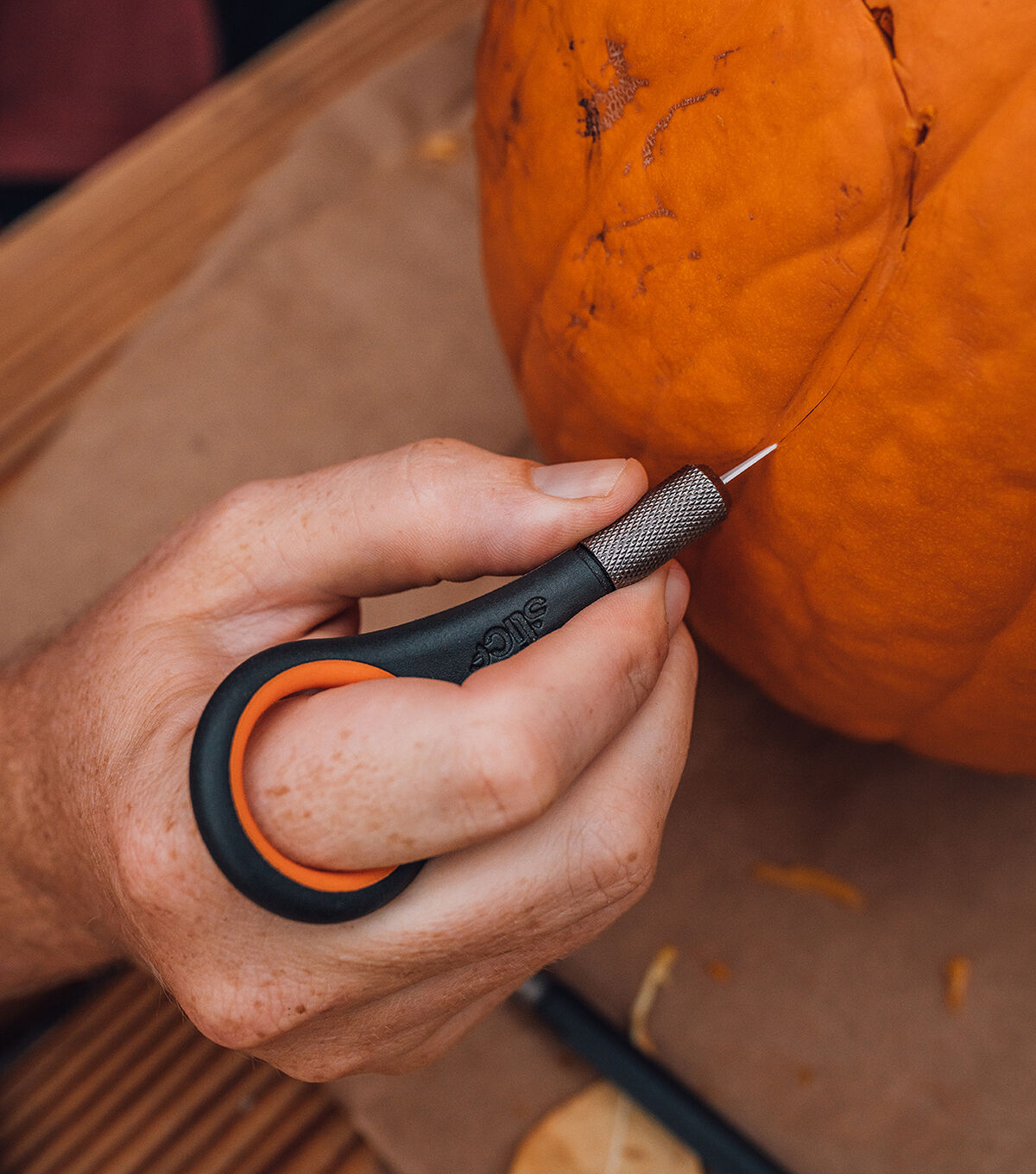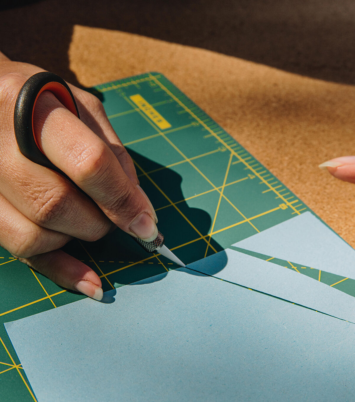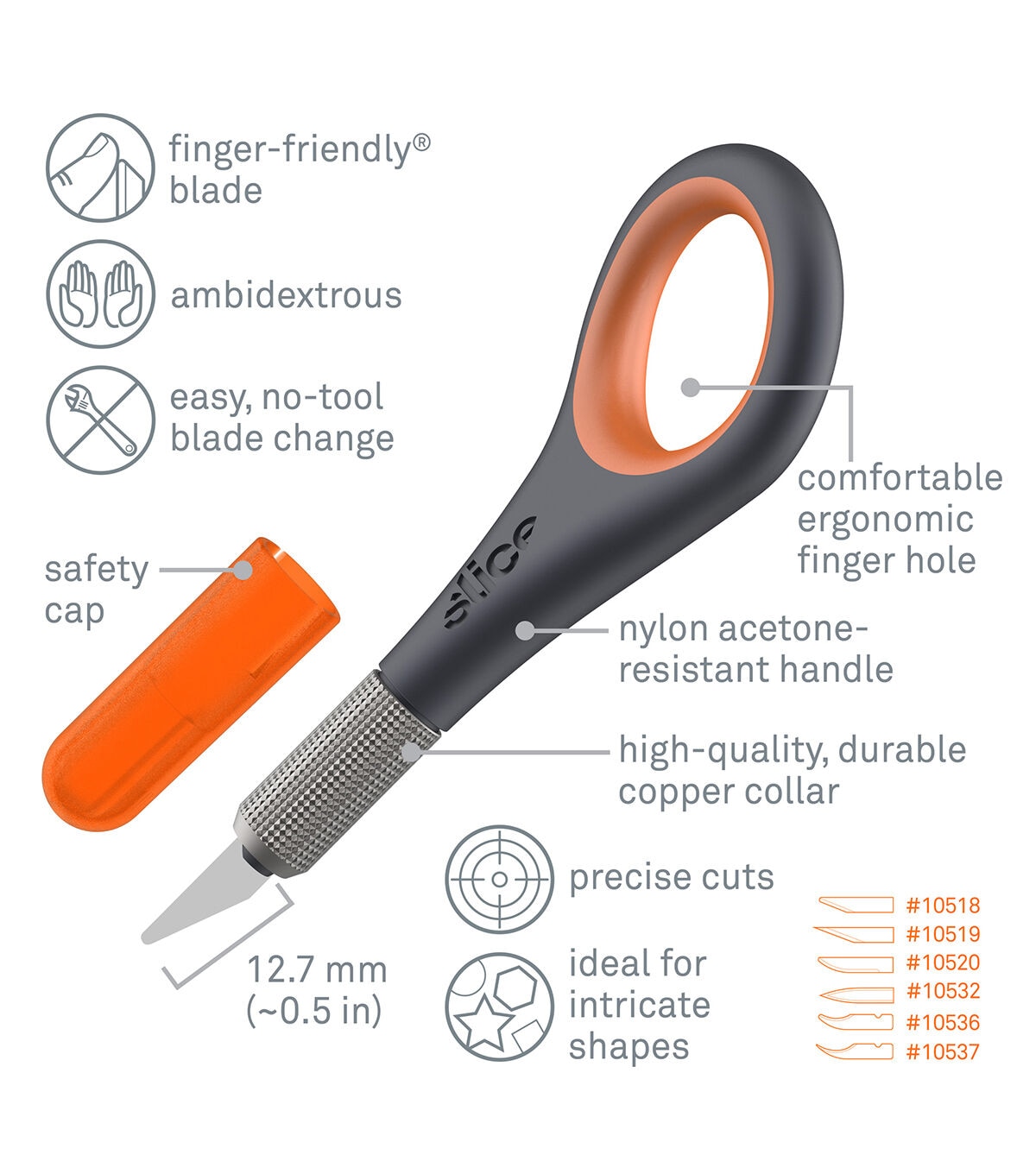 The Slice Precision Knife makes cutting intricate shapes easier, safer and more comfortable. The tool has an innovative soft and angled finger hole optimized for comfort and steadiness and a cross-hatched grip handle, allowing complete control over your work. The knife’s blade is finger friendly, and a safety cap provides additional safeguarding.Suitable for left- and right-handed users and the finger hole also means it hangs for easy storage. Great for cutting intricate shapes and precise cuts, mylar stenciling, slicing plastics and decals, trimming photos and art.