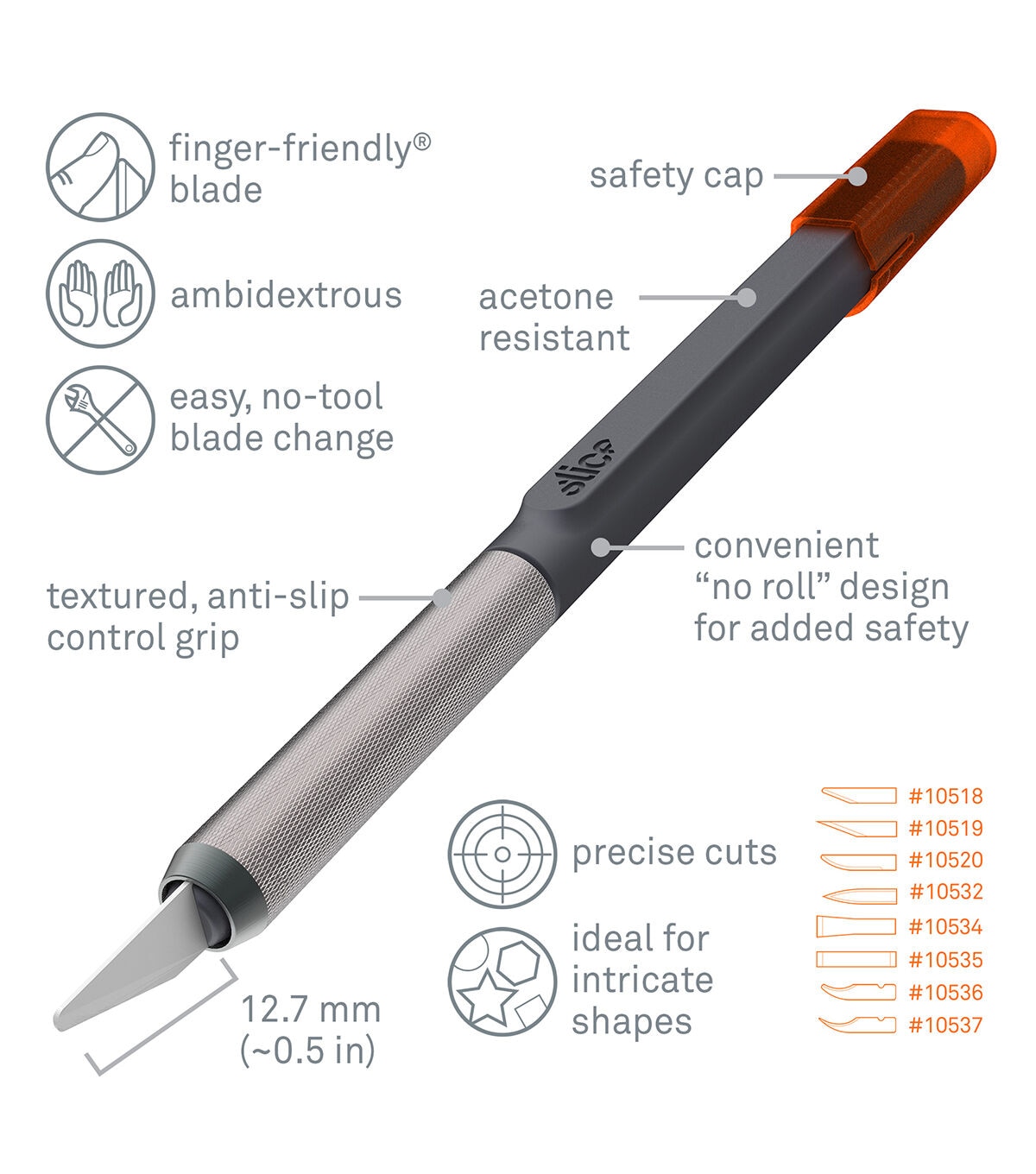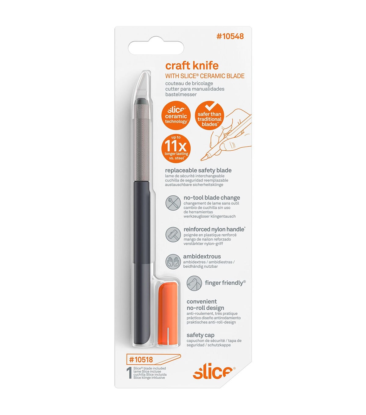 The Slice Craft Knife gives you safety and control: the perfect tool for precision cutting with lower risk of injury. Its unique finger-friendly blade is safe to the touch and therefore causes fewer and less severe injuries than traditional blades. Additionally, the safety cap covers the blade when not in use and it's no-roll design keeps it from rolling on your work surface. The tool is comfortable and easy to hold (for both left- and right-handed users) due to its textured grip and weighted handle, giving you complete control over your tasks and making it ideal for cutting intricate shapes. Great for fine detail in colored pencil and scratchboard art, ceramic art, paper crafting, cutting craft materials such as foam and construction paper.