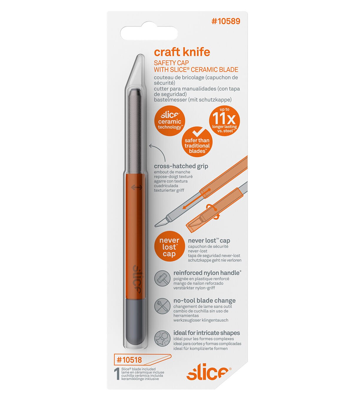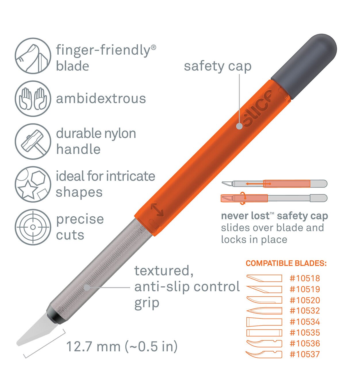 The Slice Craft Knife With Safety Cap gives you precision and protection: the perfect tool for all your craft needs. It has a textured anti-slip grip for maximum control, making it ideal for intricate shapes. The tool’s finger-friendly blade is safe to the touch, and the safety cap can never be lost as it's attached to the handle. Suitable for left- and right-handed users, this craft knife is compatible with multiple Slice blade options – so it’s highly versatile. Great for cutting craft materials, fine detail work in colored and scratch art, precision cutting and cutting intricate shapes.