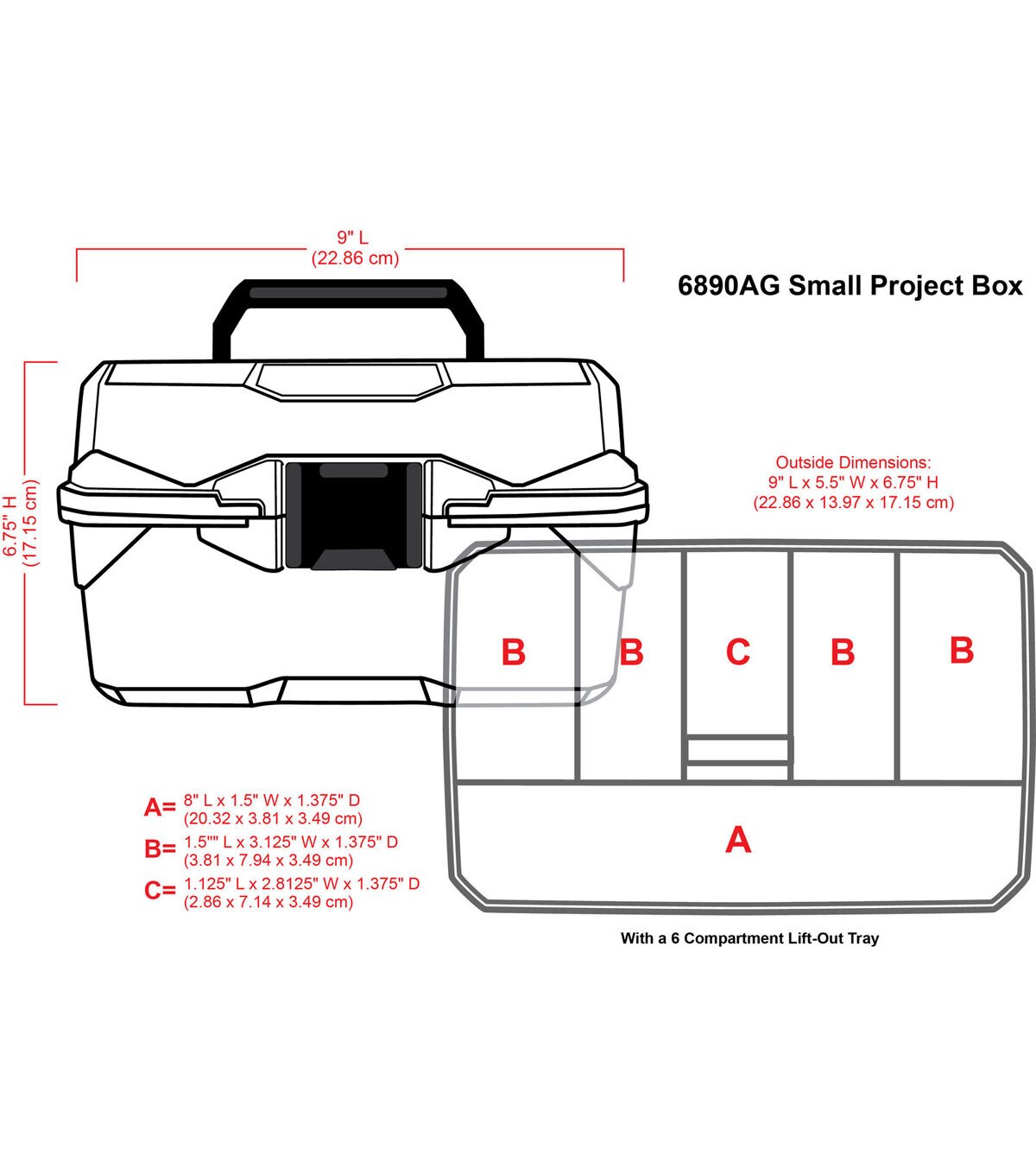 - Small Project Box dimensions 9 L x 5. 75 W x 5. 5 H. Lift out tray included