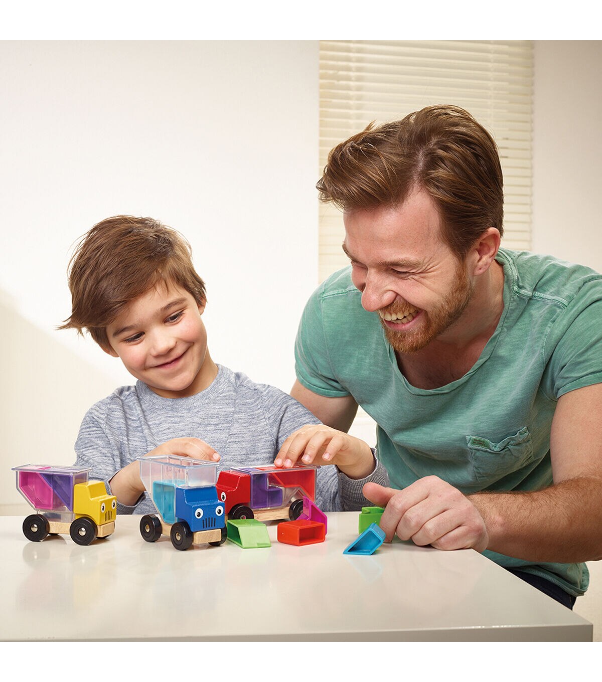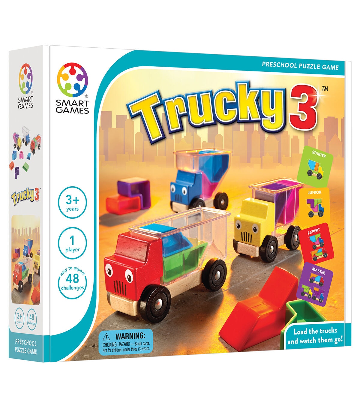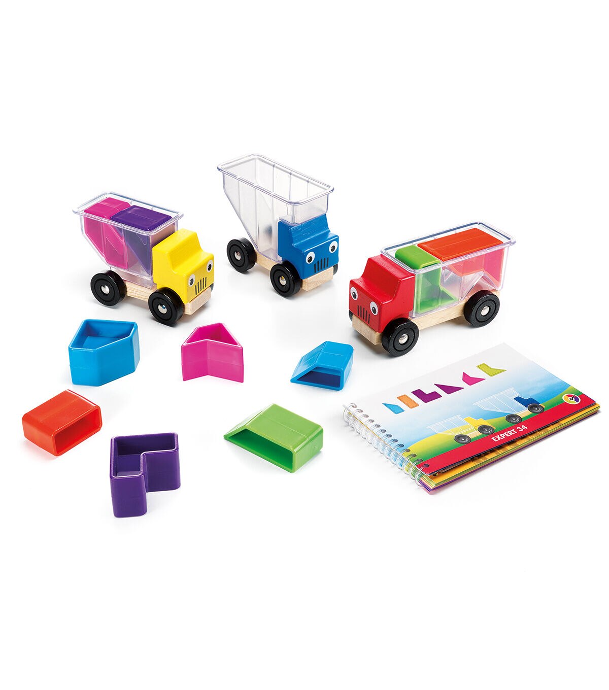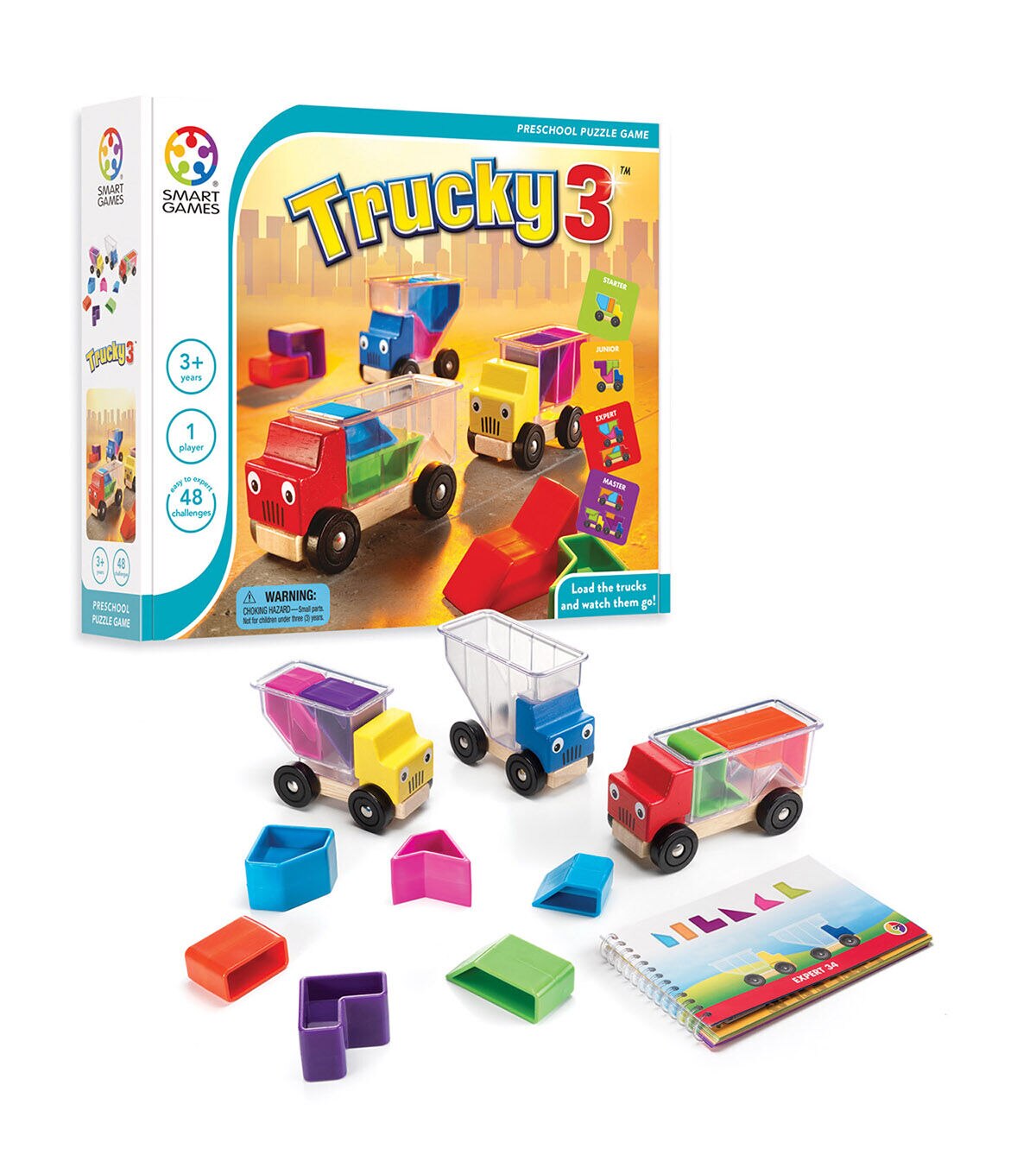 Truckloads of puzzle fun! Three happy trucks are on the way to their next destination. They need to pick up a load of packages, but will the haul fit? Can you help them stack everything properly? Toddlers initially play with the trucks, loading them up and driving them round like a toy car. Kids who are a bit older can play the game, working through the challenges that gradually get more and more difficult. Booklets with 48 challenges. For kids ages 3 - 8. First a toy . . . then a game! Dimensions: 24 x 6,2 x 24 cm (LxWxH). Contents: 3 wooden trucks with transparent containers, 10 colorful plastic blocks, booklet with challenges and solutions.