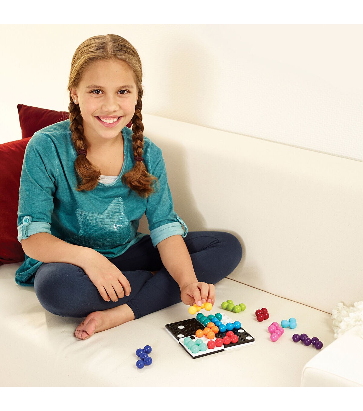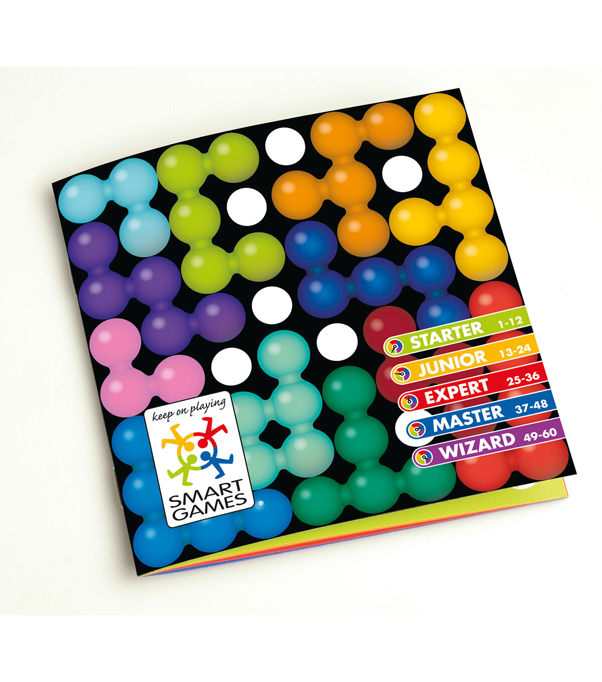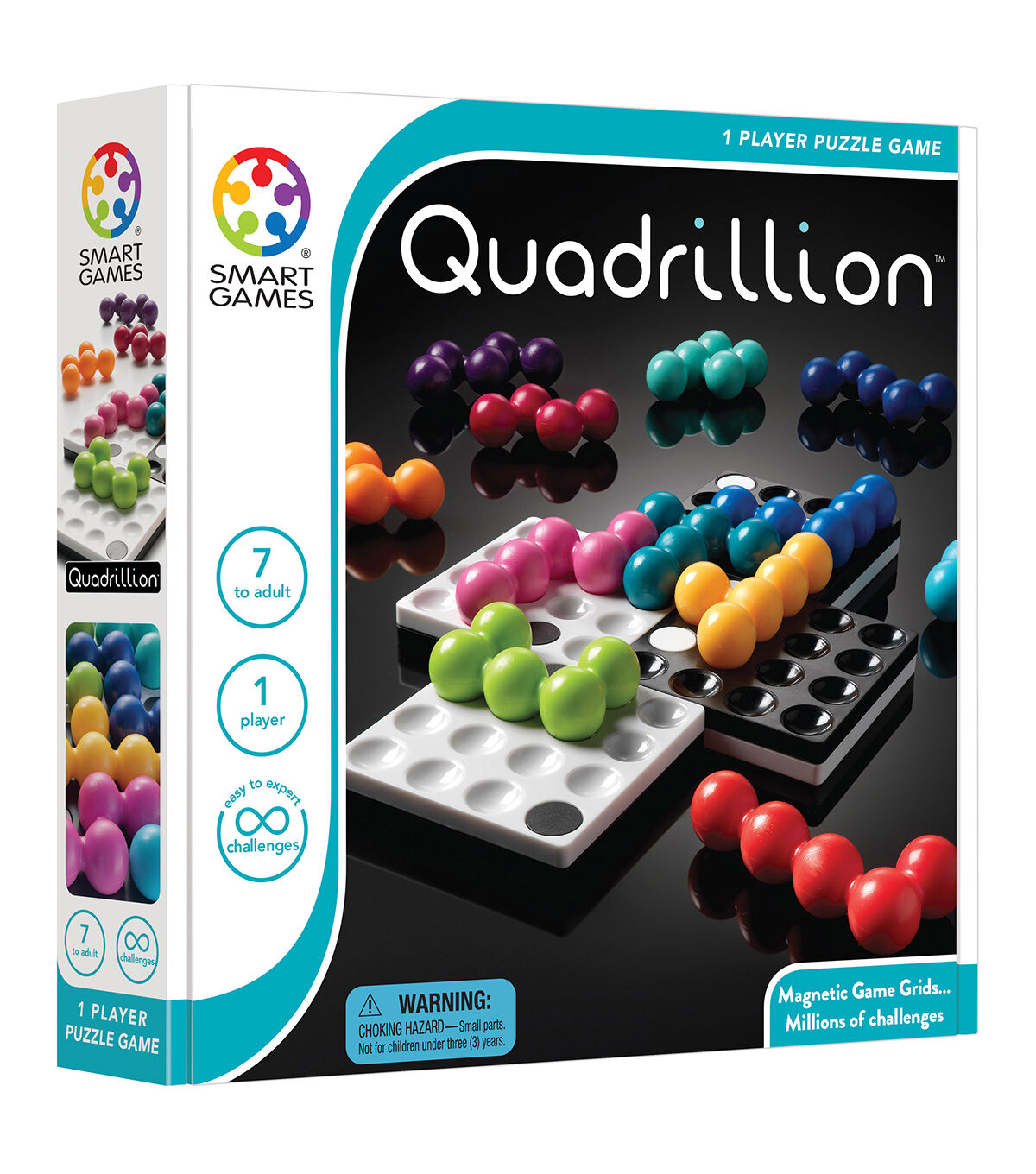 The SmartGames Quadrillion Puzzle Game offers a fun, unique twist on puzzle games. Start a new challenge in a snap, with no direction required. Just place the four magnetic grids together and start playing. Quadrillion is the ultimate solitaire game for all ages, with big, sturdy puzzle pieces that are easy and fun to handle. It offers a booklet with 80 DIY challenges and solutions to get you started. This kit also includes four black and white magnetic grids and 12 colorful puzzle pieces.