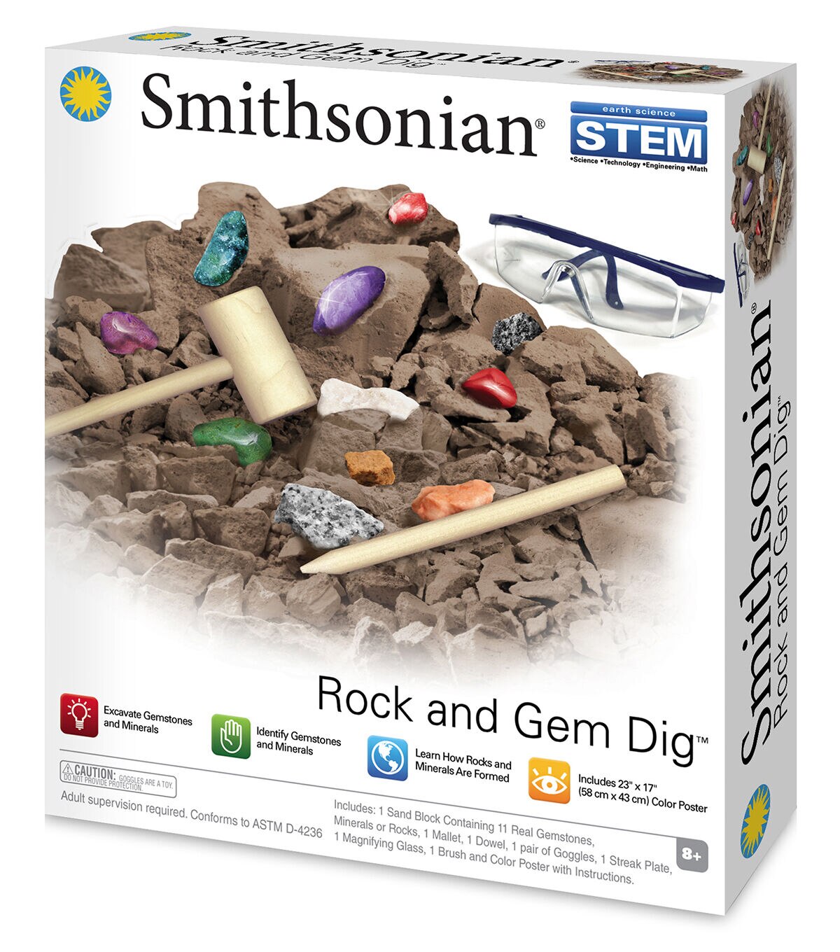 Smithsonian Rock & Gem Dig includes: 1 Sand Block Containing 11 Real Gemstones, Minerals or Rocks,1 Mallet, 1 Dowel, 1 Pair of Goggles, 1 Streak Plate, 1 Magnifying Glass, 1 Pouch and Color Poster with Instructions.