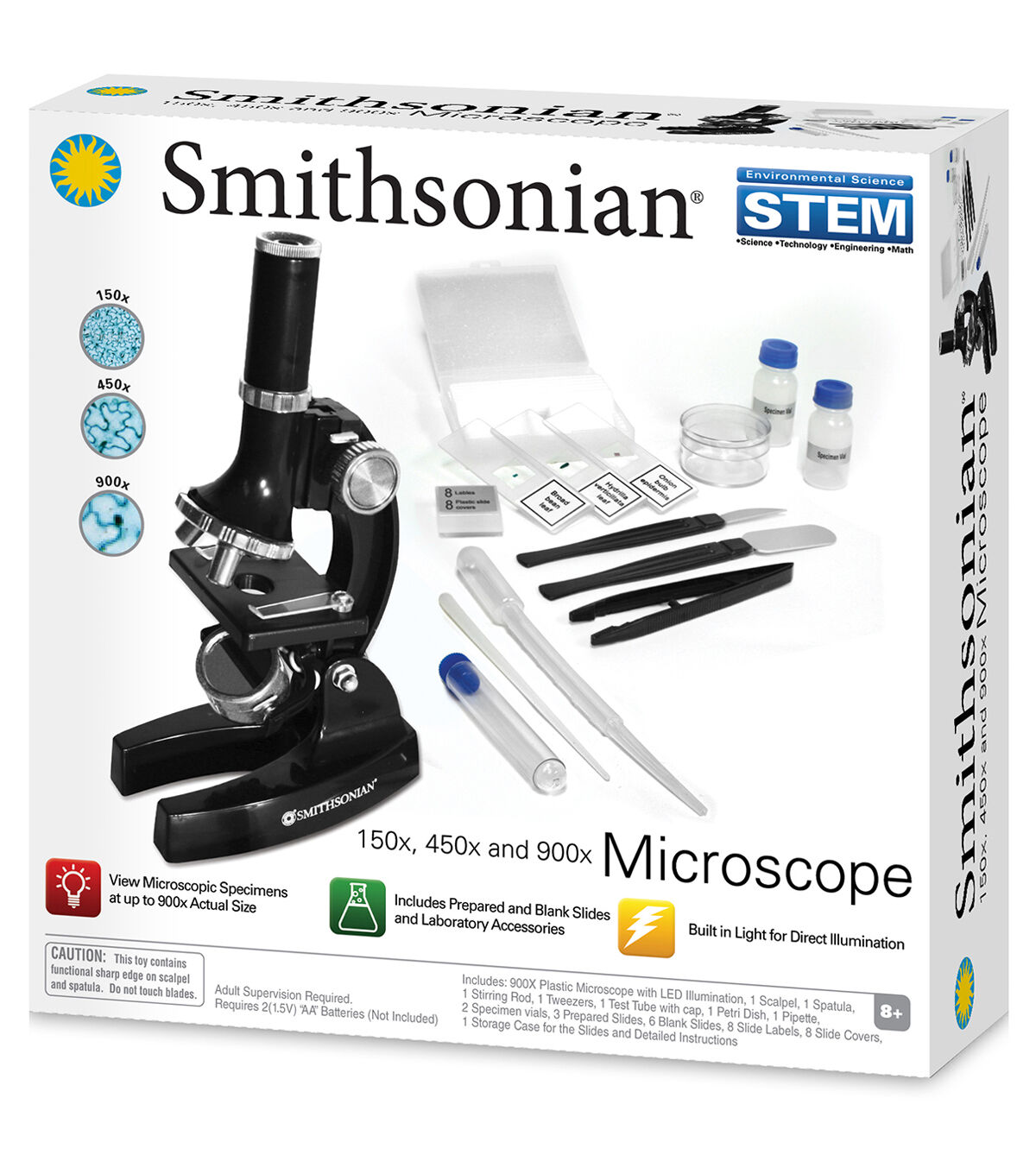 The Smithsonian STEM Microscope Kit helps young doctors reach their aspirations. This Smithsonian 150x, 450x, 900x microscope includes 900x plastic microscope with LED illumination, one scalpel, one spatula, one stirring rod, one pair of tweezers, one test tube with cap, one petri dish, one pipette, two specimen vials, three prepared slides, six blank slides, eight slide labels, eight slide covers, one storage case for the slides and detailed instructions. The kit includes STEM educational content and requires two AA batteries, not included. It features built-in light for direct illumination. View microscopic specimens at up to 900x actual size with this microscope.