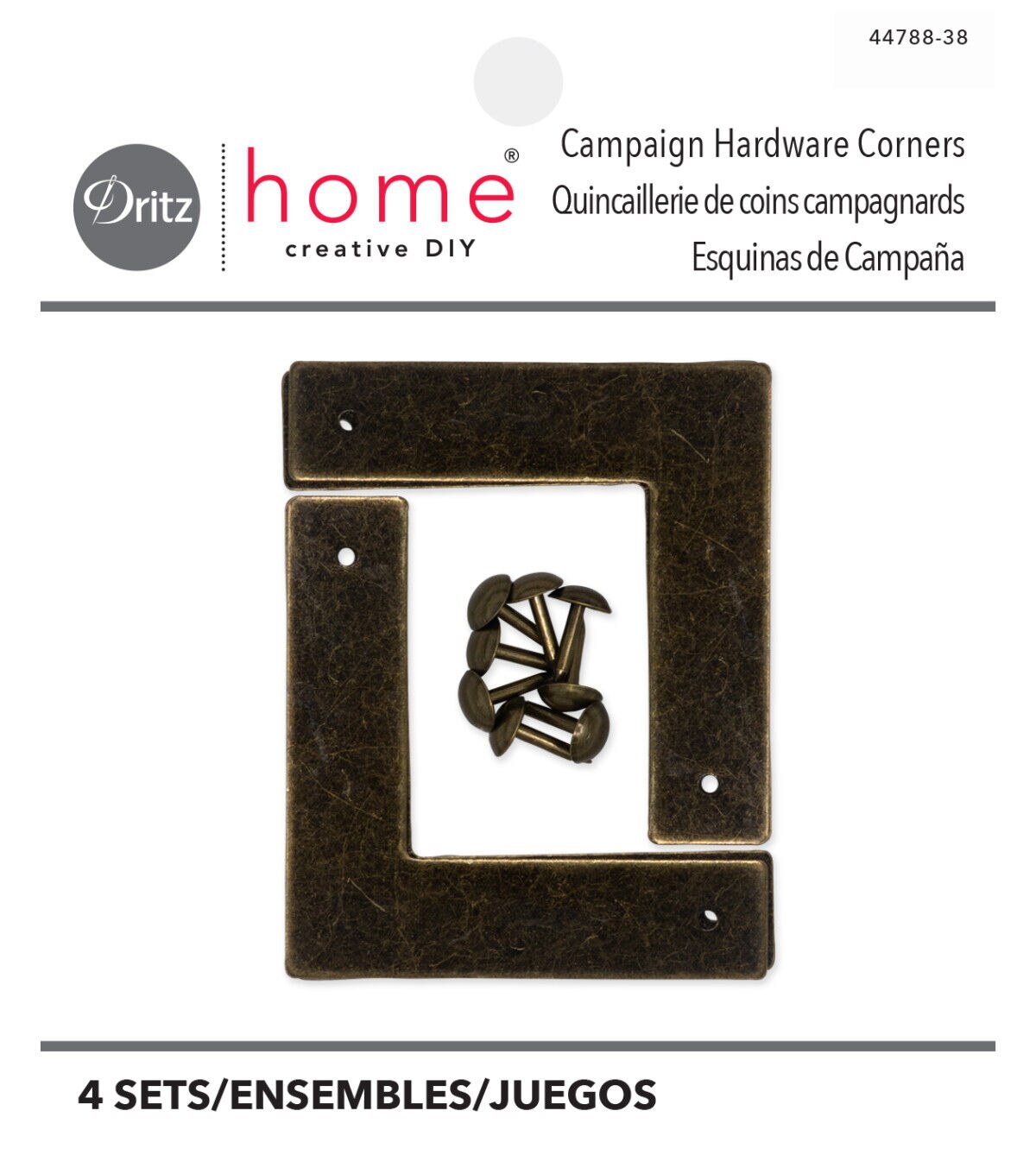 The Dritz Home Small Smooth Campaign Hardware Corner Sets - Antique Brass provide a quick and easy way to add visual interest to your next DIY home project. This pack includes three sets of hardware corners. You can apply them to any furniture with a straight edge, wood boxes, picture frames, doors, shelving and more. Mix and match hardware shapes, sizes and textures to create a uniquely layered look.