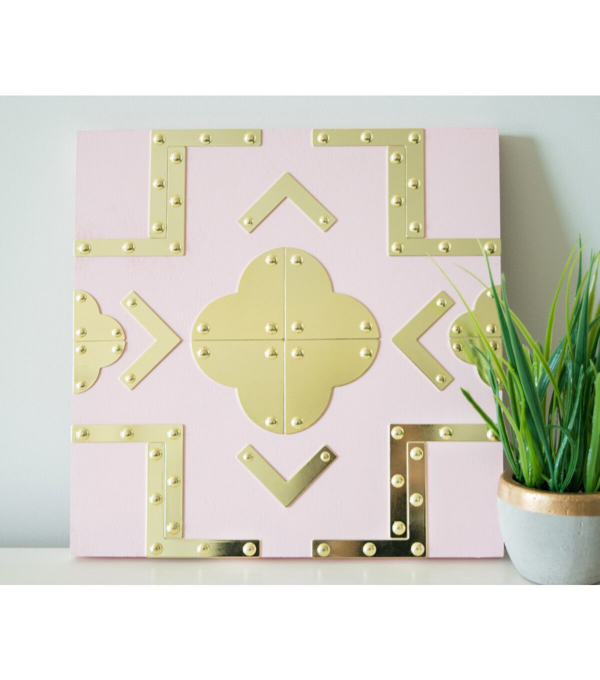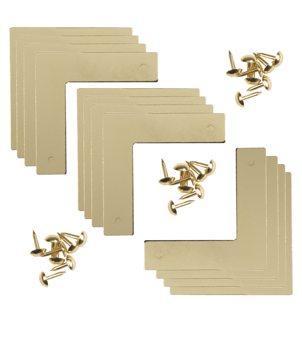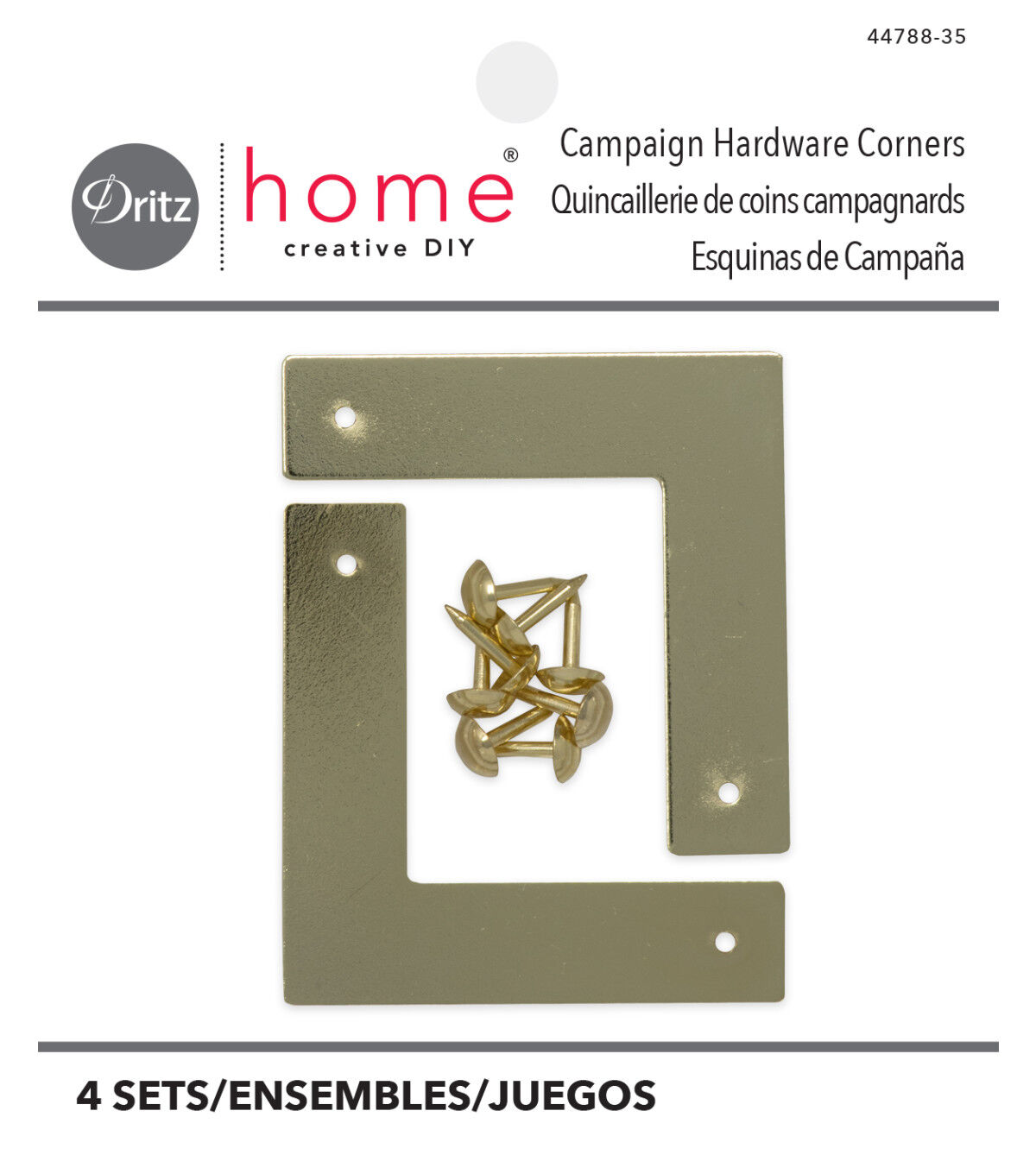 The Dritz Home Small Smooth Campaign Hardware Corner Sets - Brass provide a quick and easy way to add visual interest to your next DIY home project. This pack includes three sets of hardware corners. You can apply them to any furniture with a straight edge, wood boxes, picture frames, doors, shelving and more. Mix and match hardware shapes, sizes and textures to create a uniquely layered look.