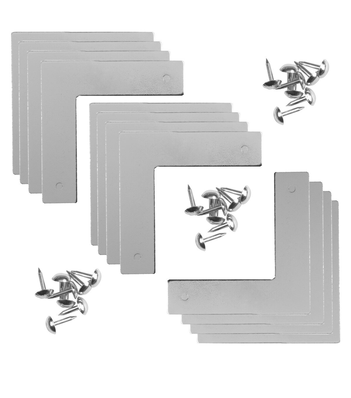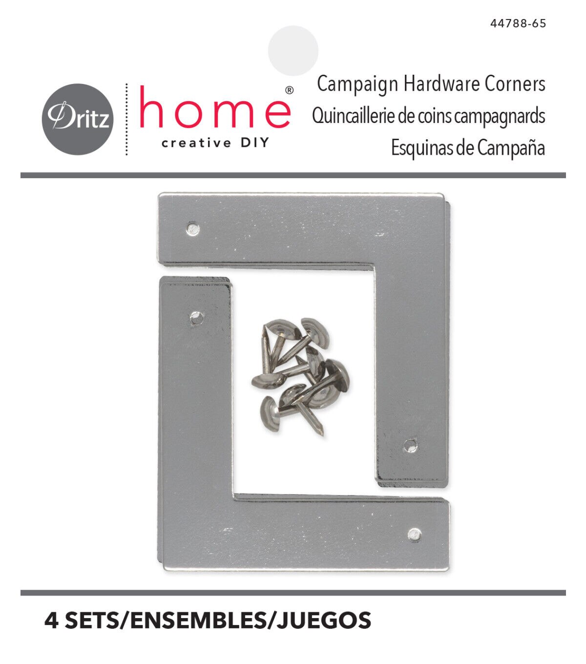 The Dritz Home Small Smooth Campaign Hardware Corner Sets - Nickel provide a quick and easy way to add visual interest to your next DIY home project. This pack includes three sets of hardware corners. You can apply them to any furniture with a straight edge, wood boxes, picture frames, doors, shelving and more. Mix and match hardware shapes, sizes and textures to create a uniquely layered look.