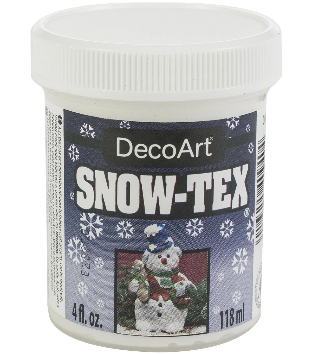 DECO ART-Snow Tex. This will give you realistic dimensional effects of snow. Just apply with a brush, sponge or knife and let it dry. This package contains a 4oz jar of snow-tex. Conforms to ASTM D 4236. Made in USA.