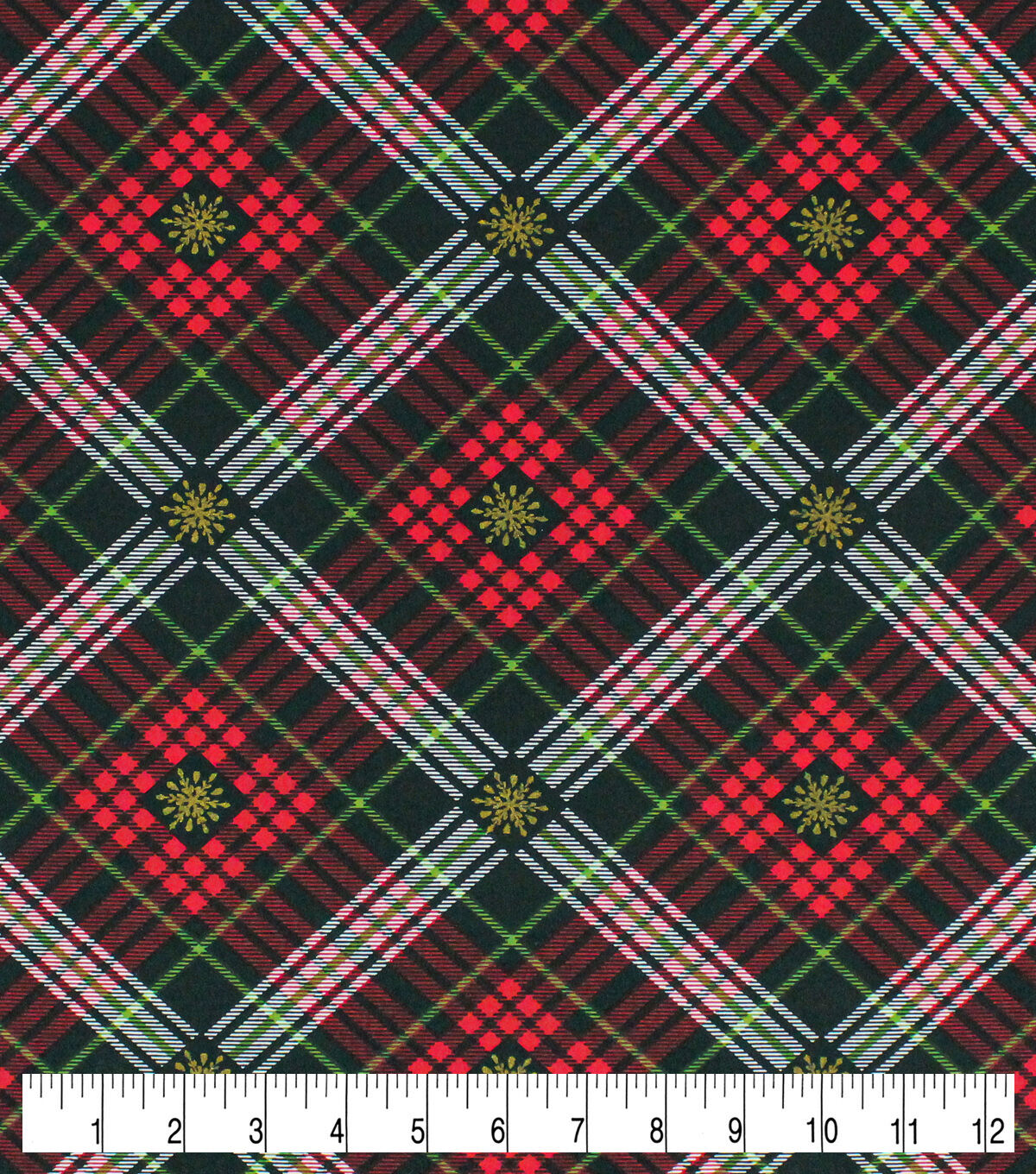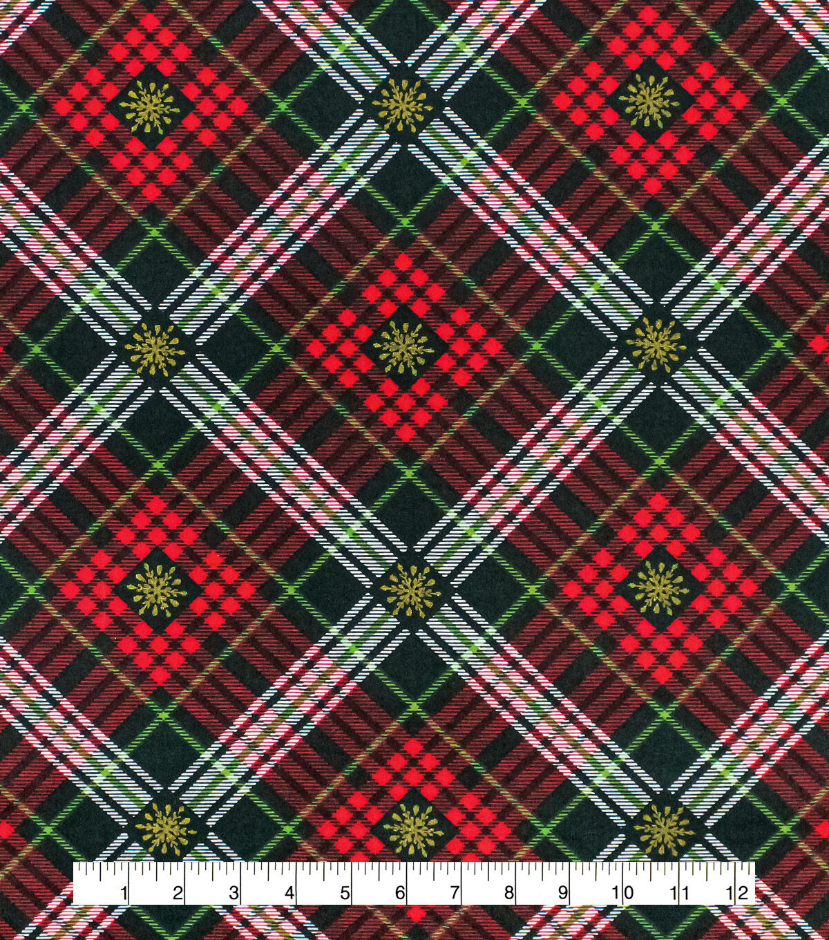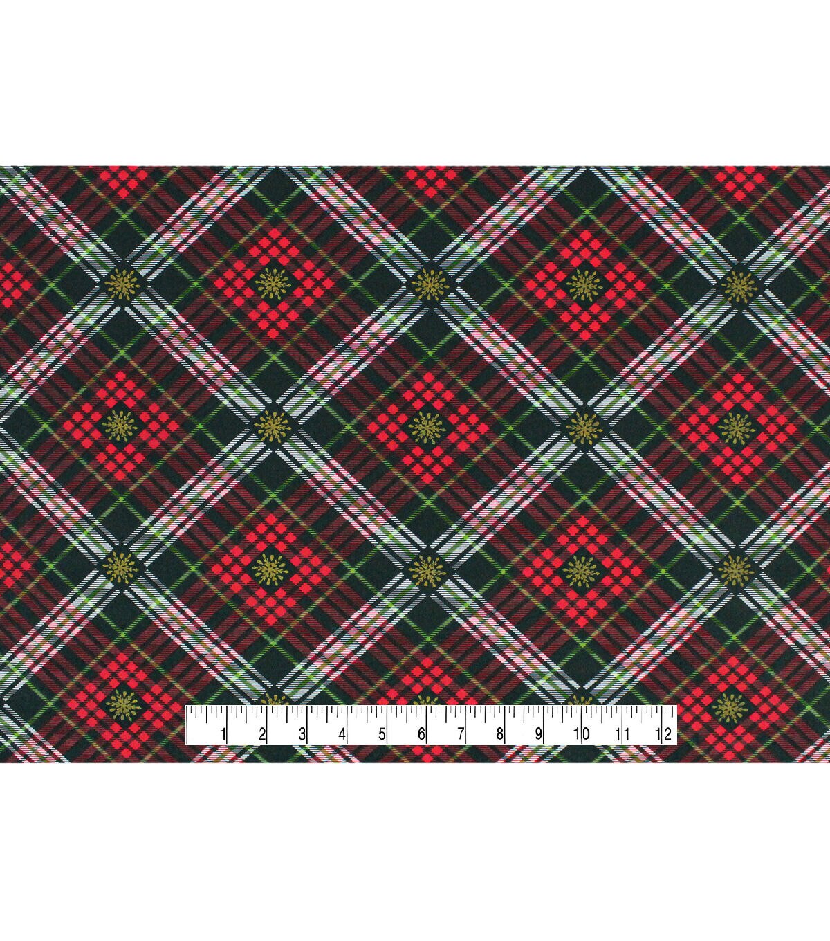 Get into the Festive Spirit with Snowflakes on Bias Plaid Christmas Metallic Cotton Fabric