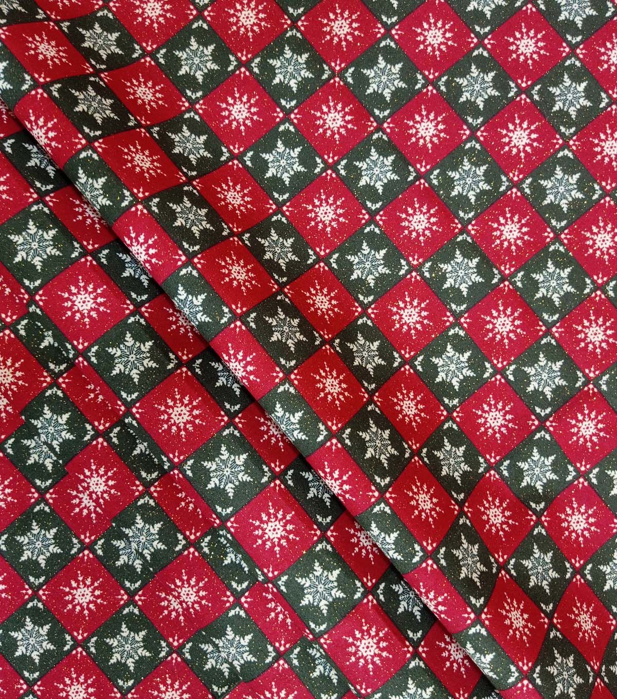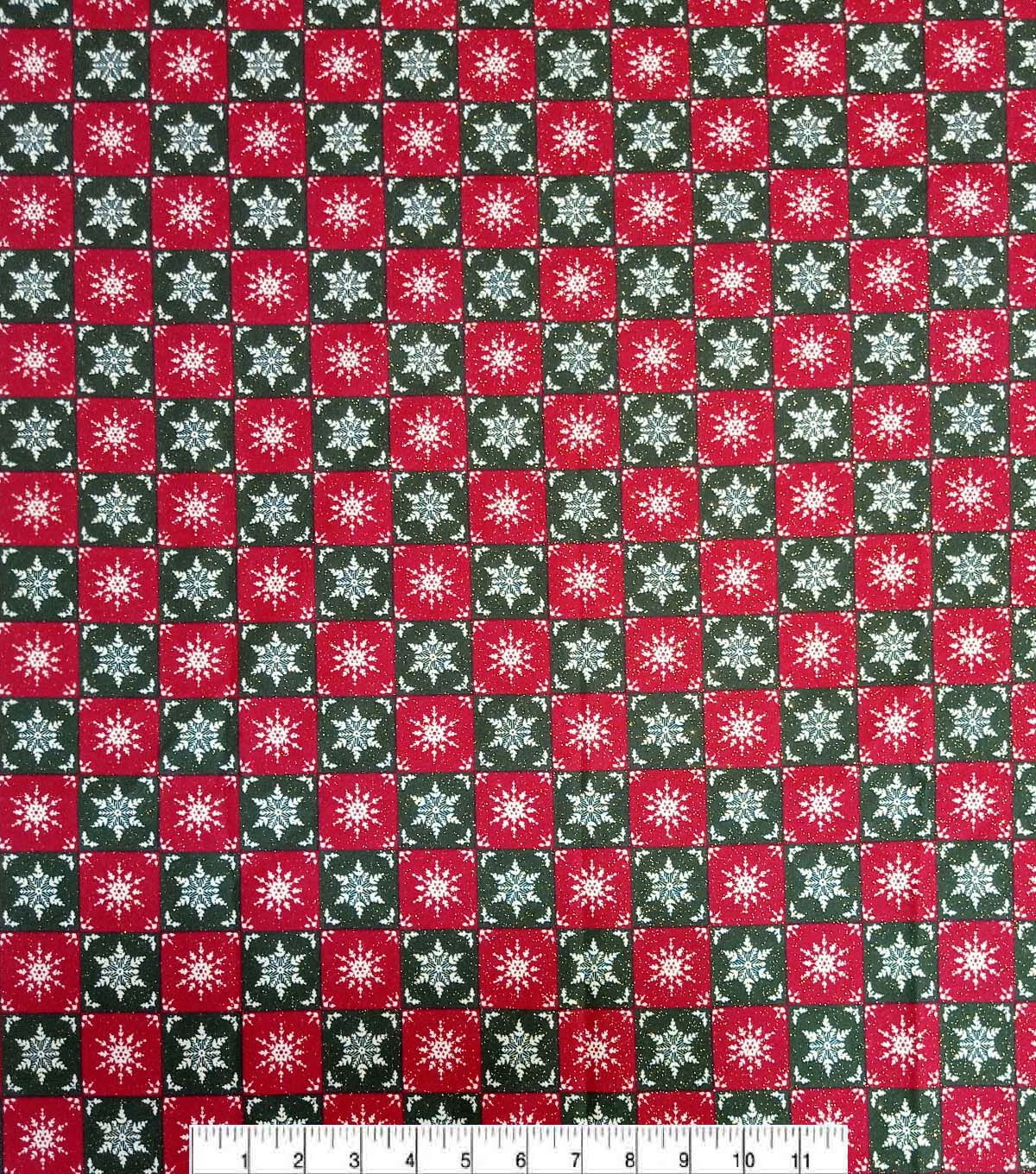 Get in the Holiday Spirit with Snowflakes on Green & Red Checks Christmas Glitter Cotton Fabric